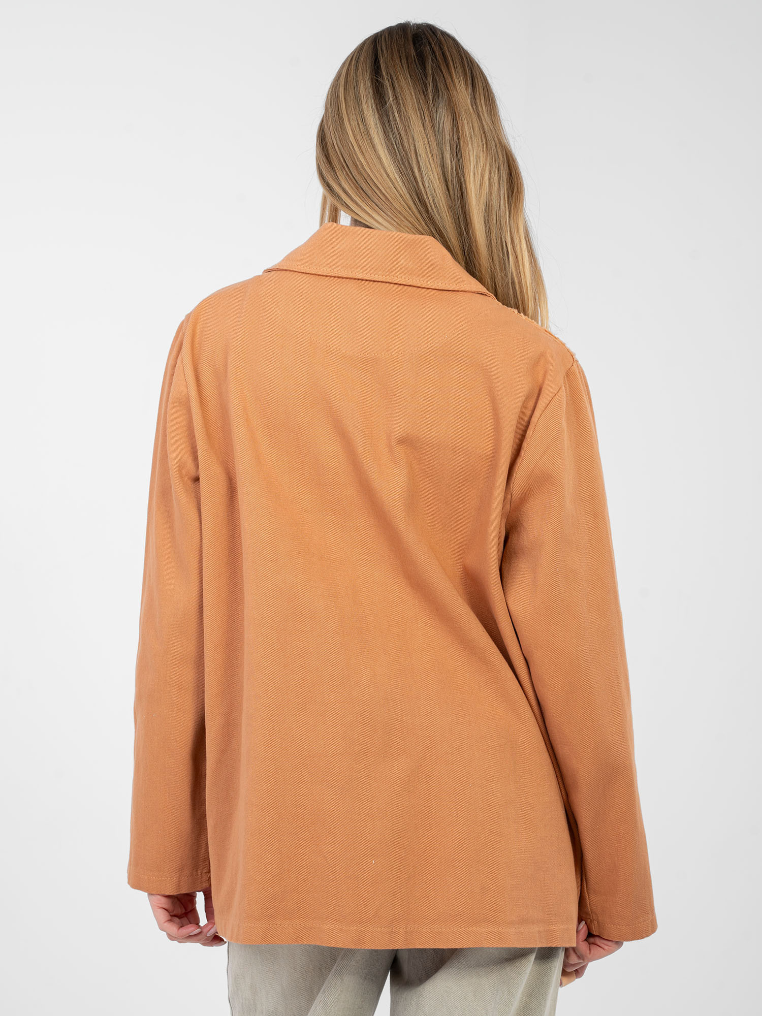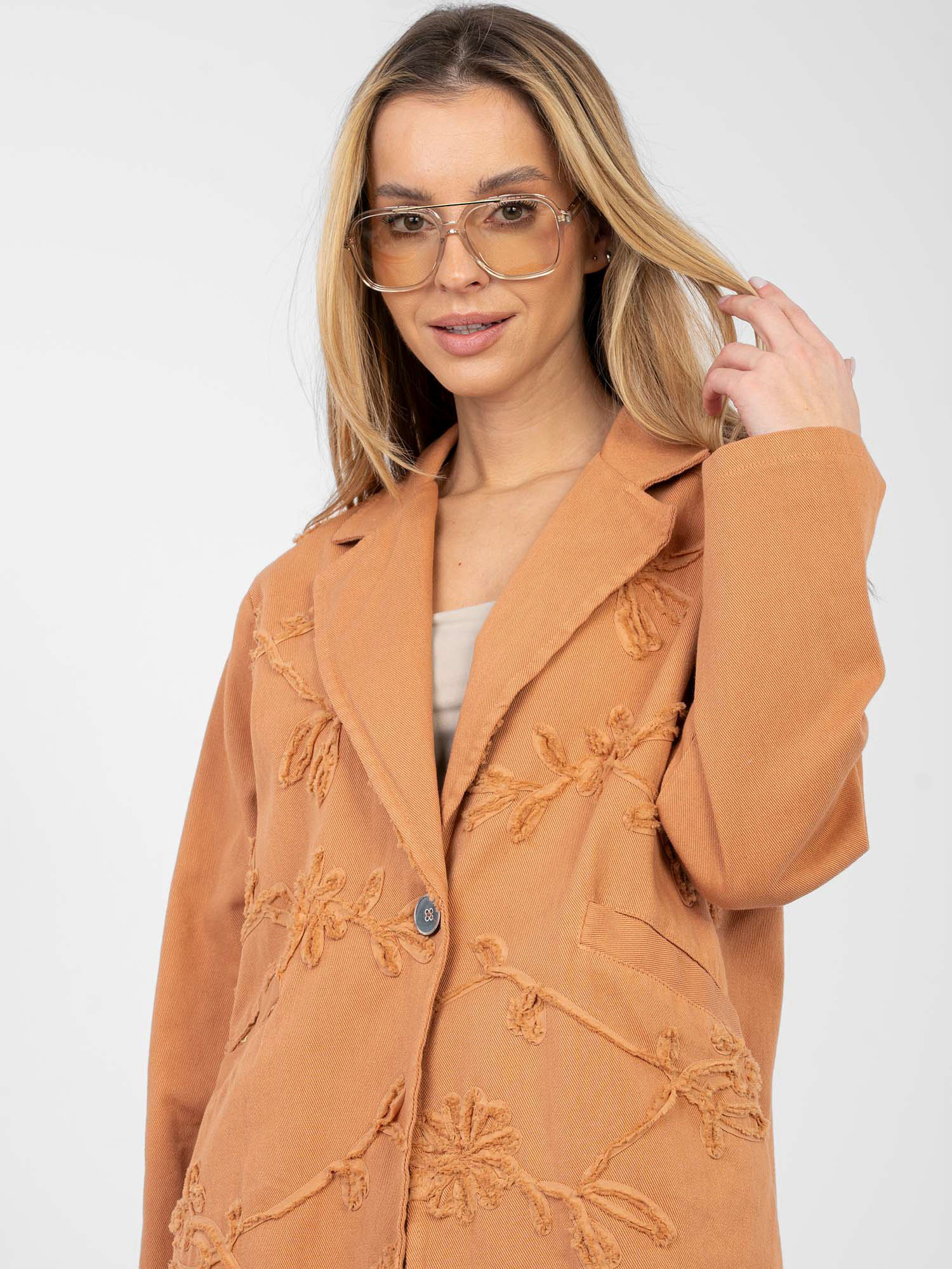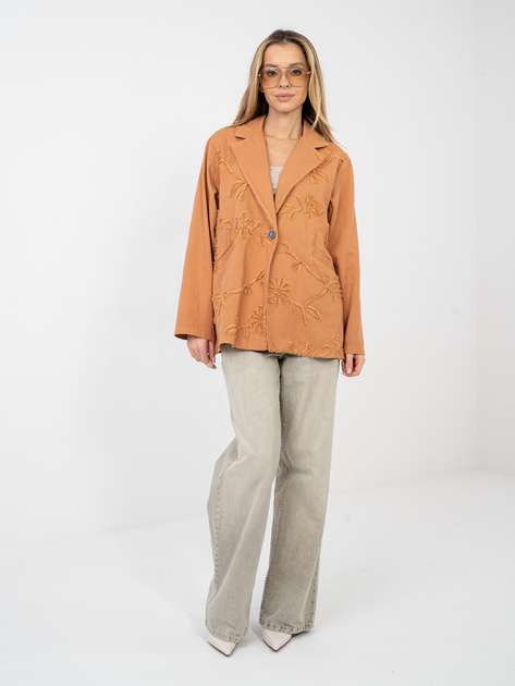 Ceglasta jeansowa marynarka z kwiatową aplikacją RUE PARIS .
