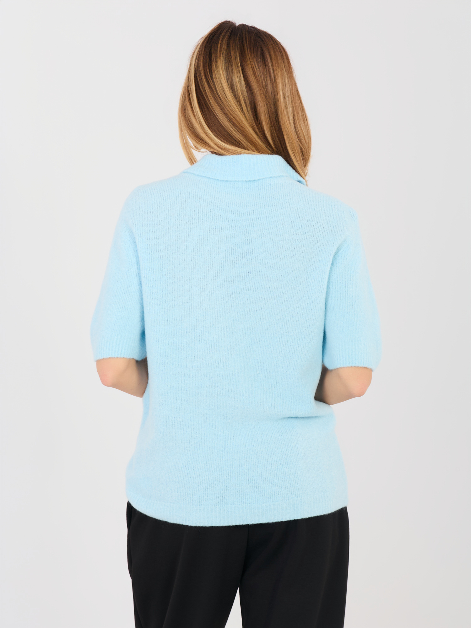 Pastelowy niebieski sweter oversize z krótkim rękawem .