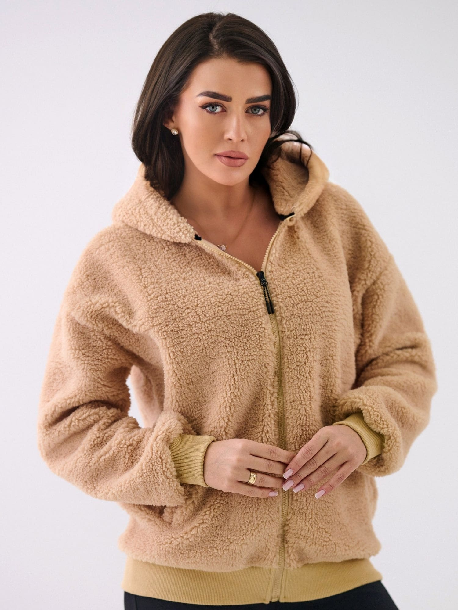 Beżowa damska bluza baranek z kapturem
