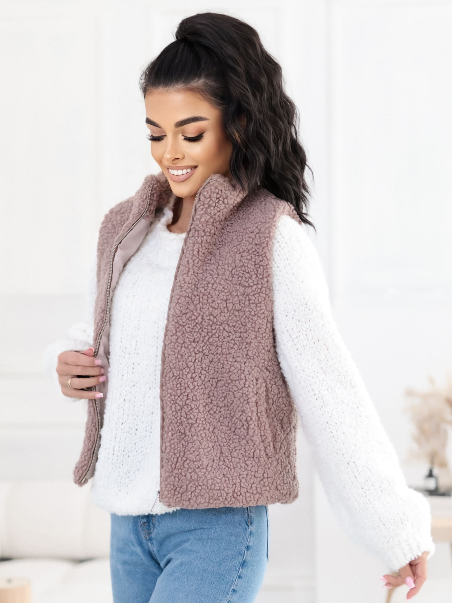Ciemnobeżowa kamizelka baranek z podszewką