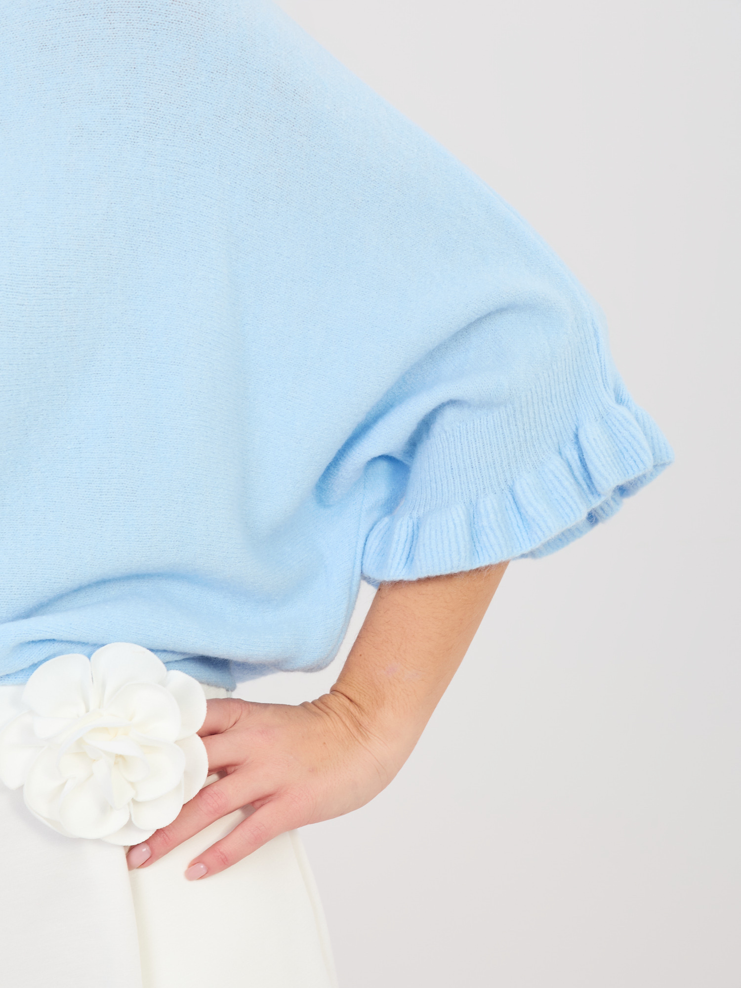 Pastelowy niebieski sweter z falbankami przy rękawach .