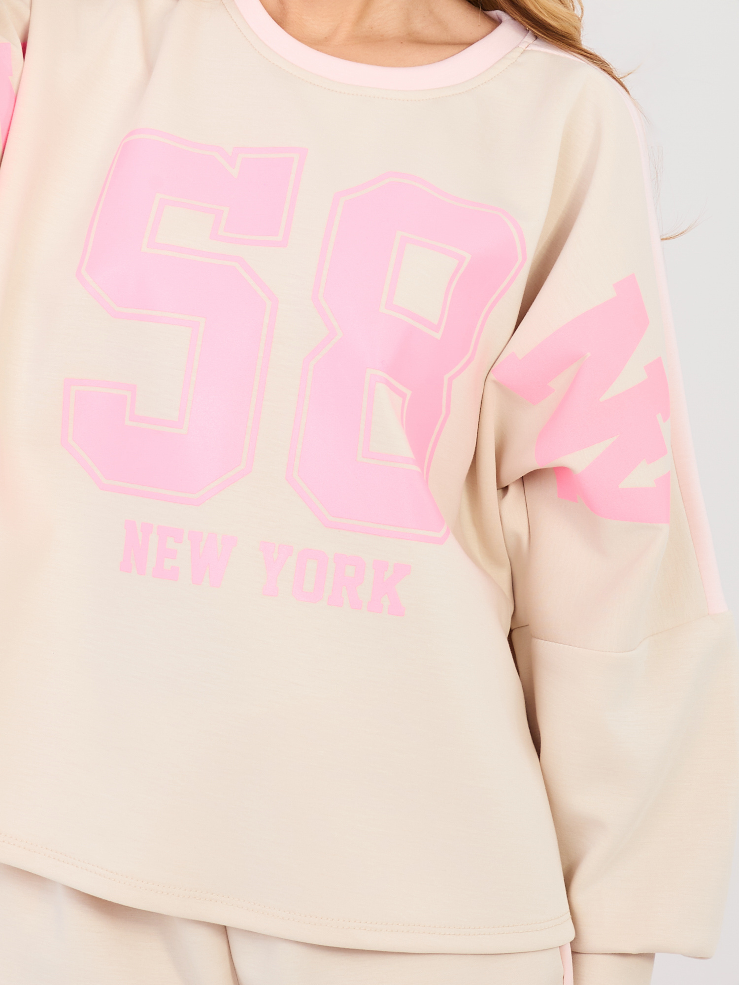 Beżowy dwuczęściowy komplet z nadrukiem RUE PARIS .
