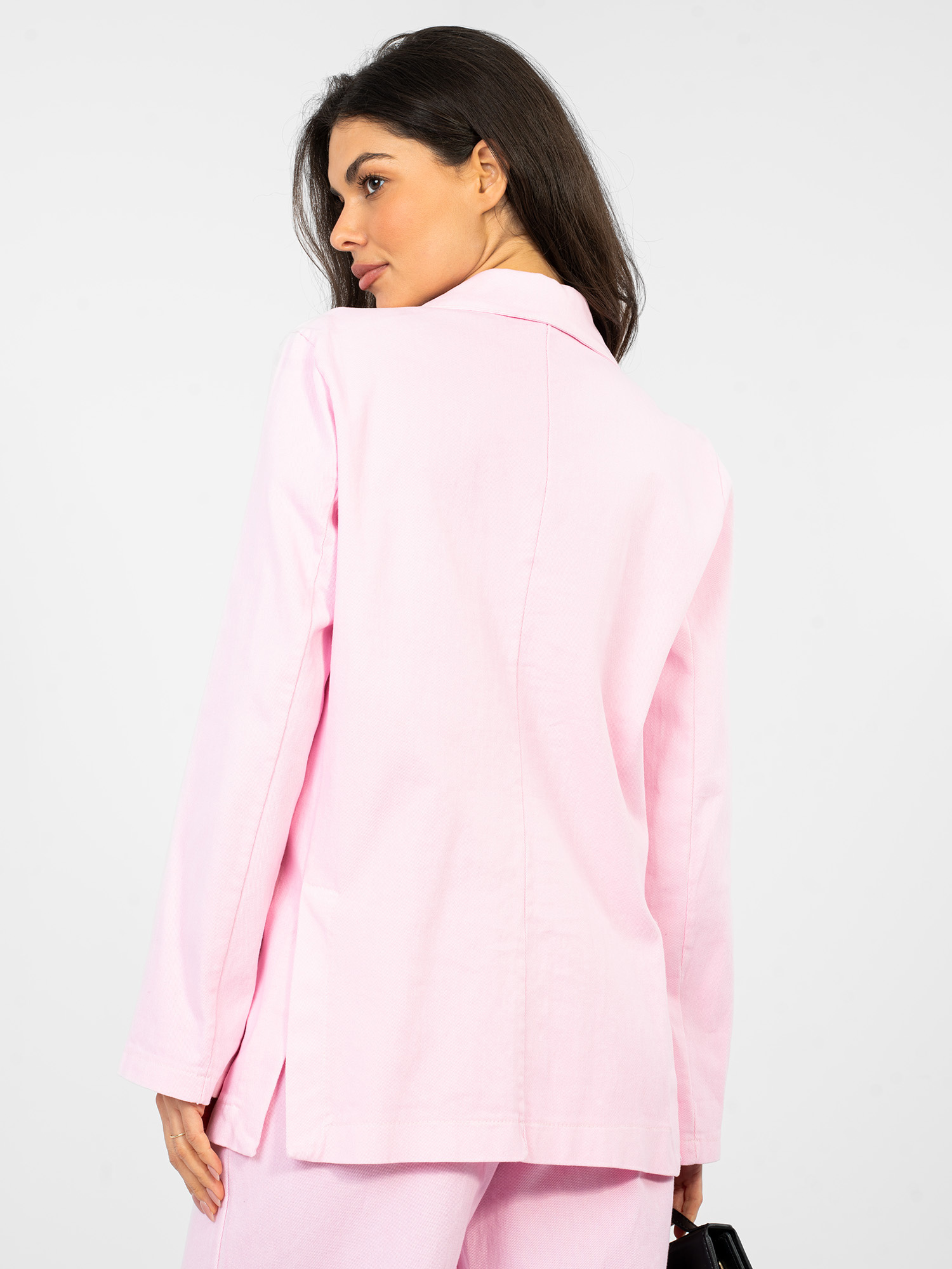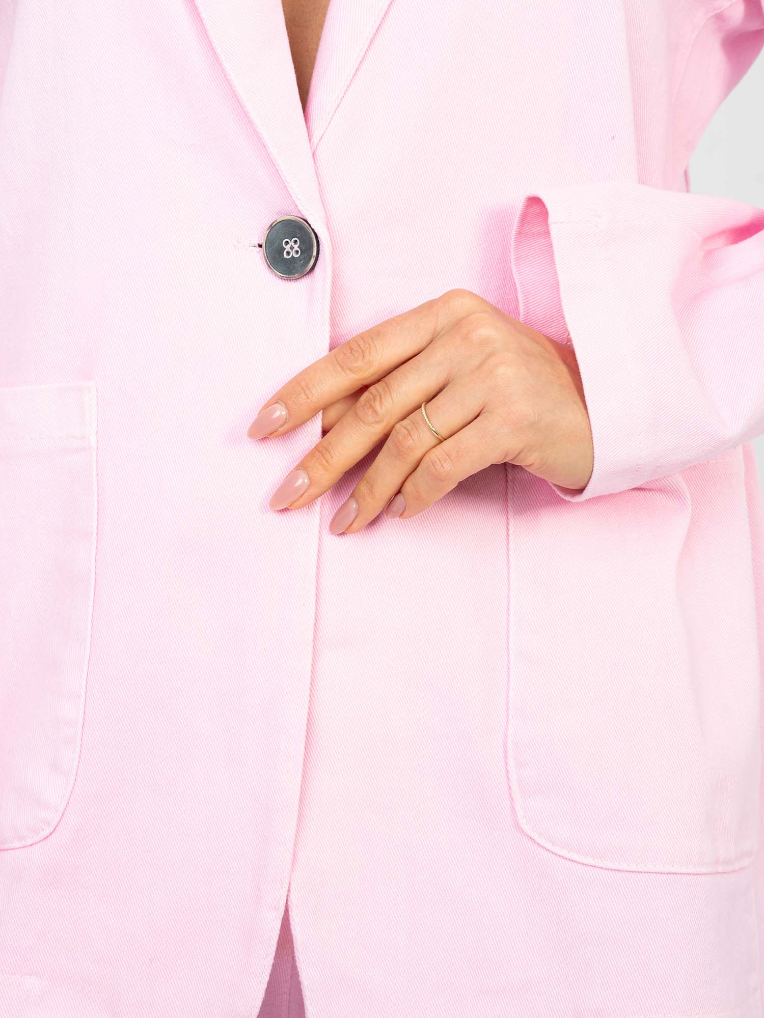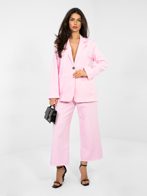 Pastelowa różowa jeansowa marynarka od kompletu RUE PARIS .