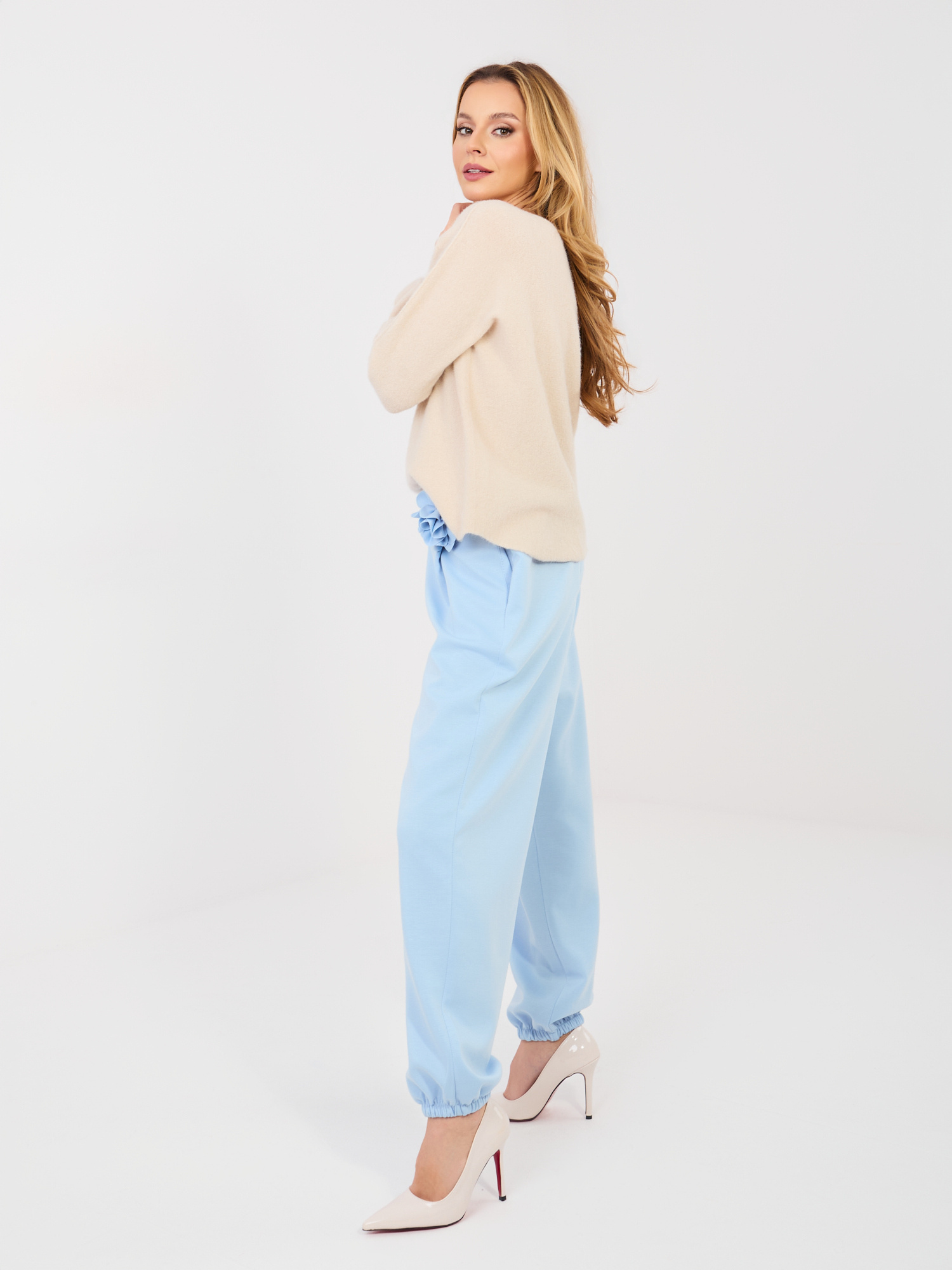 Pastelowe niebieskie dresowe spodnie ze ściągaczami .