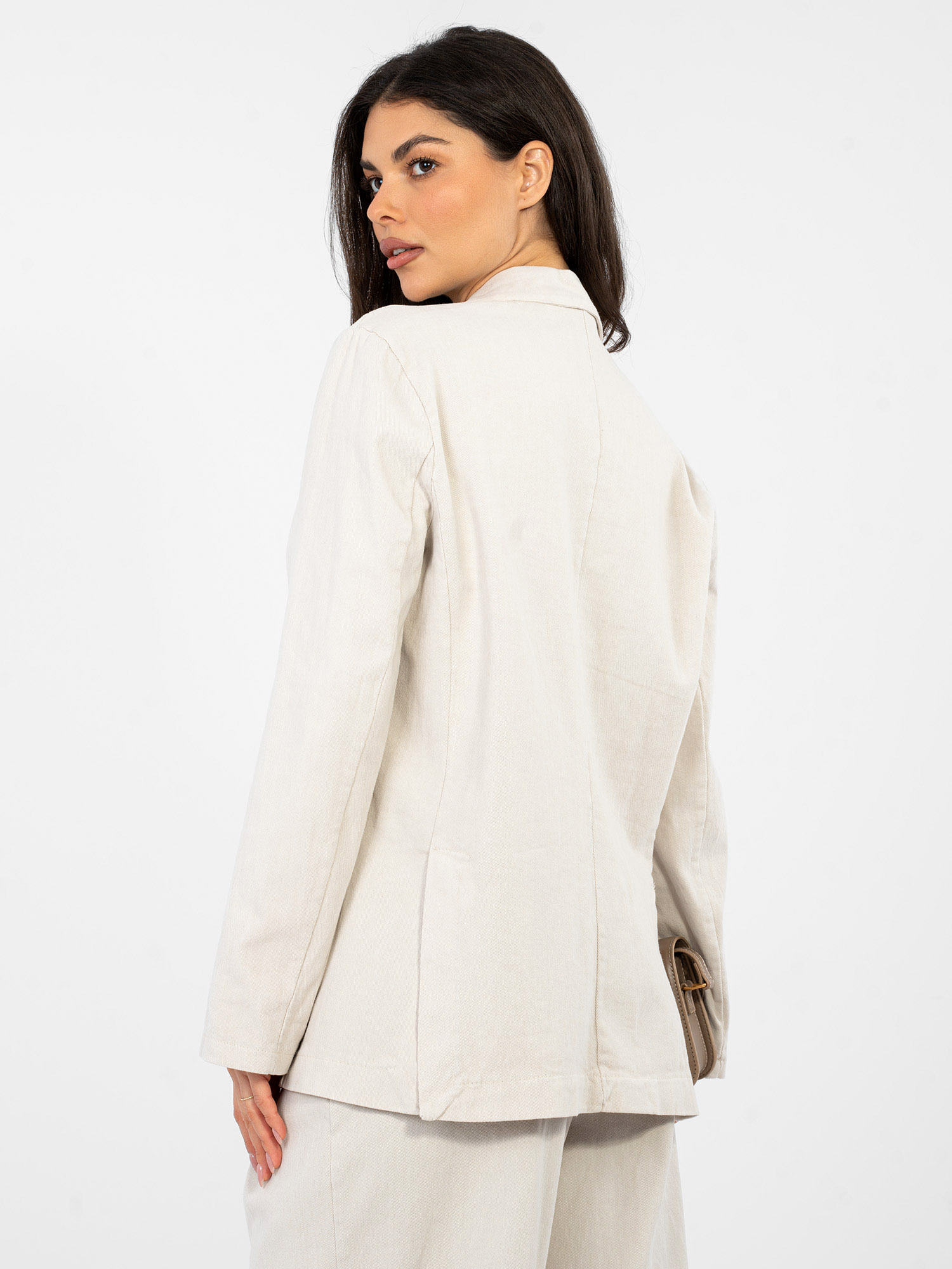 Jasnobeżowa jeansowa marynarka z zapięciem na guzik RUE PARIS .
