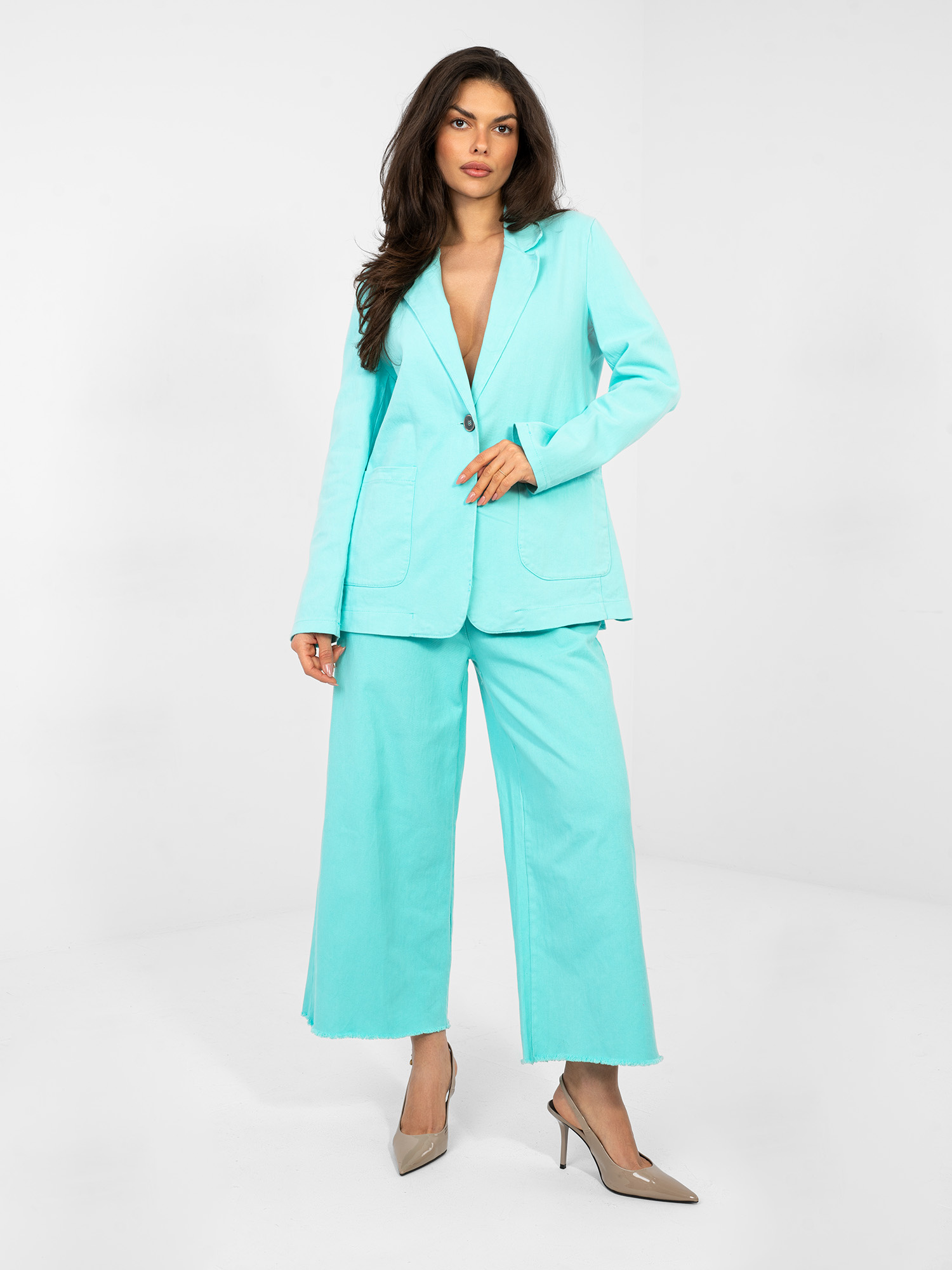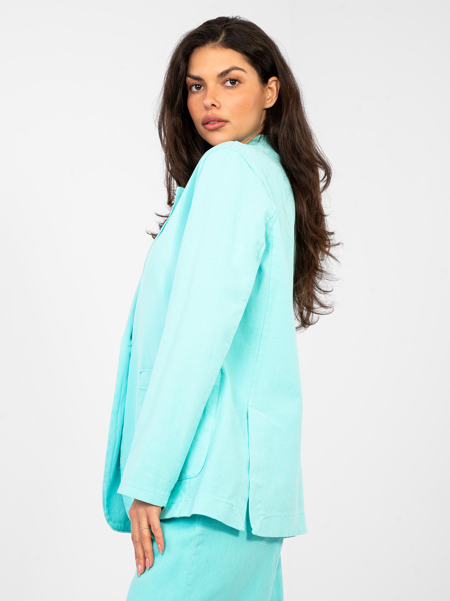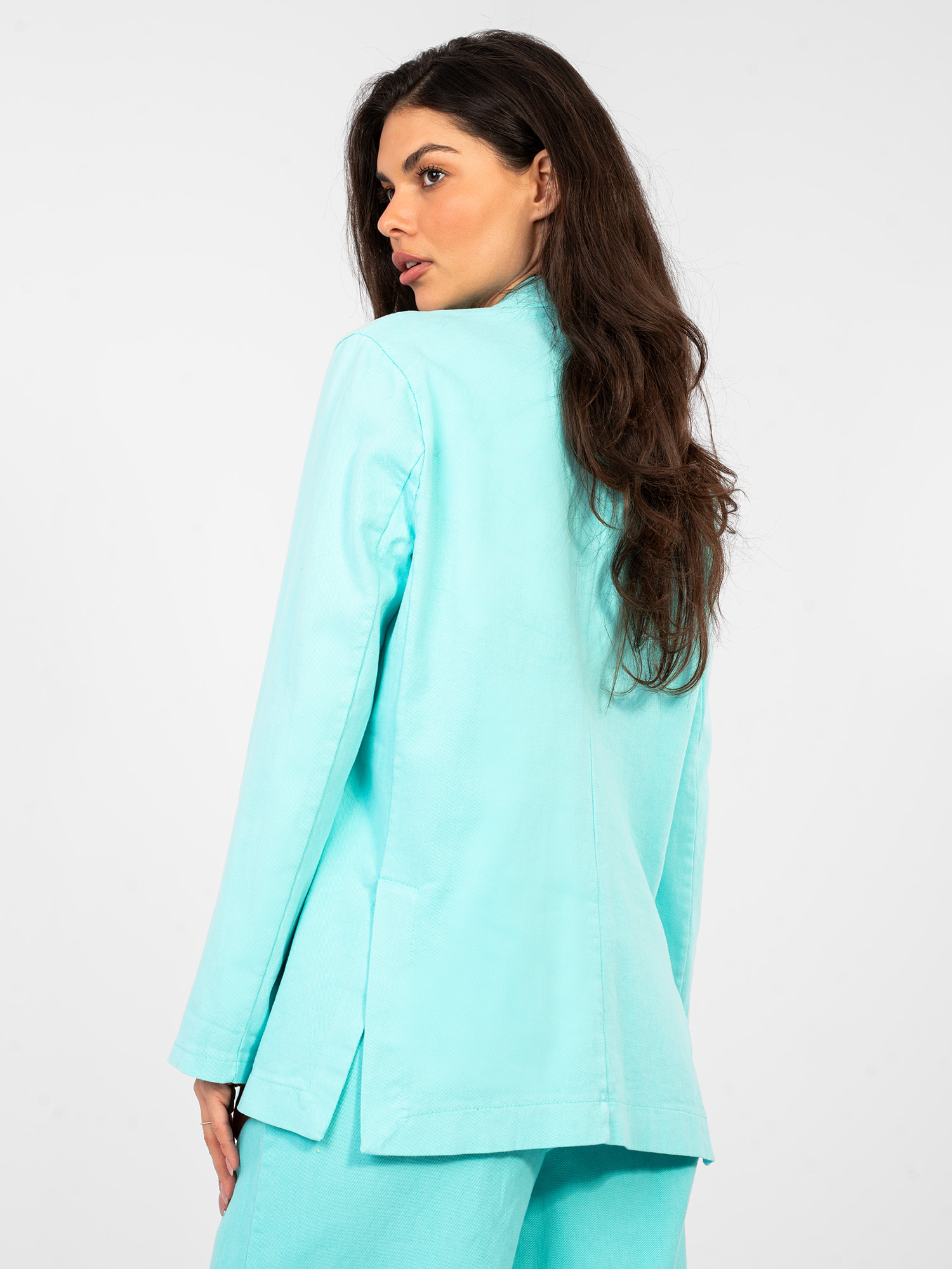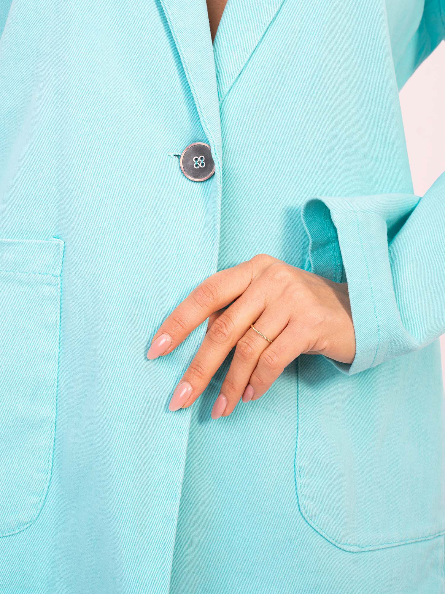 Turkusowa jeansowa marynarka z zapięciem na guzik RUE PARIS .