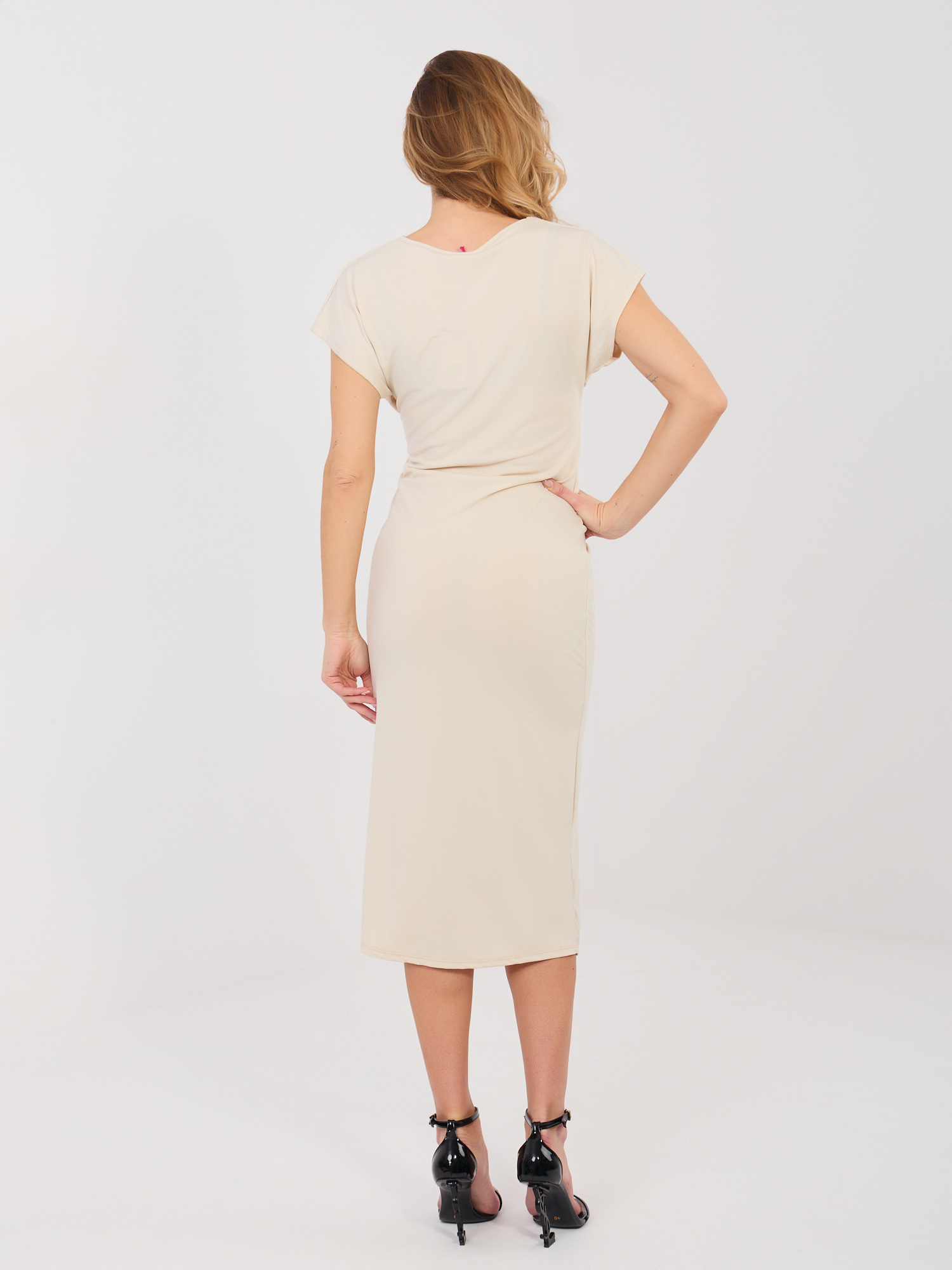 Beżowa midi sukienka z ozdobnym węzłem .