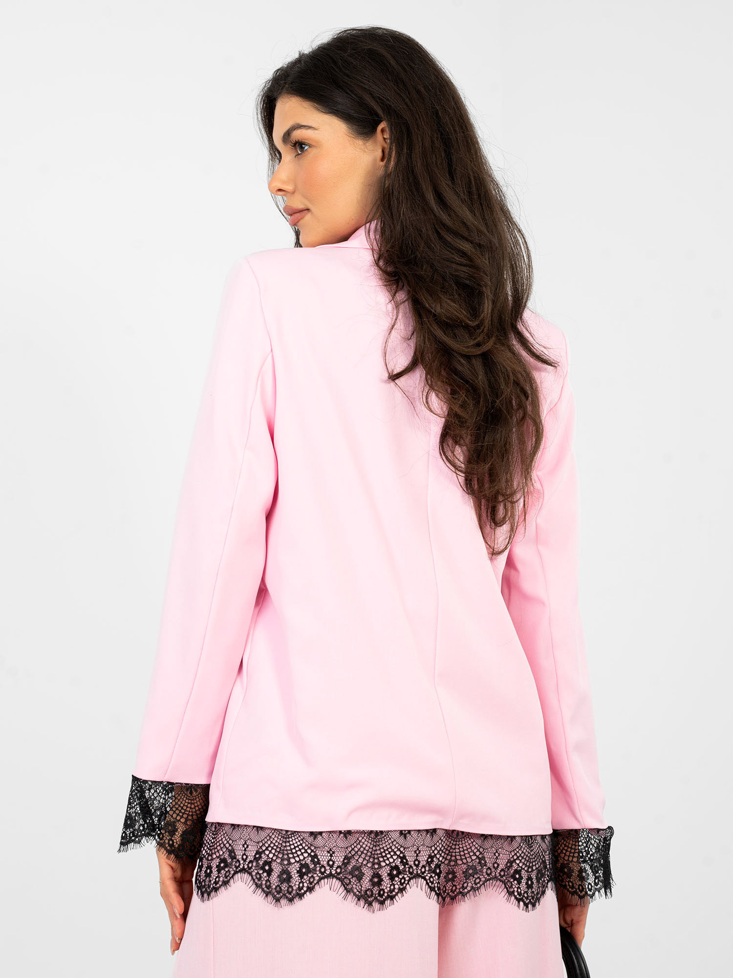 Pastelowa różowa marynarka z rękawem typu dzwon .