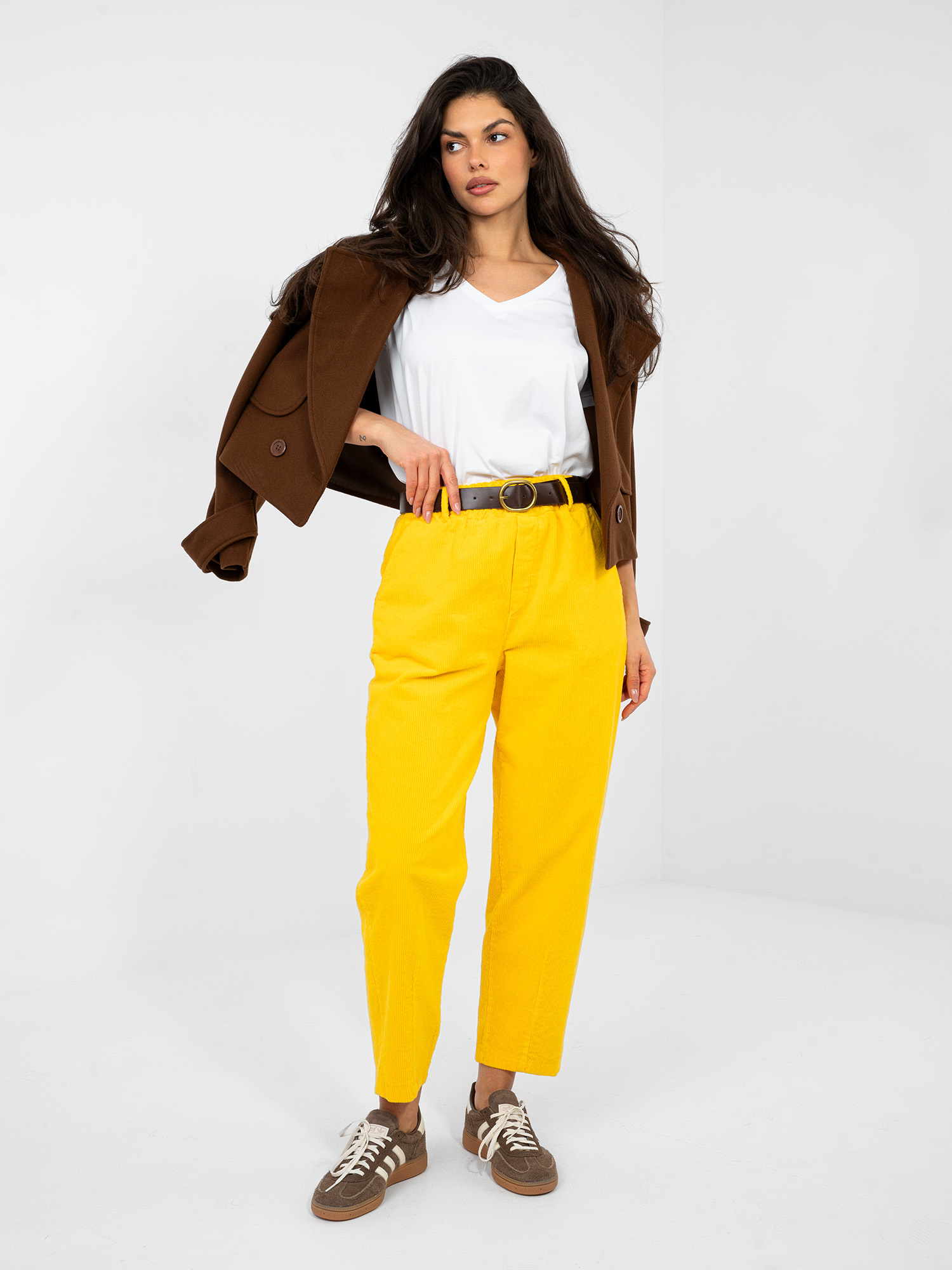 Żółte sztruksowe spodnie z kieszeniami .