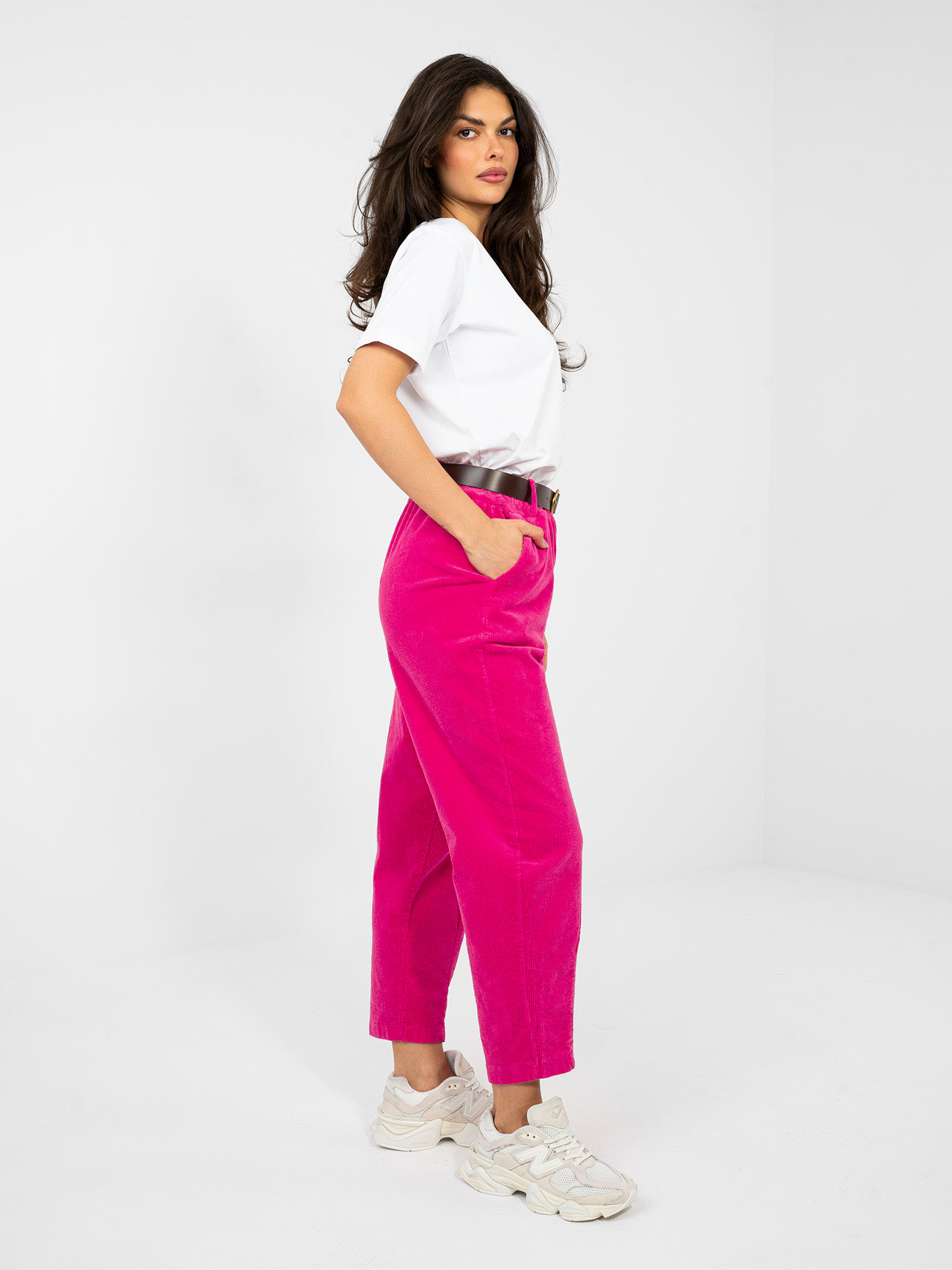 Fuksjowe sztruksowe spodnie typu carrot .