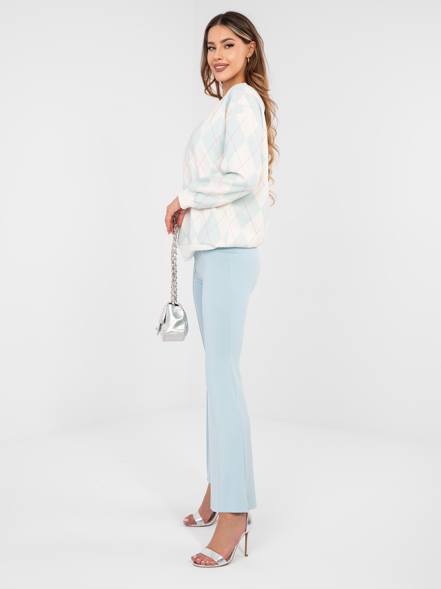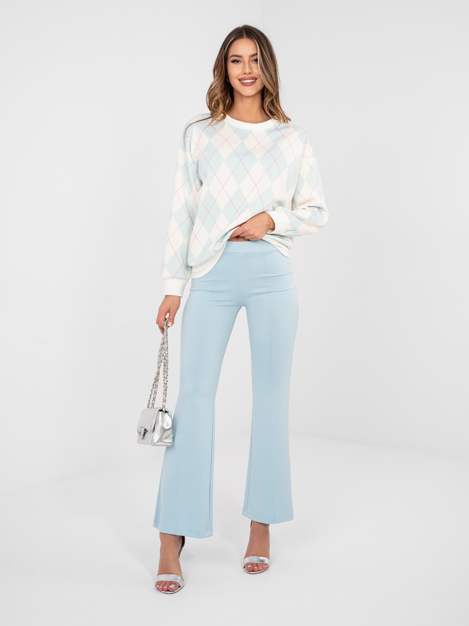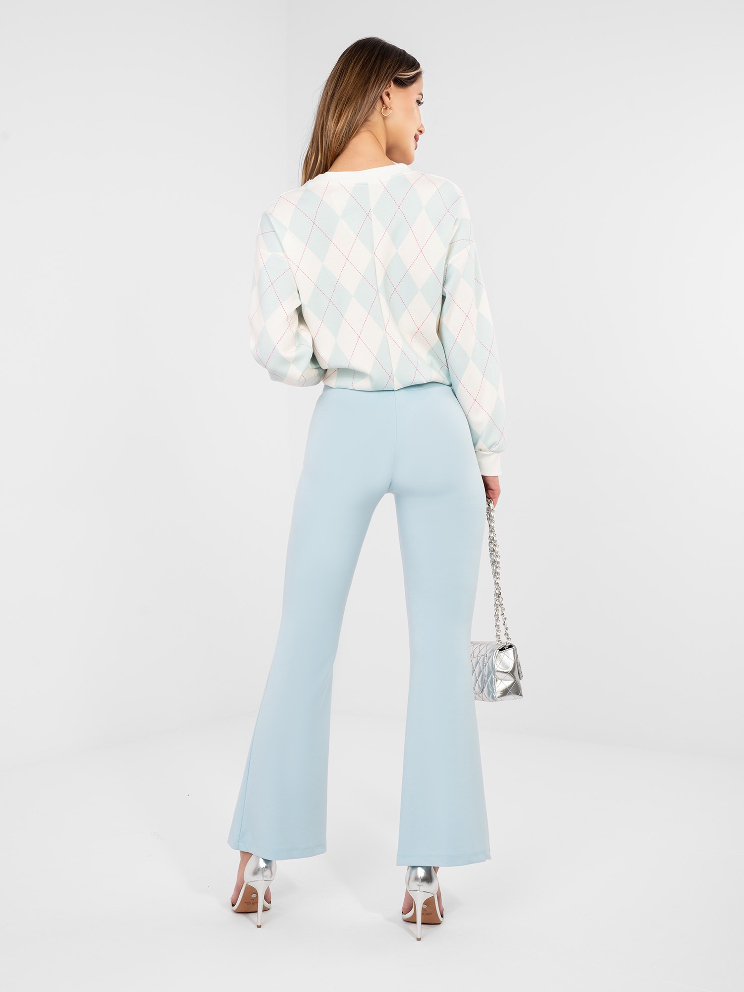 Opinie o Pastelowe niebieskie spodnie dzwony bez zapięcia RUE PARIS
