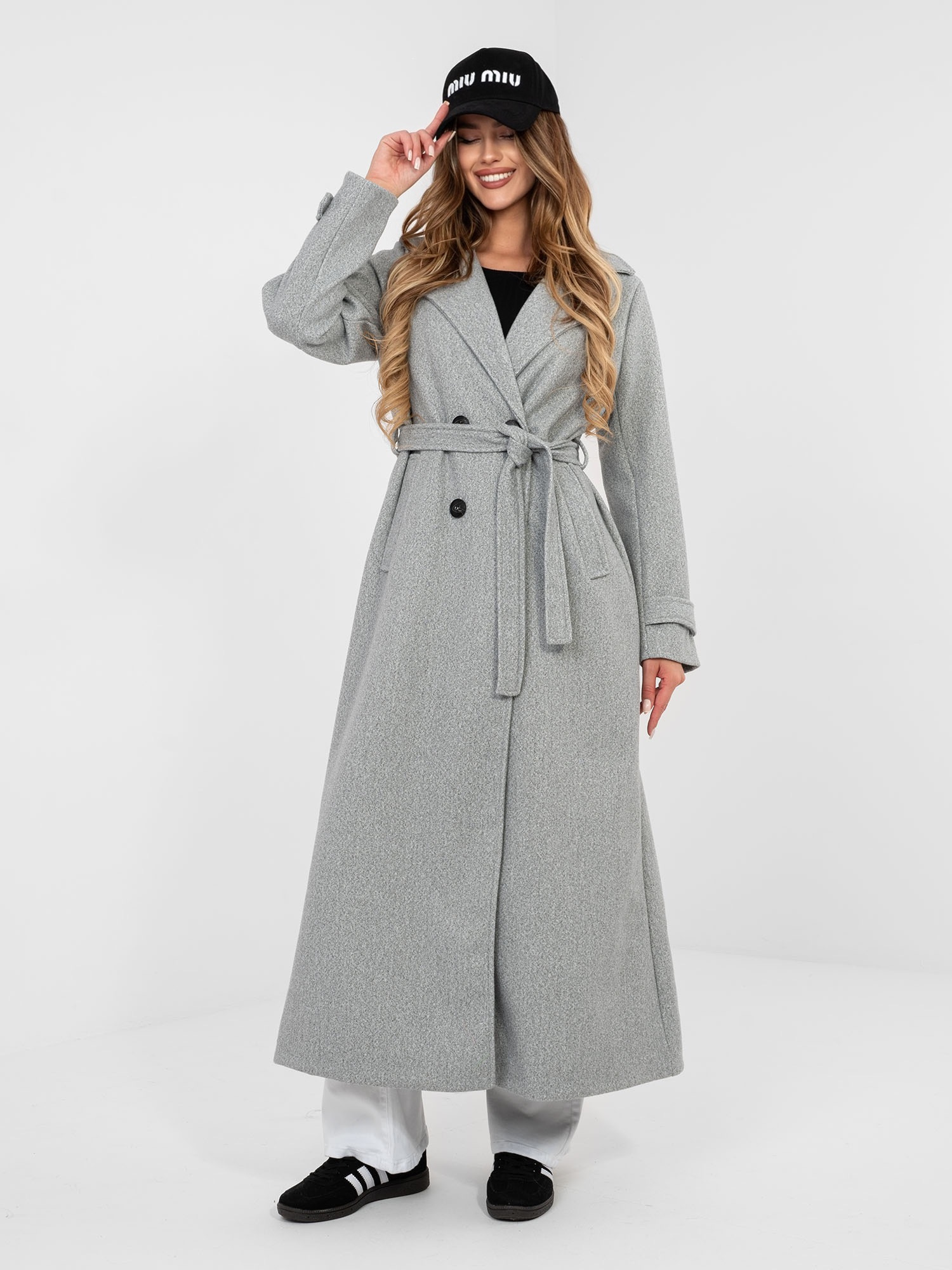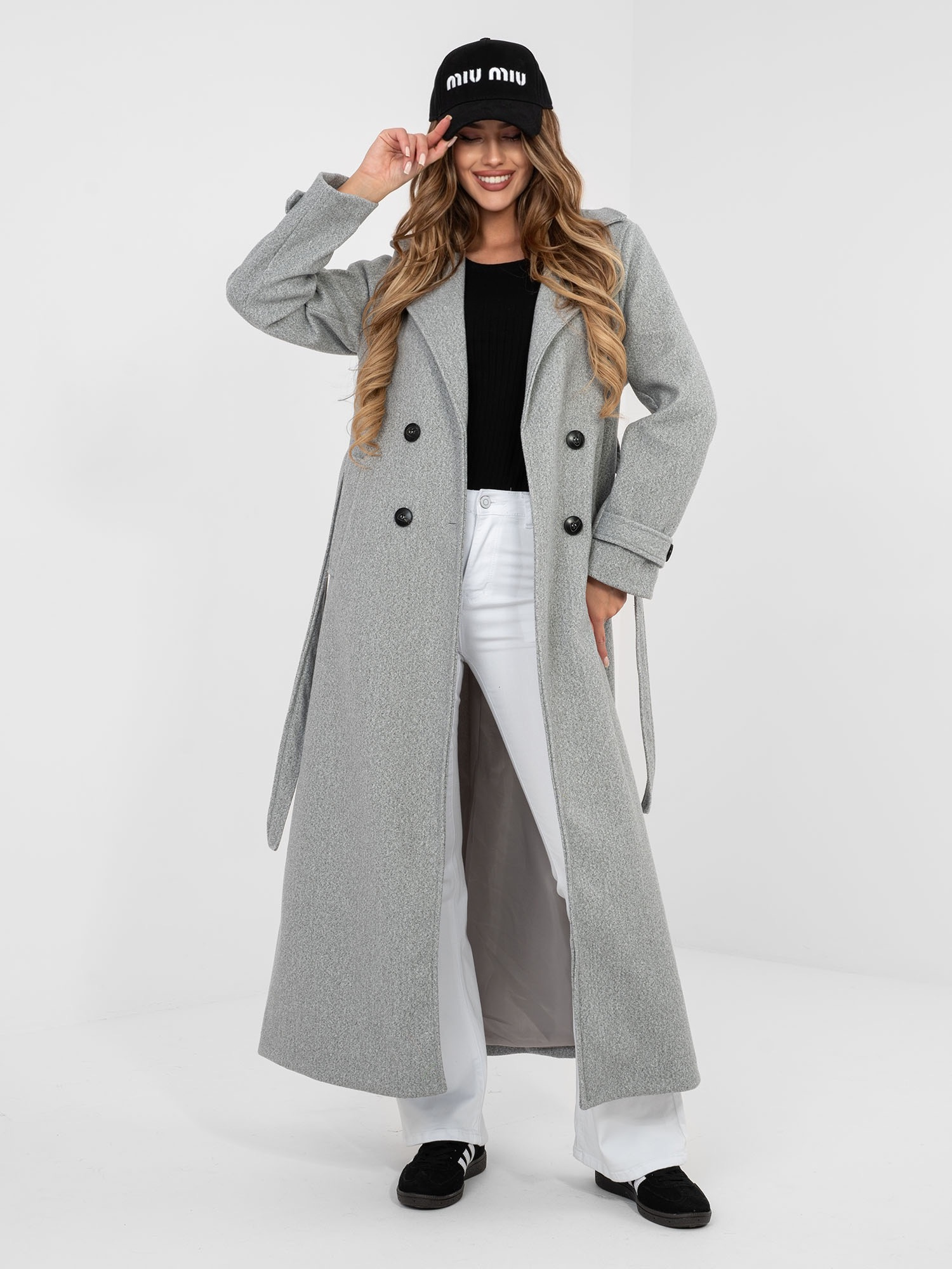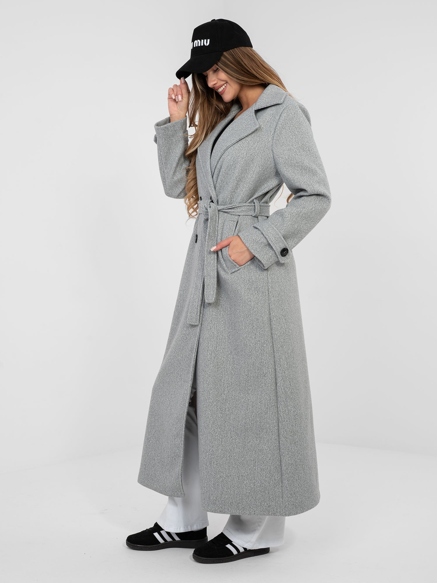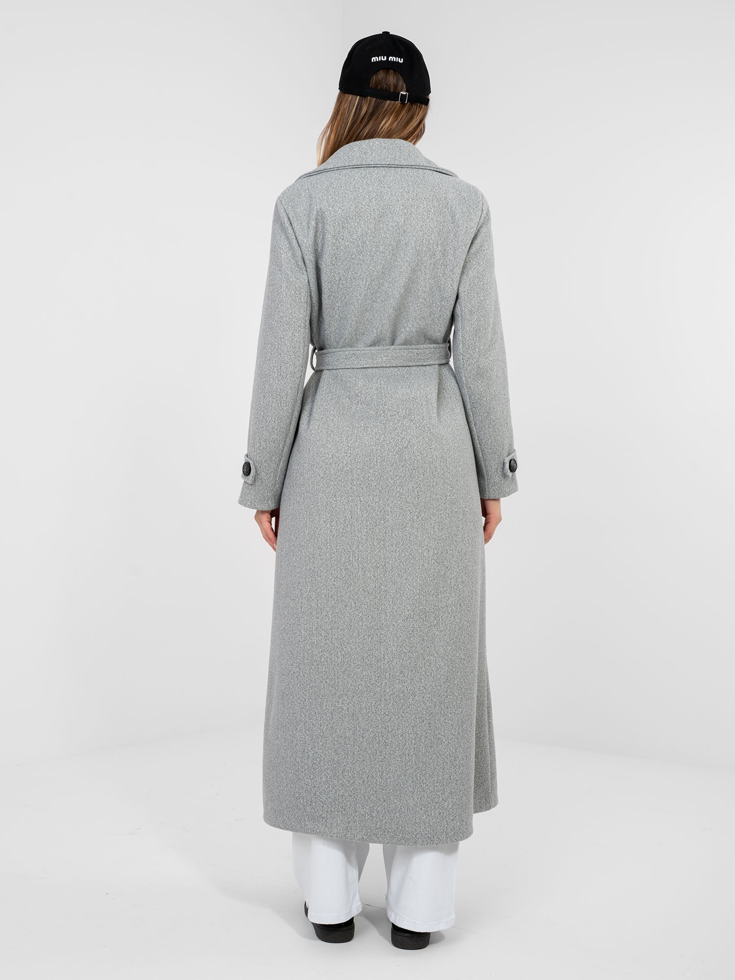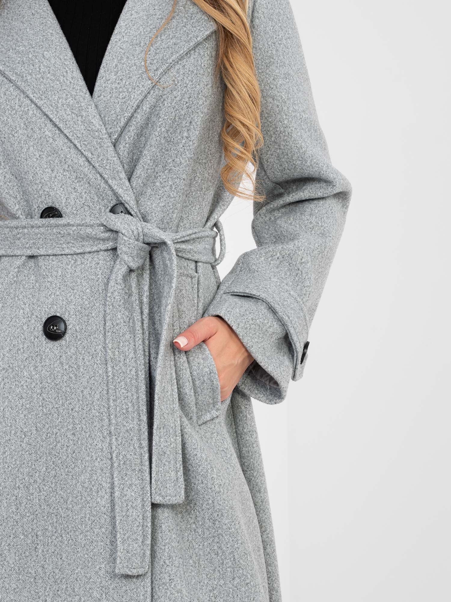 Szary damski płaszcz z paskami na rękawach