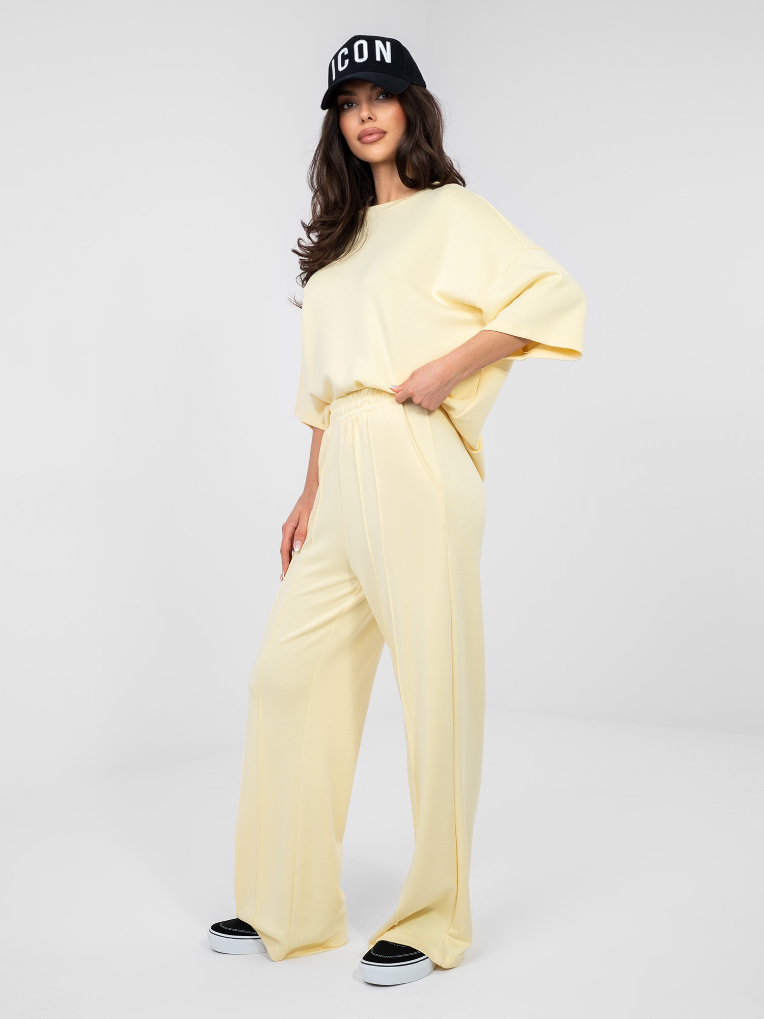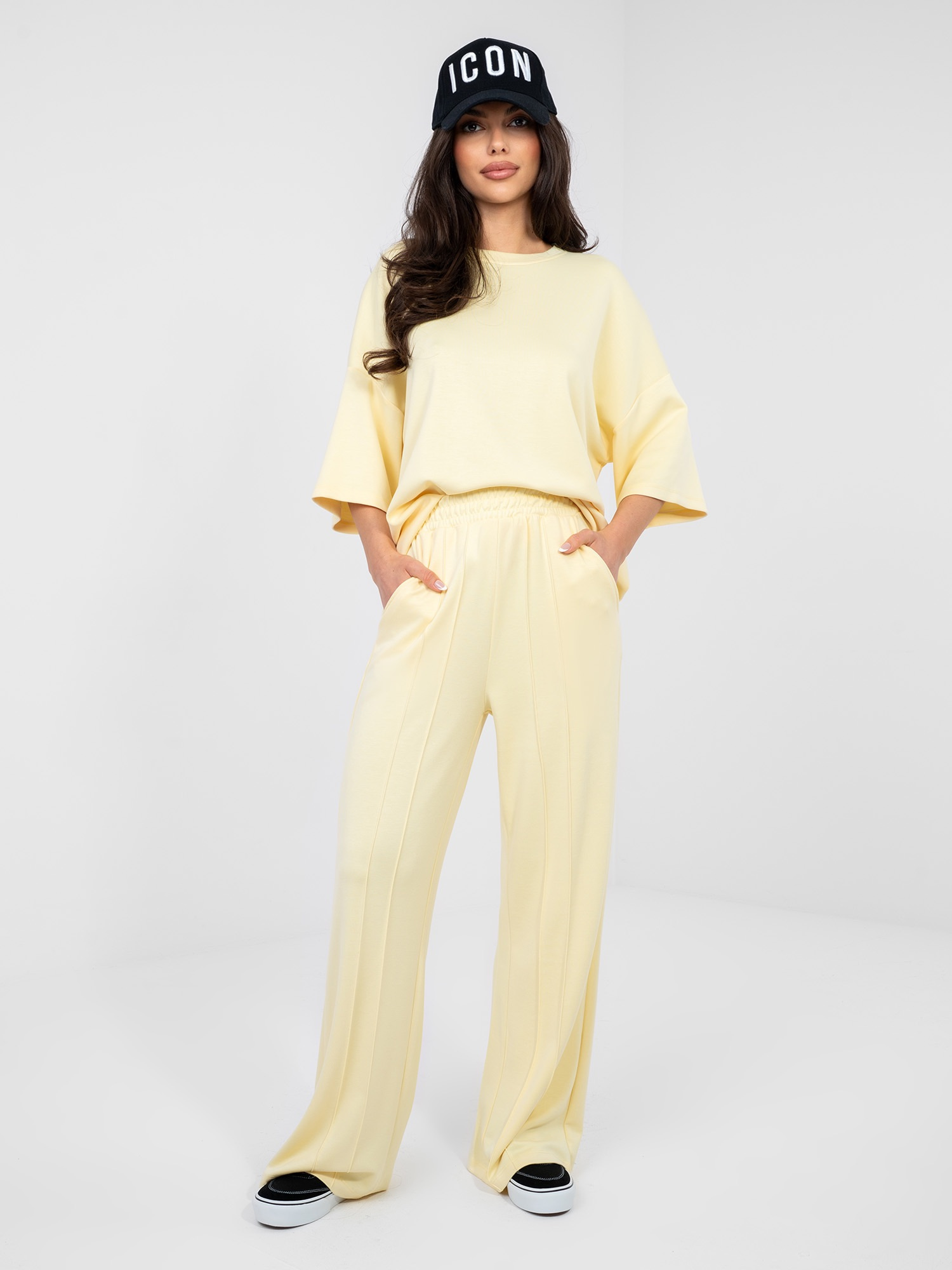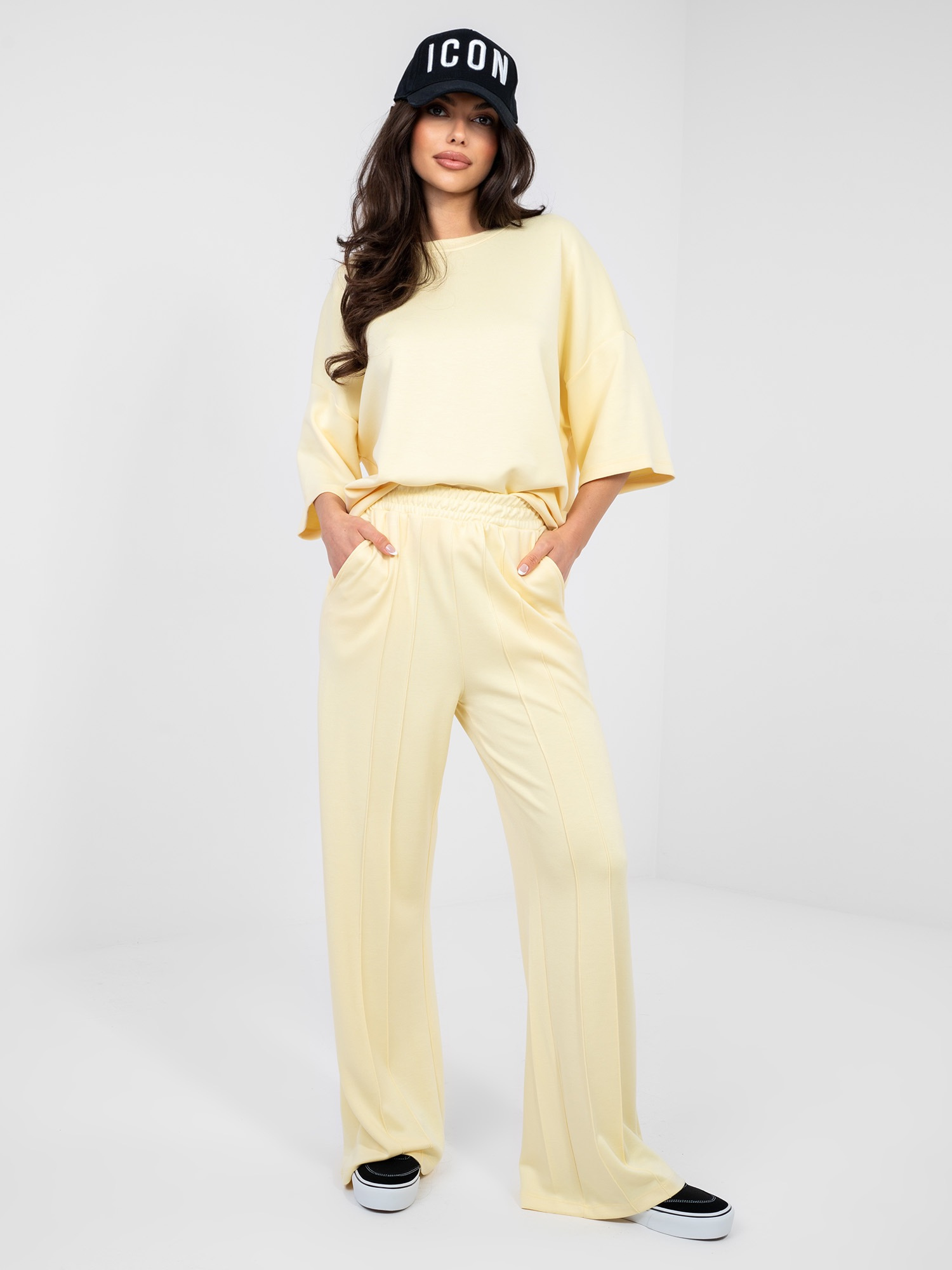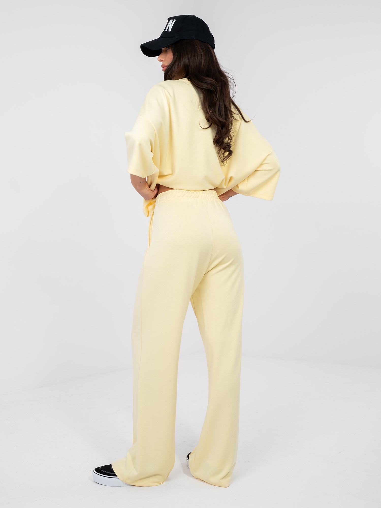 Pastelowe żółte spodnie wide leg z wysokim stanem RUE PARIS .
