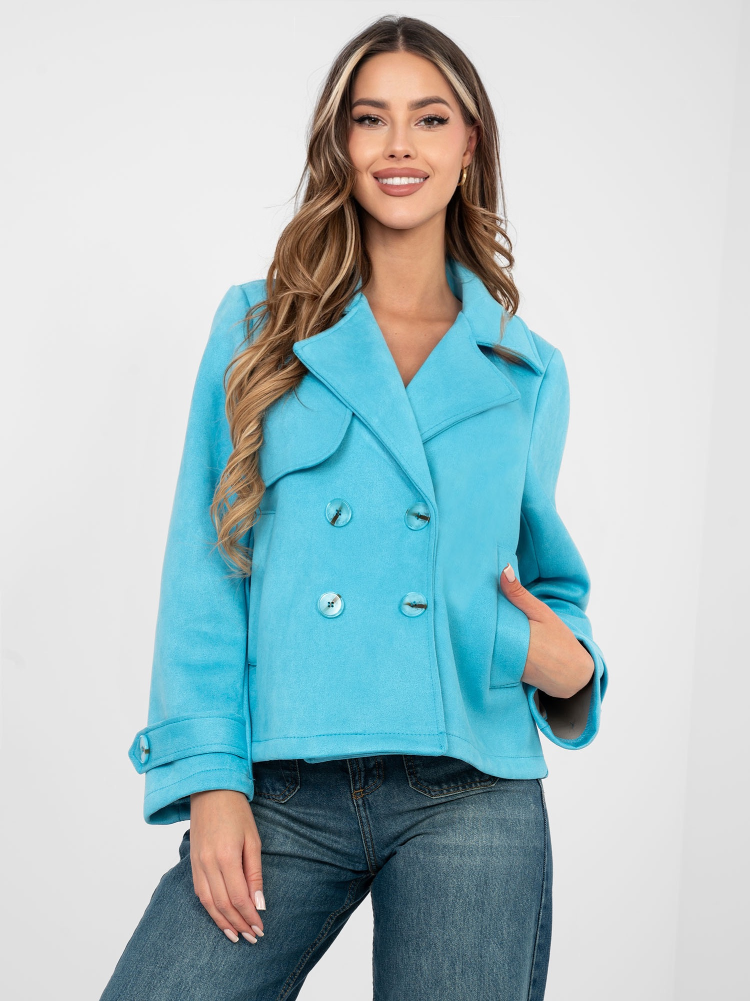 Opinie o Pastelowy niebieski zamszowy płaszcz z kieszeniami
