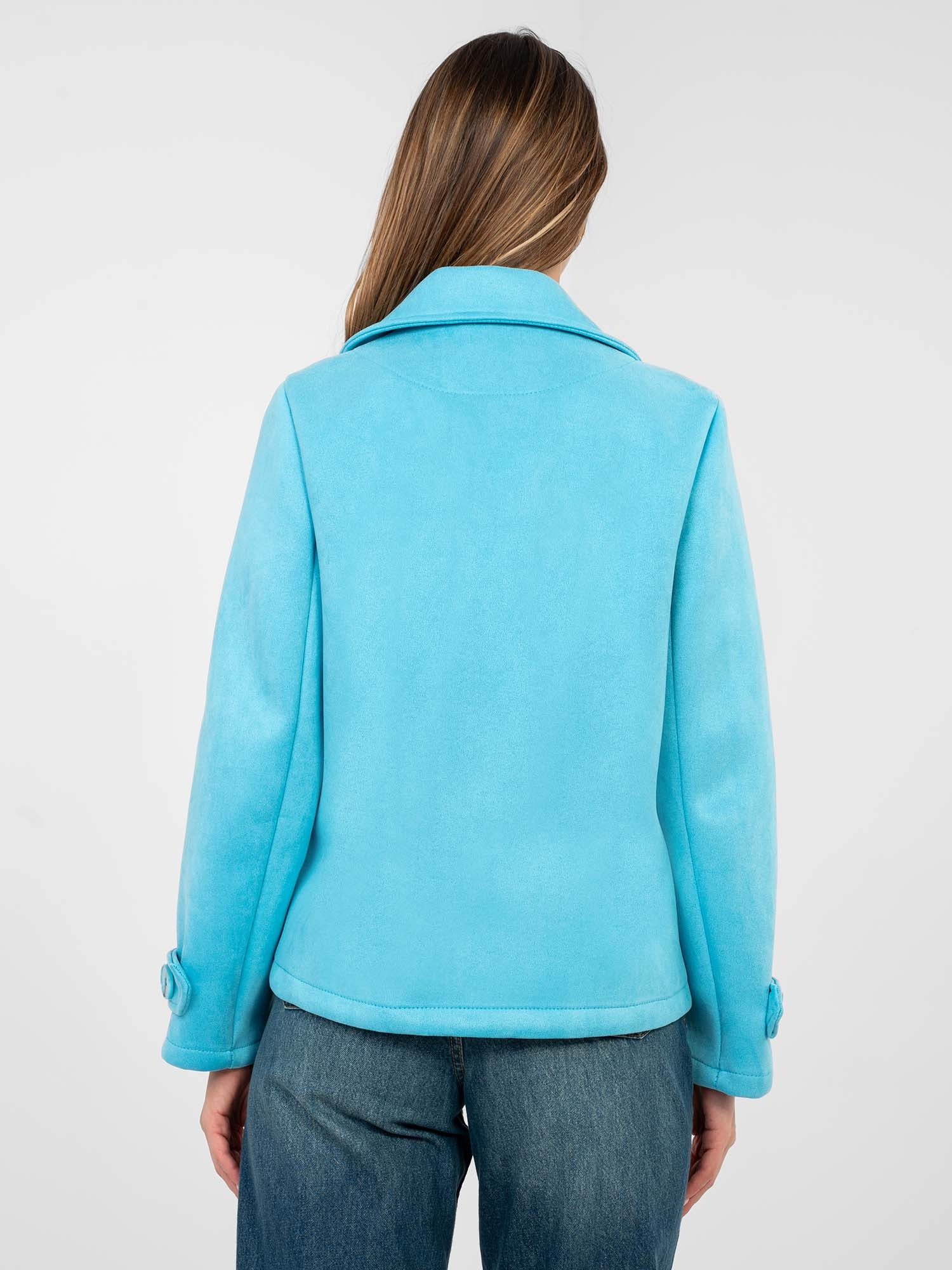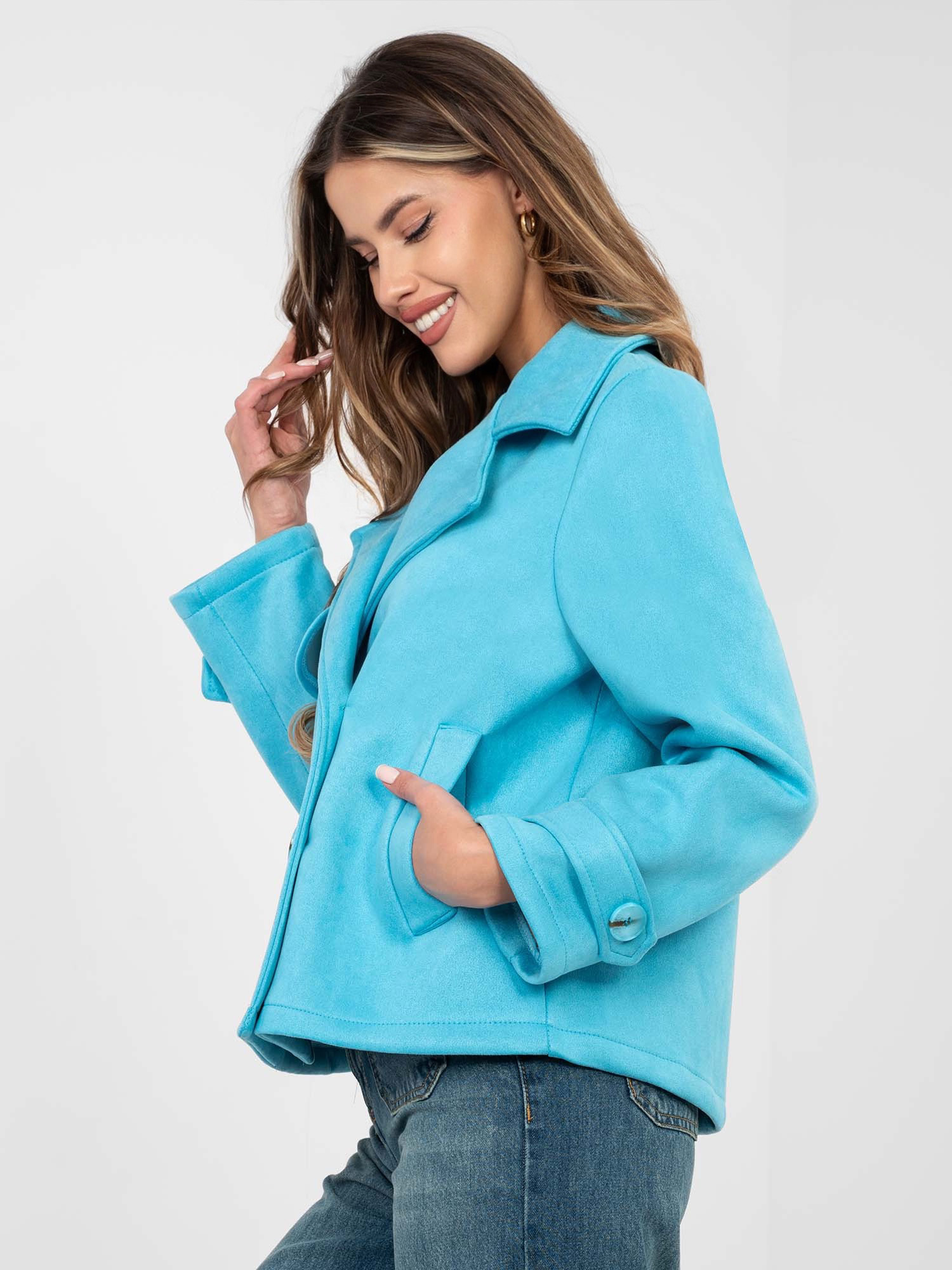 Pastelowy niebieski zamszowy płaszcz z kieszeniami .