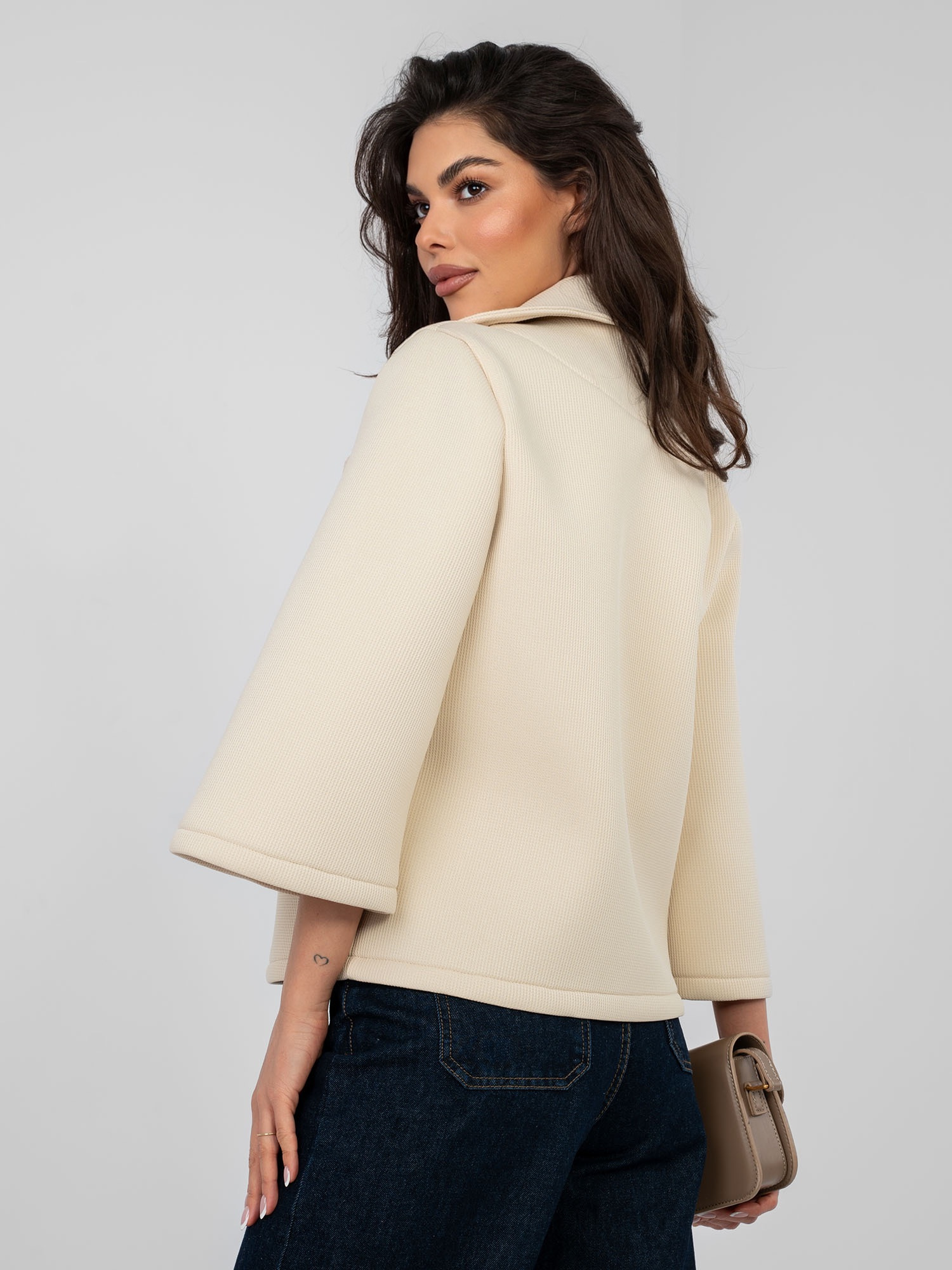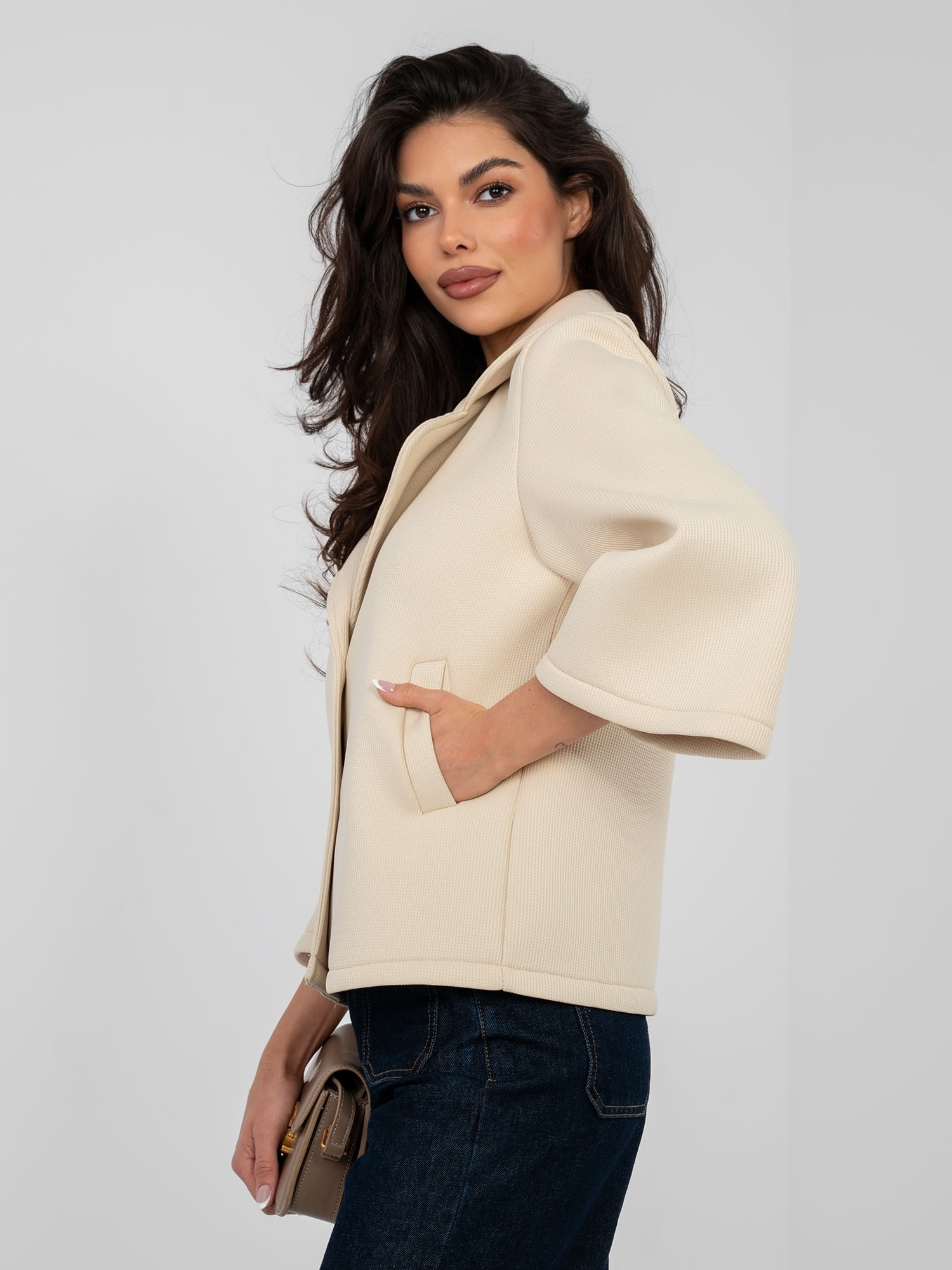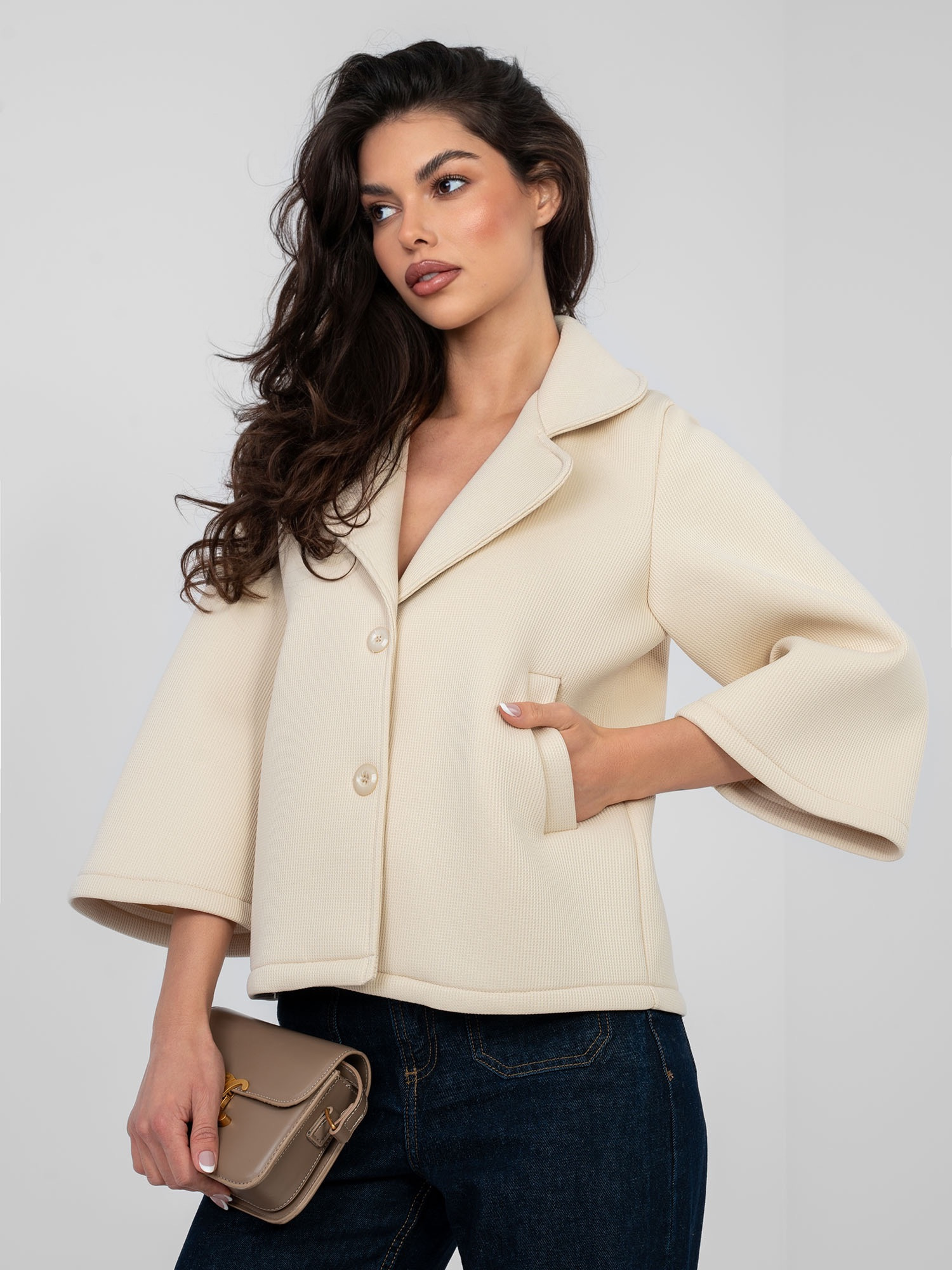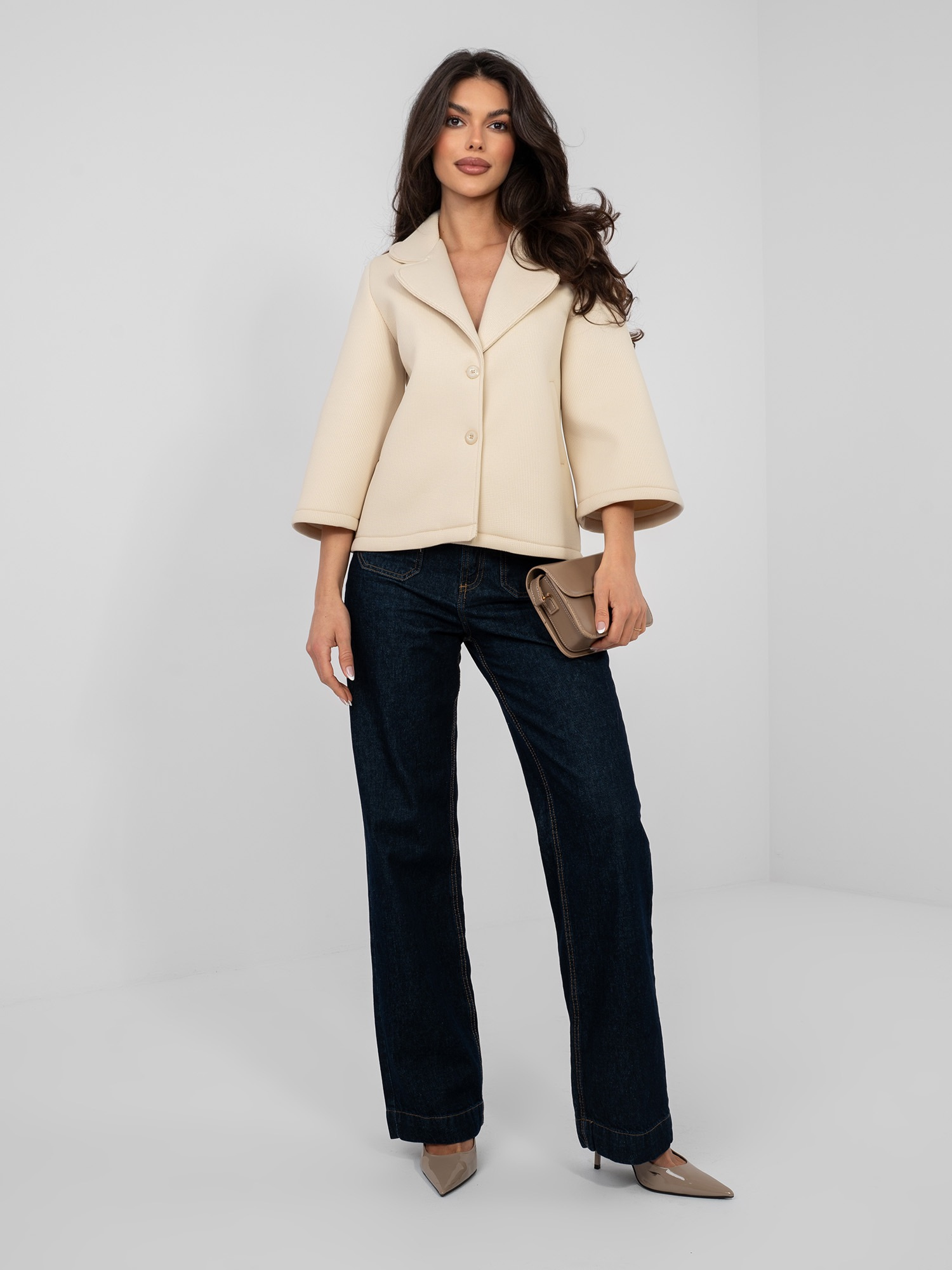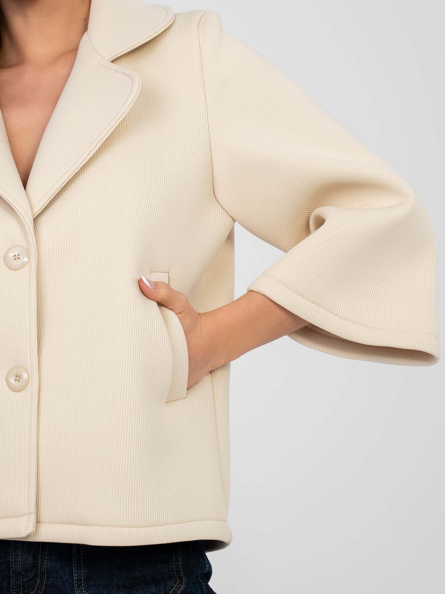 Jasnobeżowy jednorzędowy płaszcz z kołnierzem .