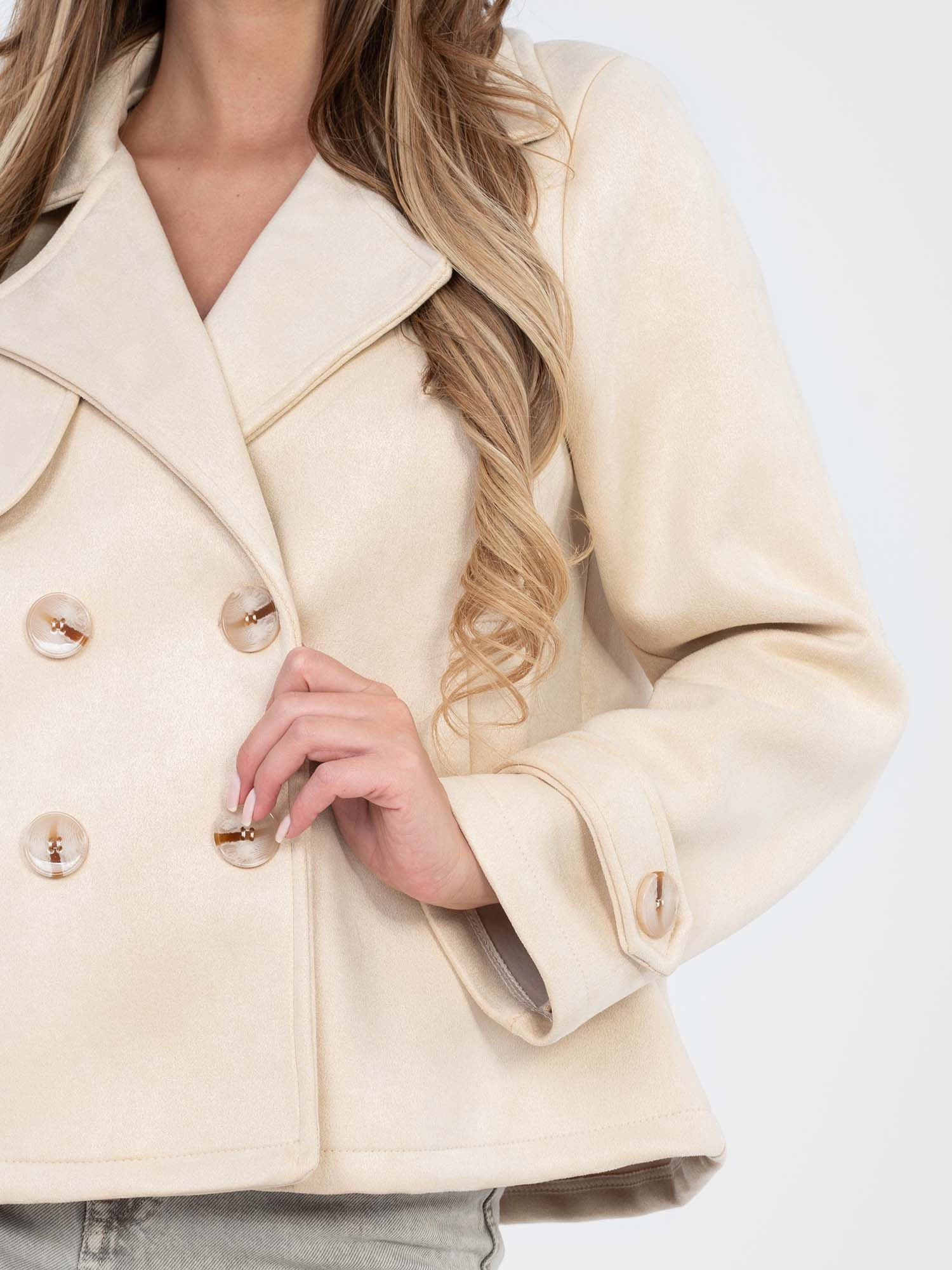 Jasnobeżowy krótki płaszcz z dwurzędowym zapięciem .