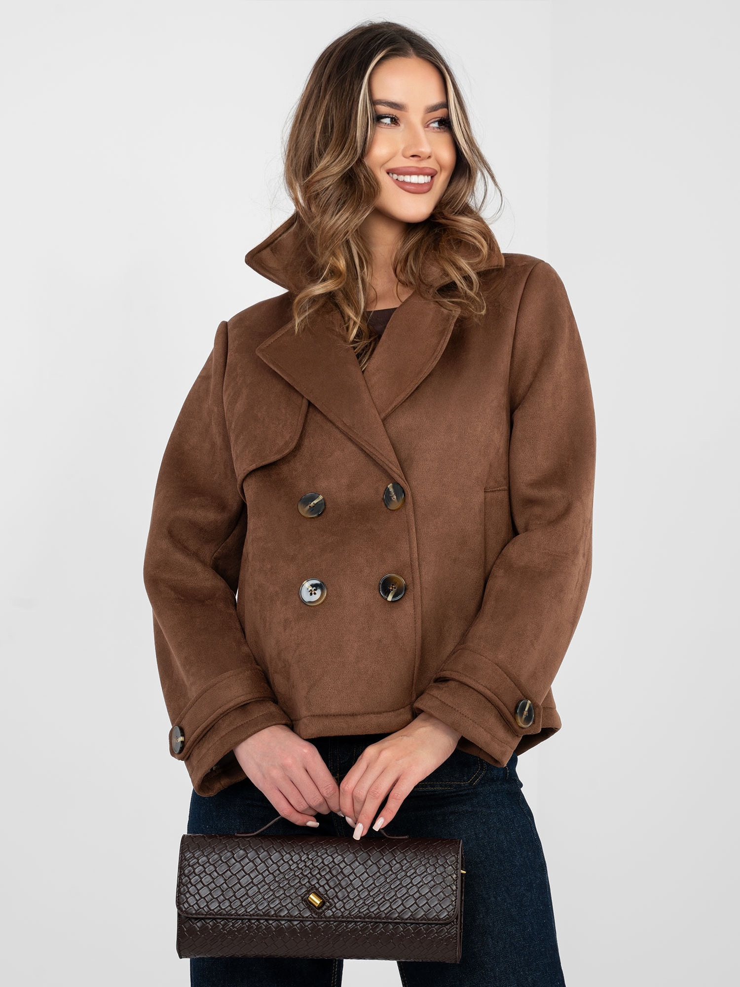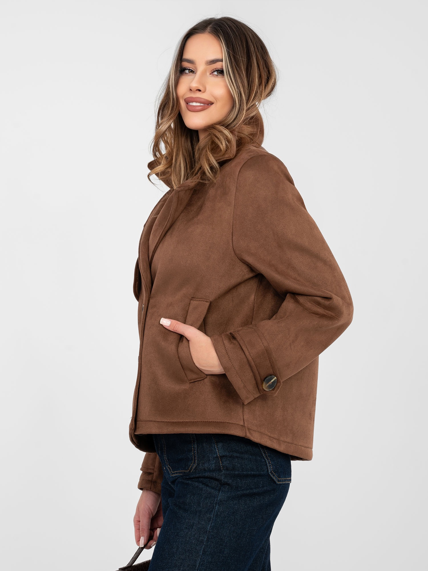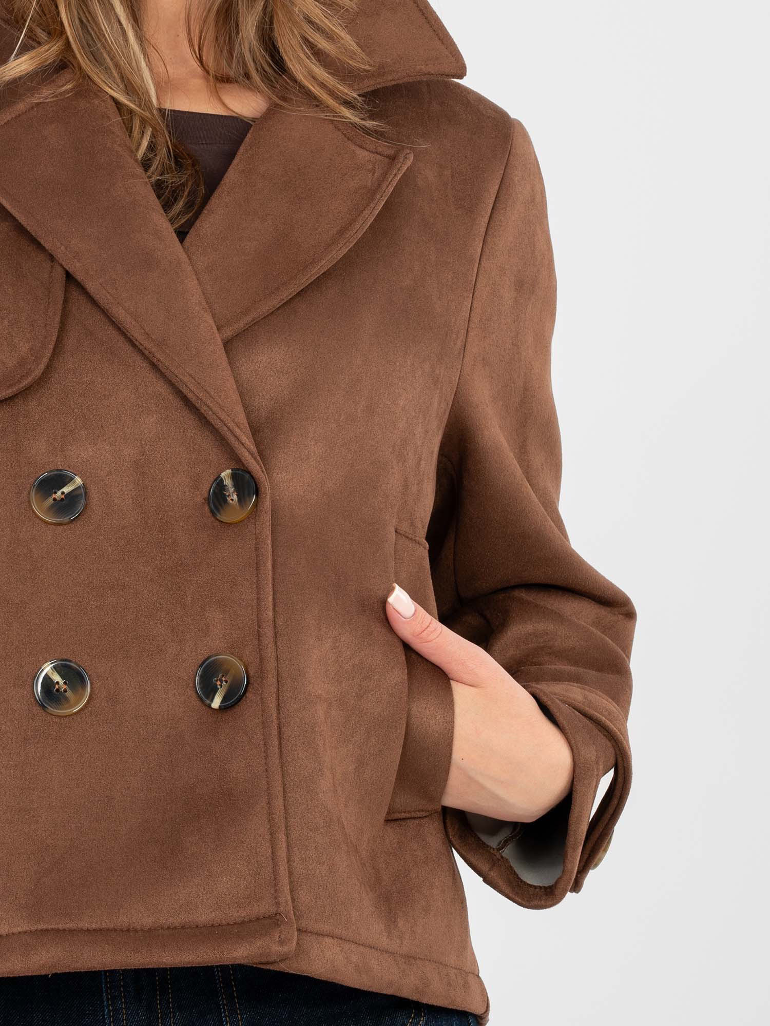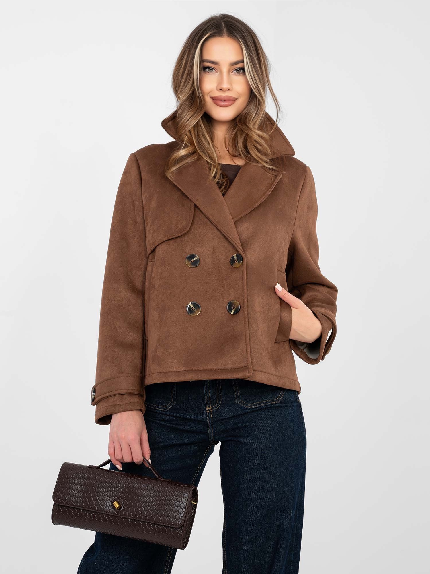 Brązowy zamszowy płaszcz z kieszeniami