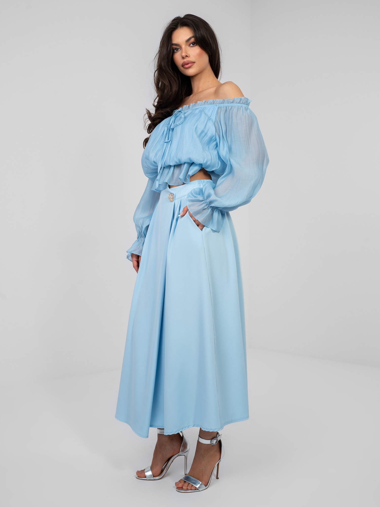 Pastelowa niebieska elegancka spódnica midi .