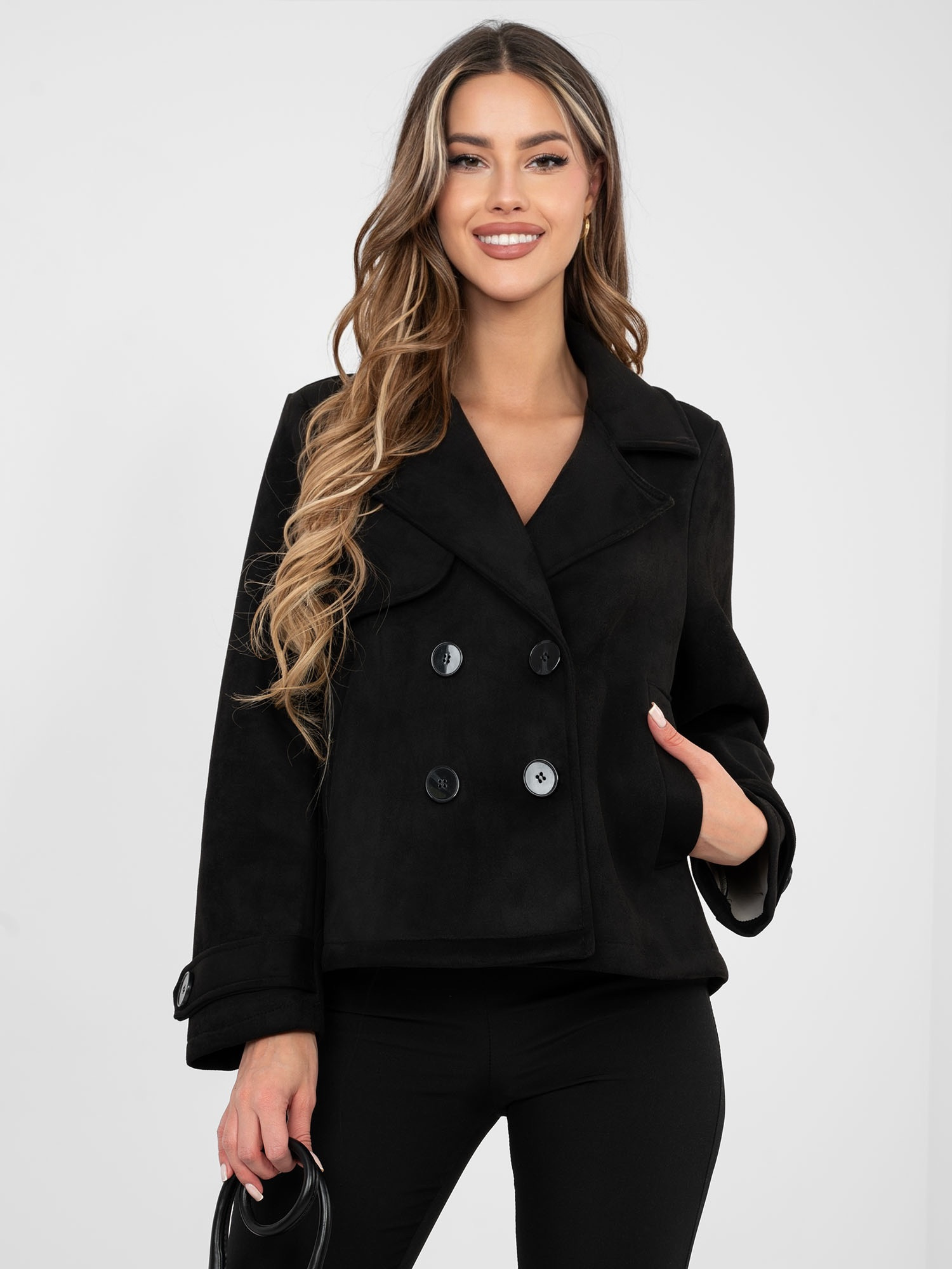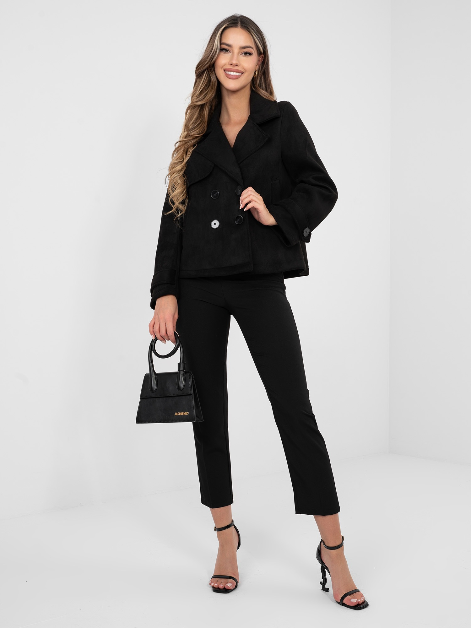 Czarny dwurzędowy płaszcz z paskami na rękawach