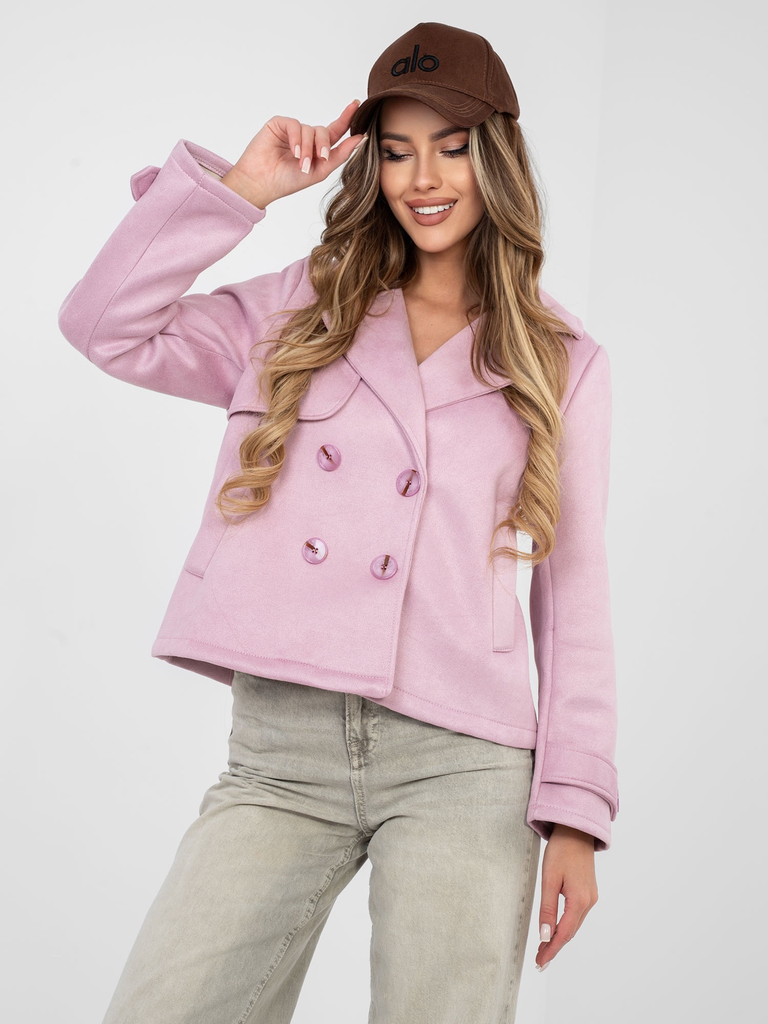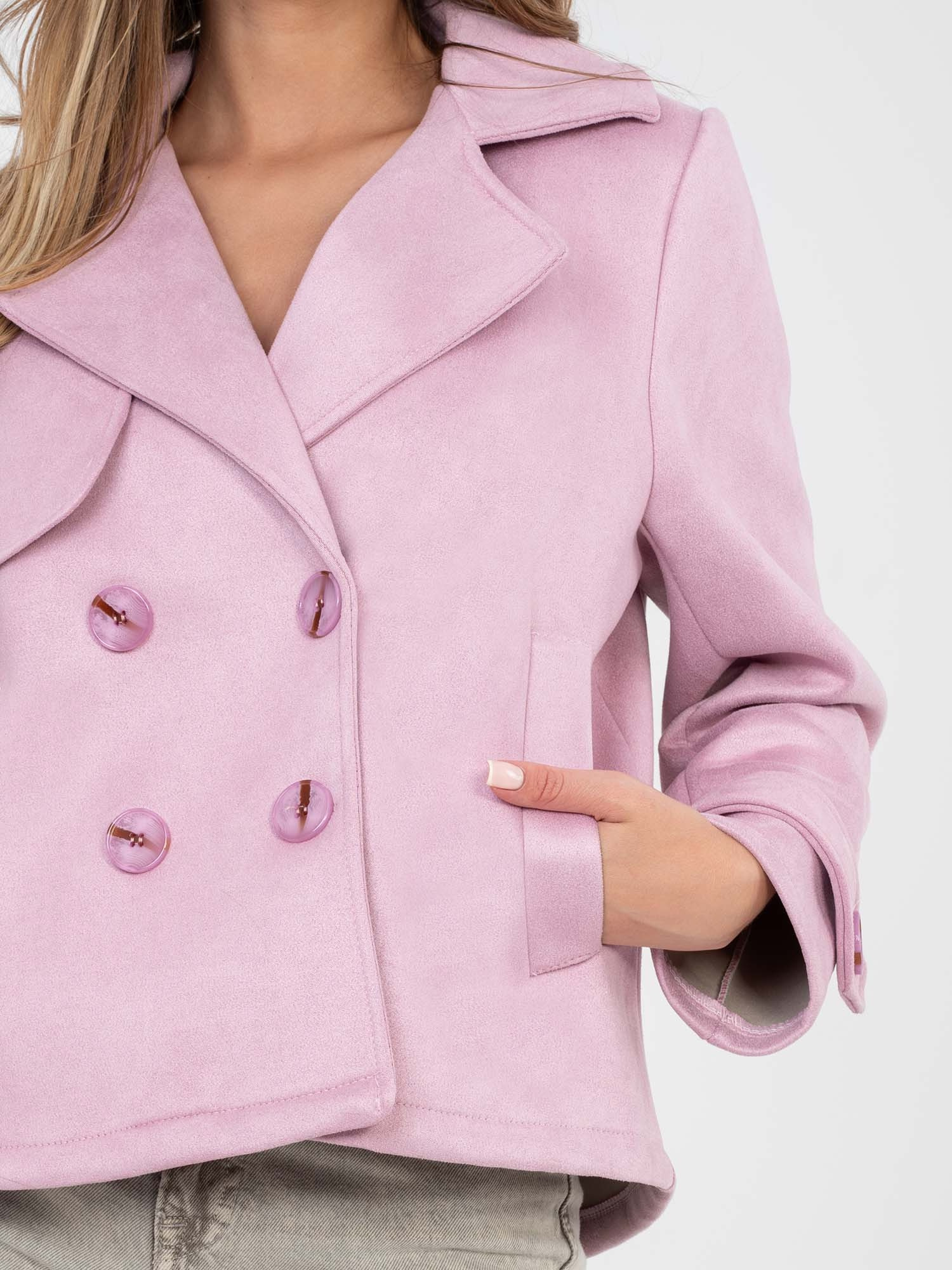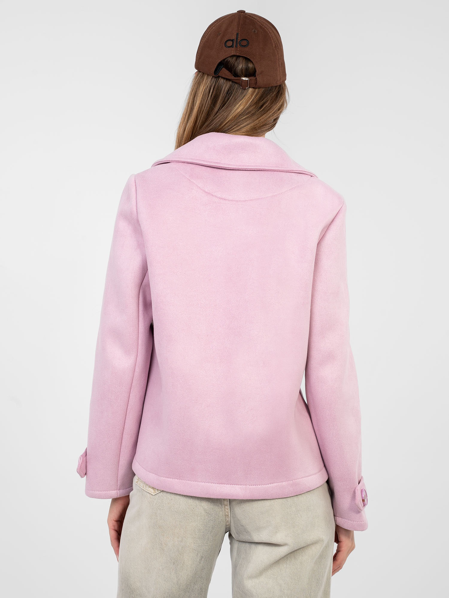 Pastelowy różowy zamszowy płaszcz z kieszeniami .