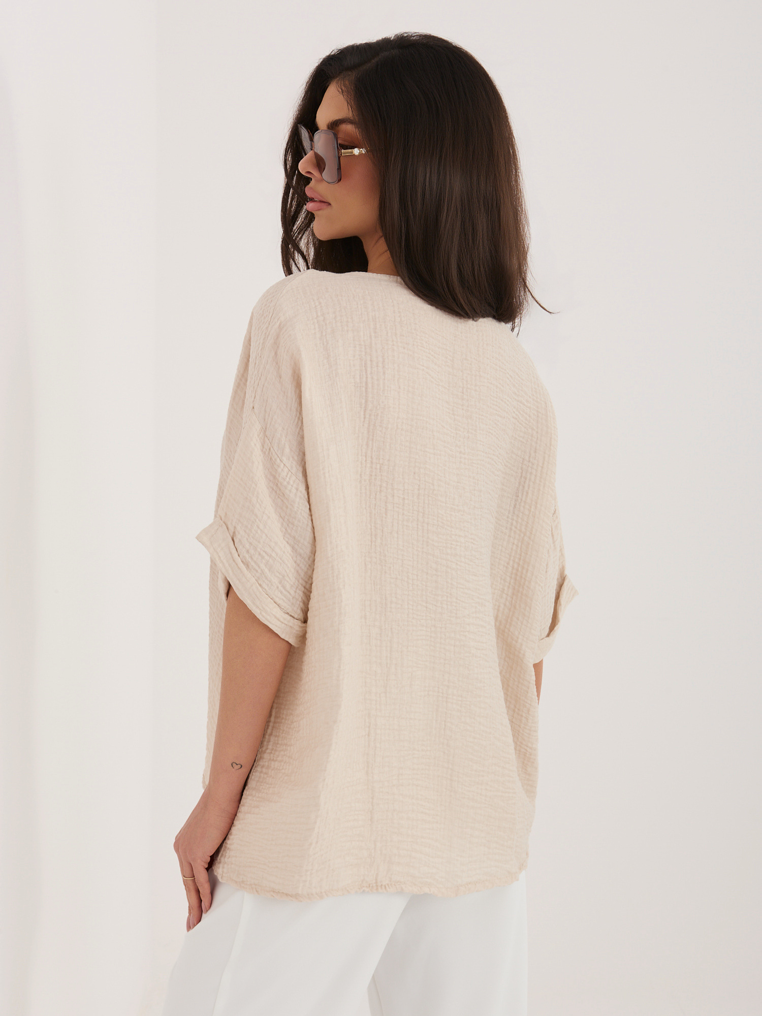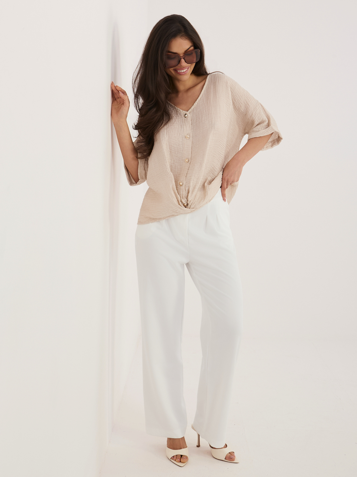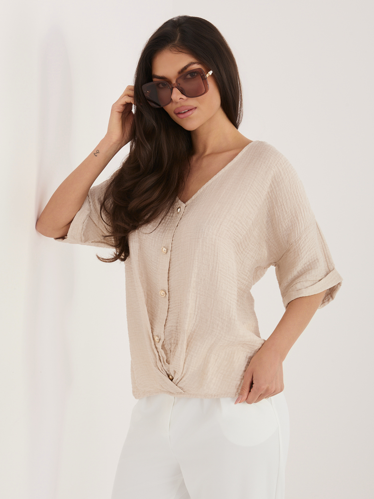Beżowa letnia bluzka z zapięciem na guziki