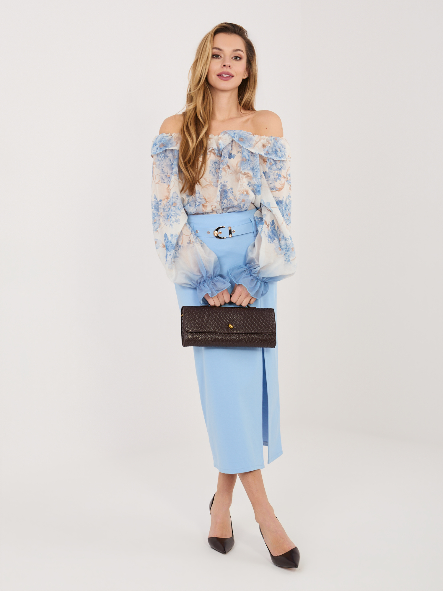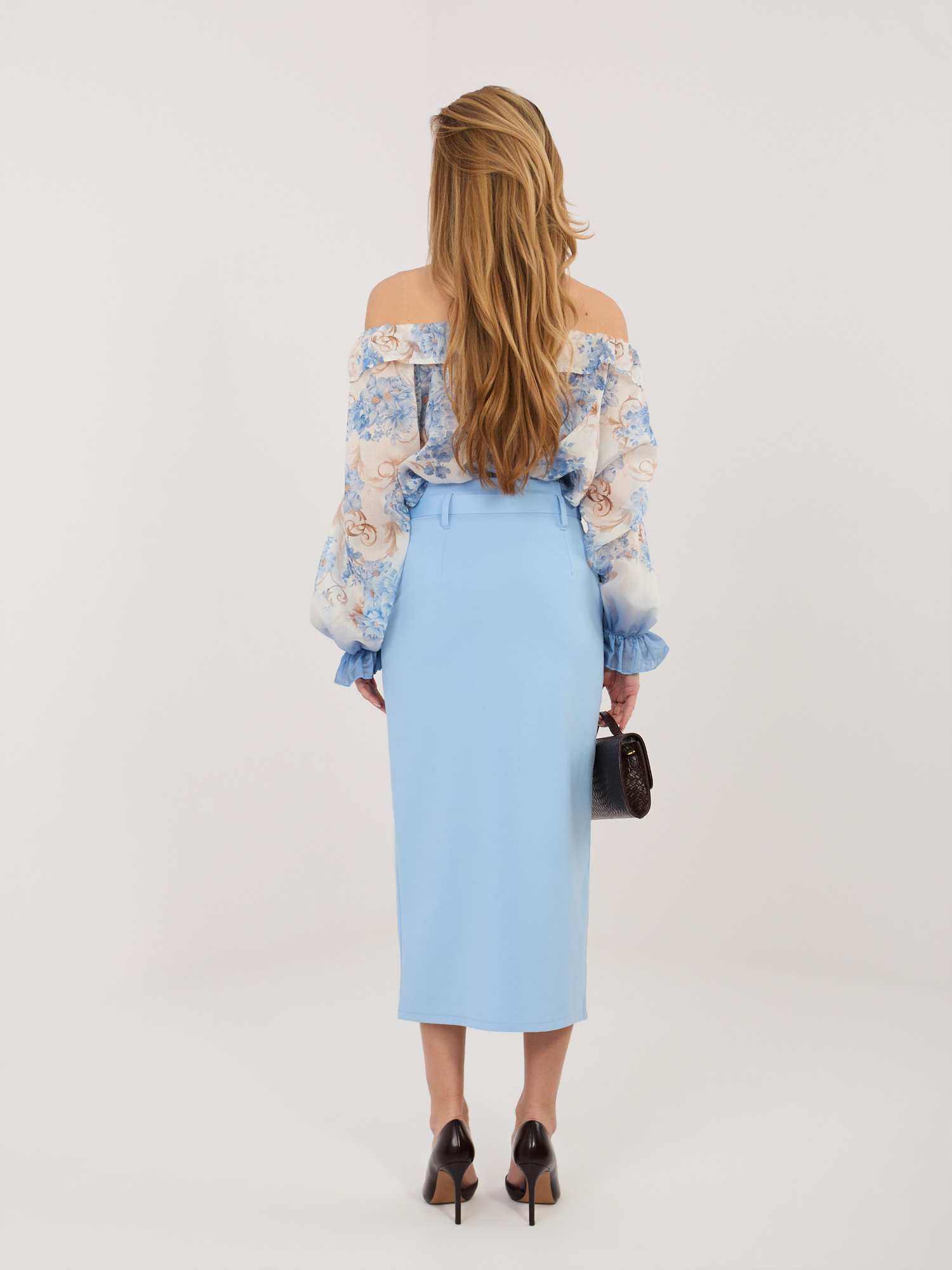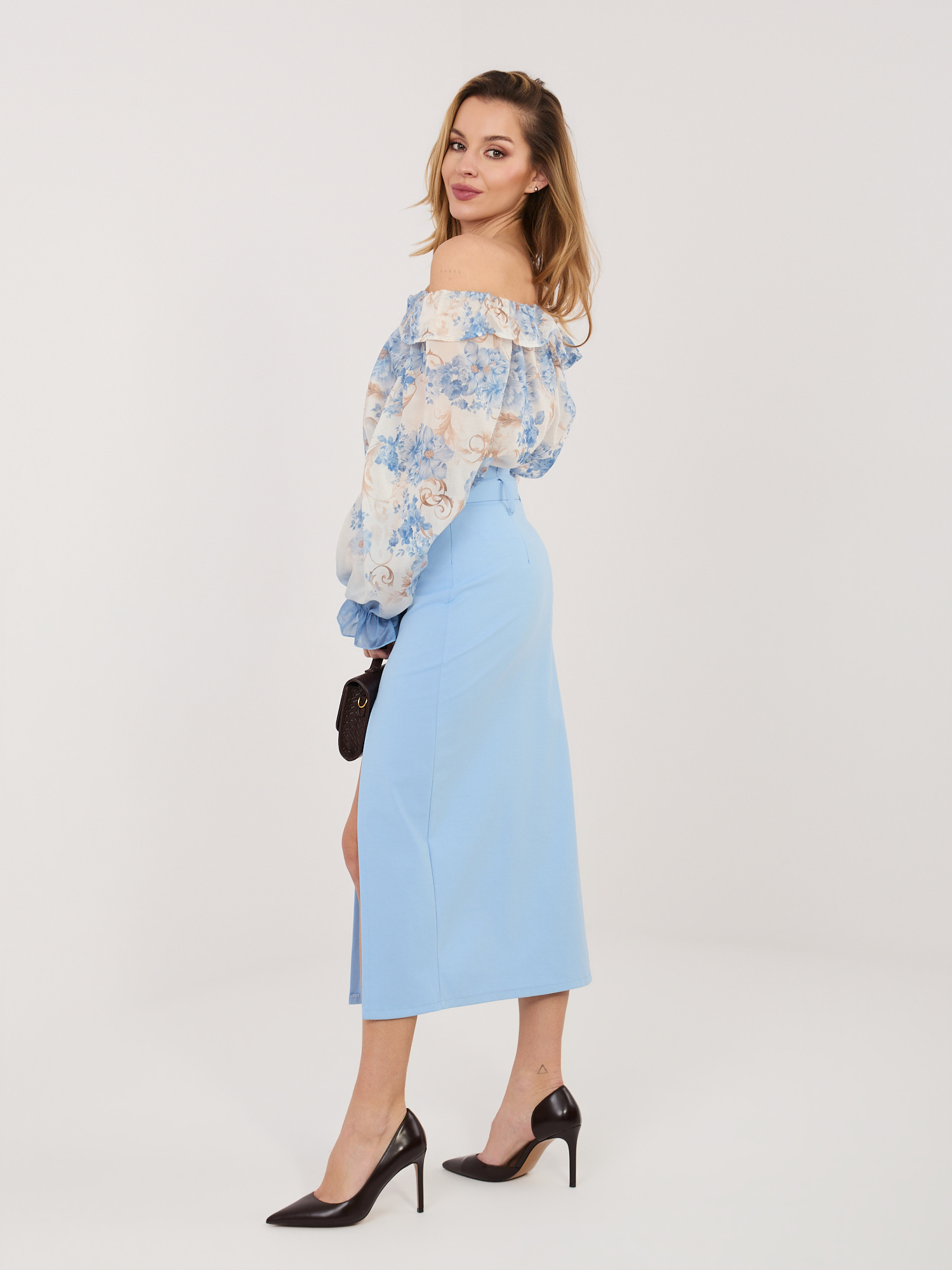 Jasnoniebieska ołówkowa spódnica z wysokim stanem RUE PARIS .