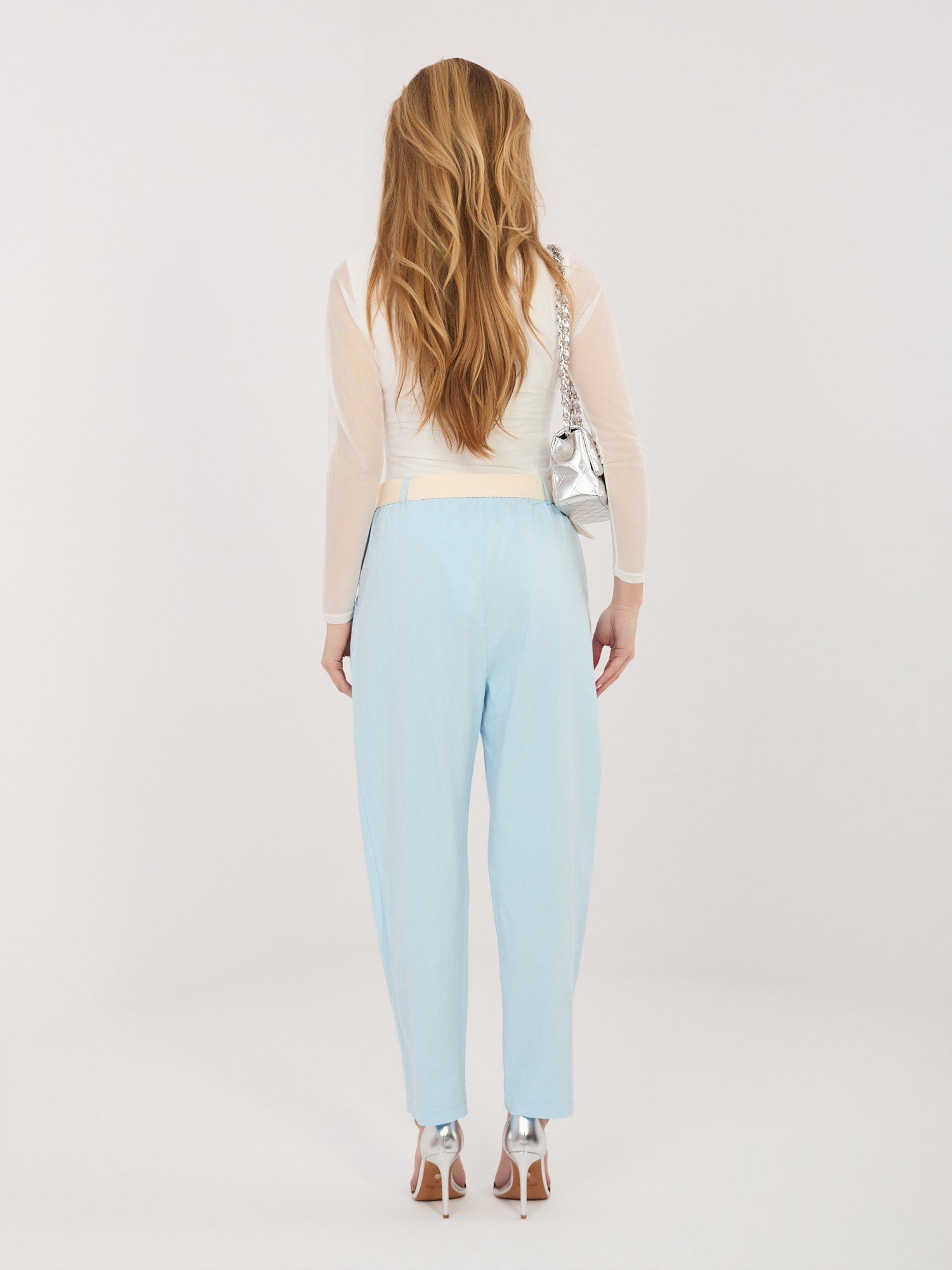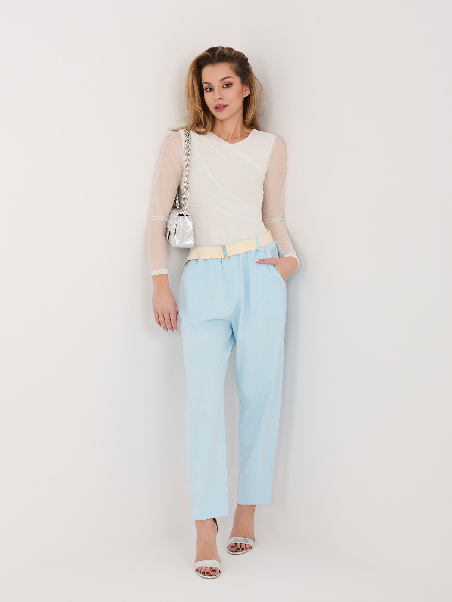 Jasnoniebieskie materiałowe spodnie z wysokim stanem .