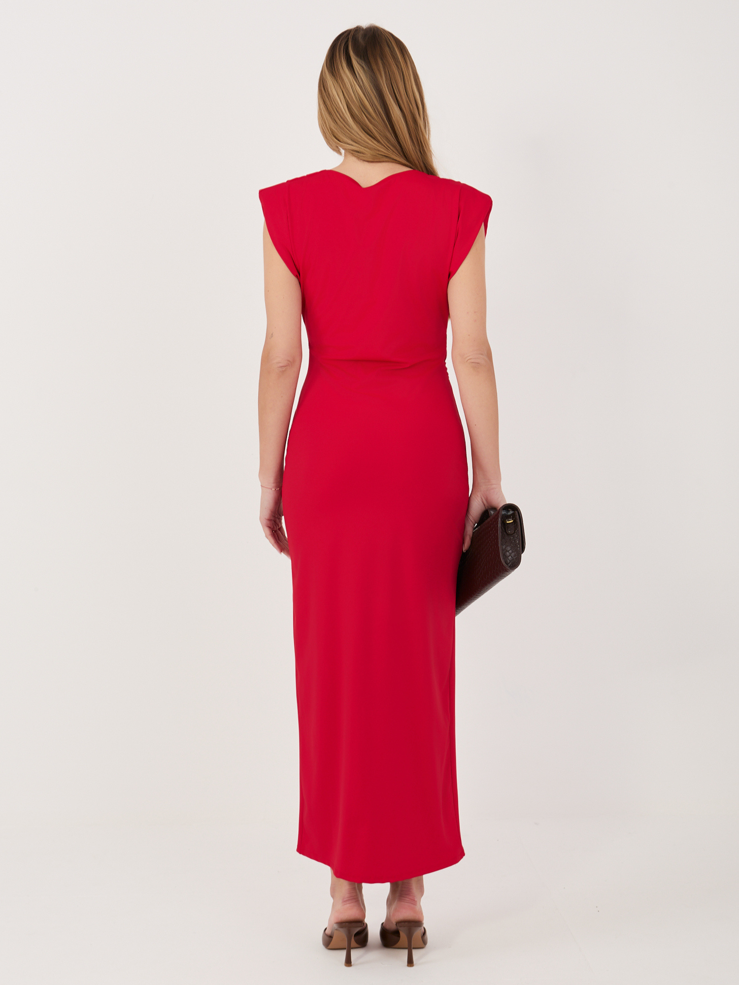 Czerwona midi sukienka z kopertowym dekoltem RUE PARIS .