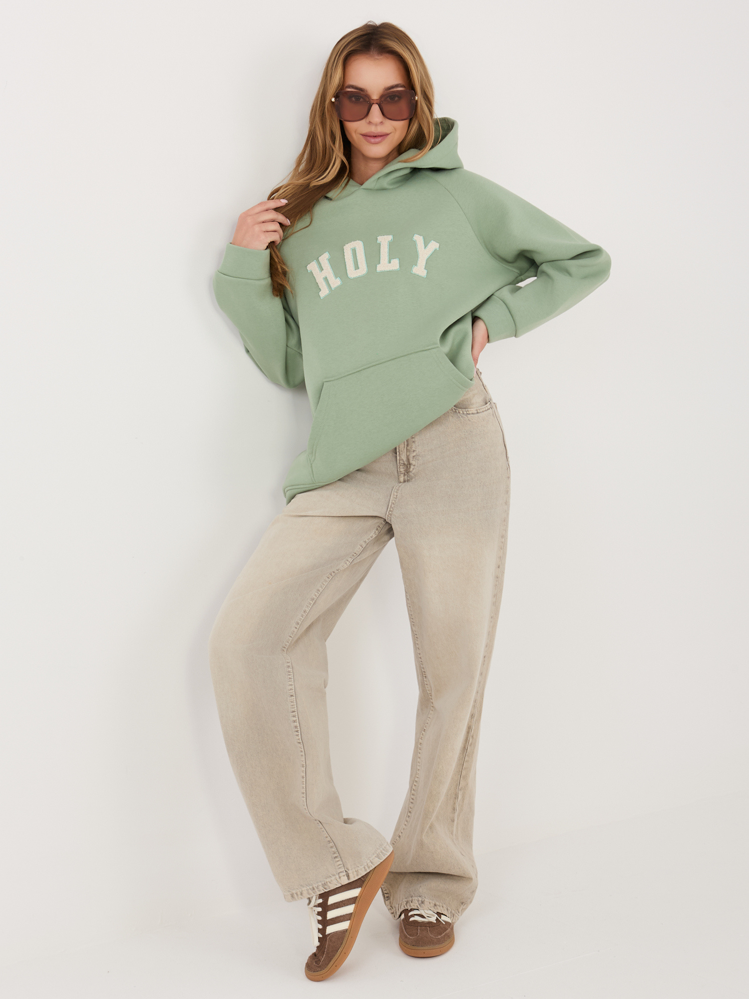 Pistacjowa damska bluza z wypukłym napisem RUE PARIS .