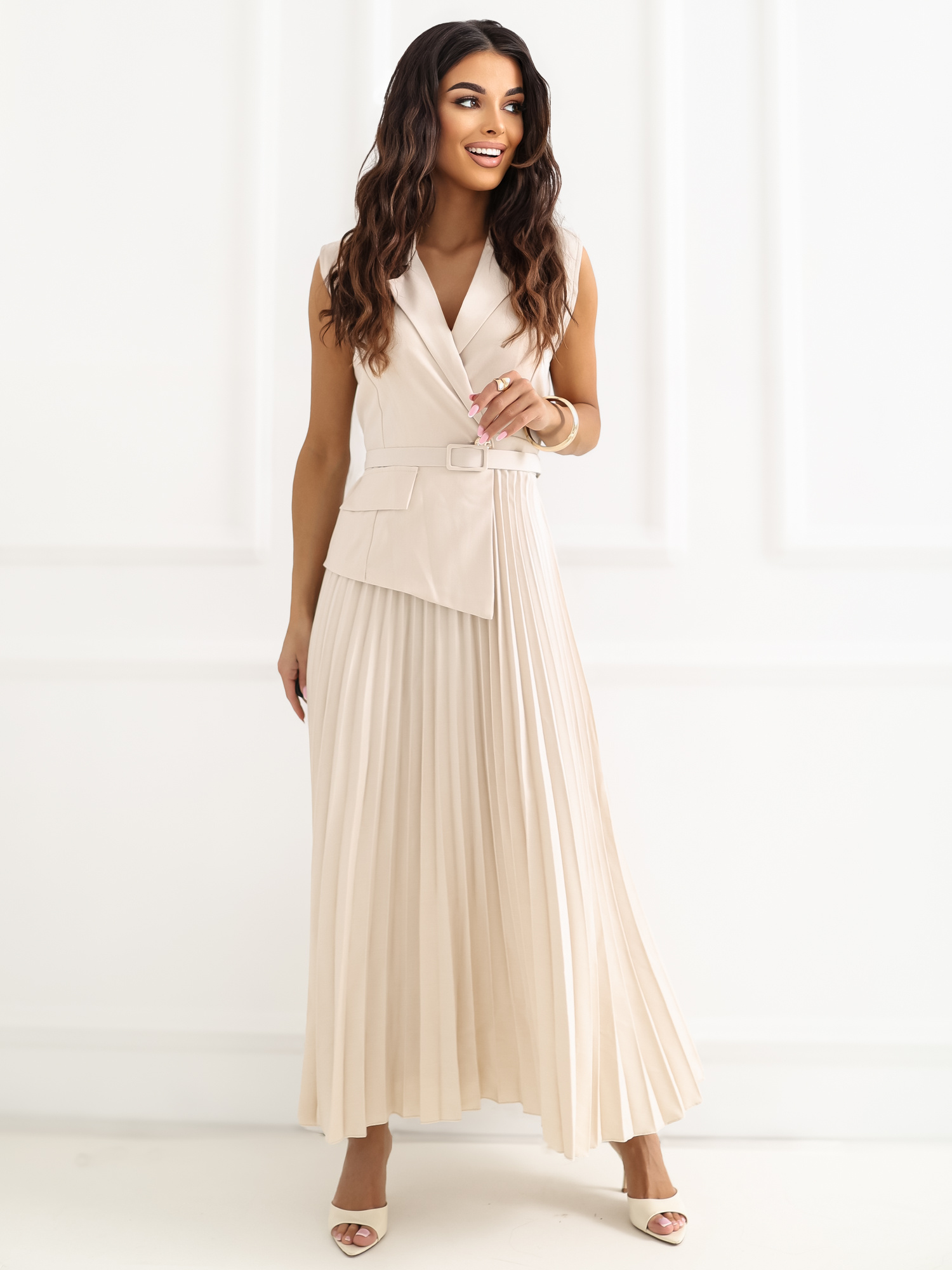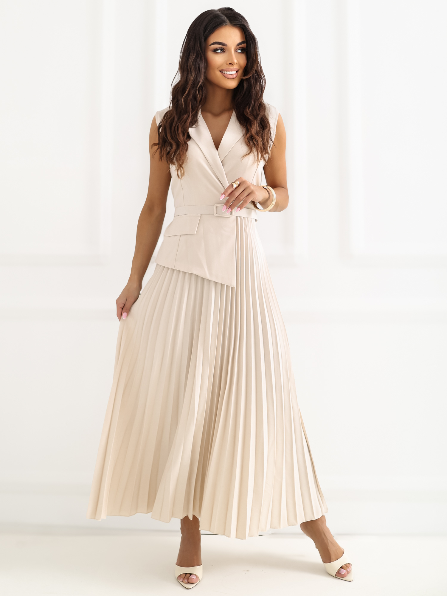Jasnobeżowa elegancka sukienka z paskiem RUE PARIS .