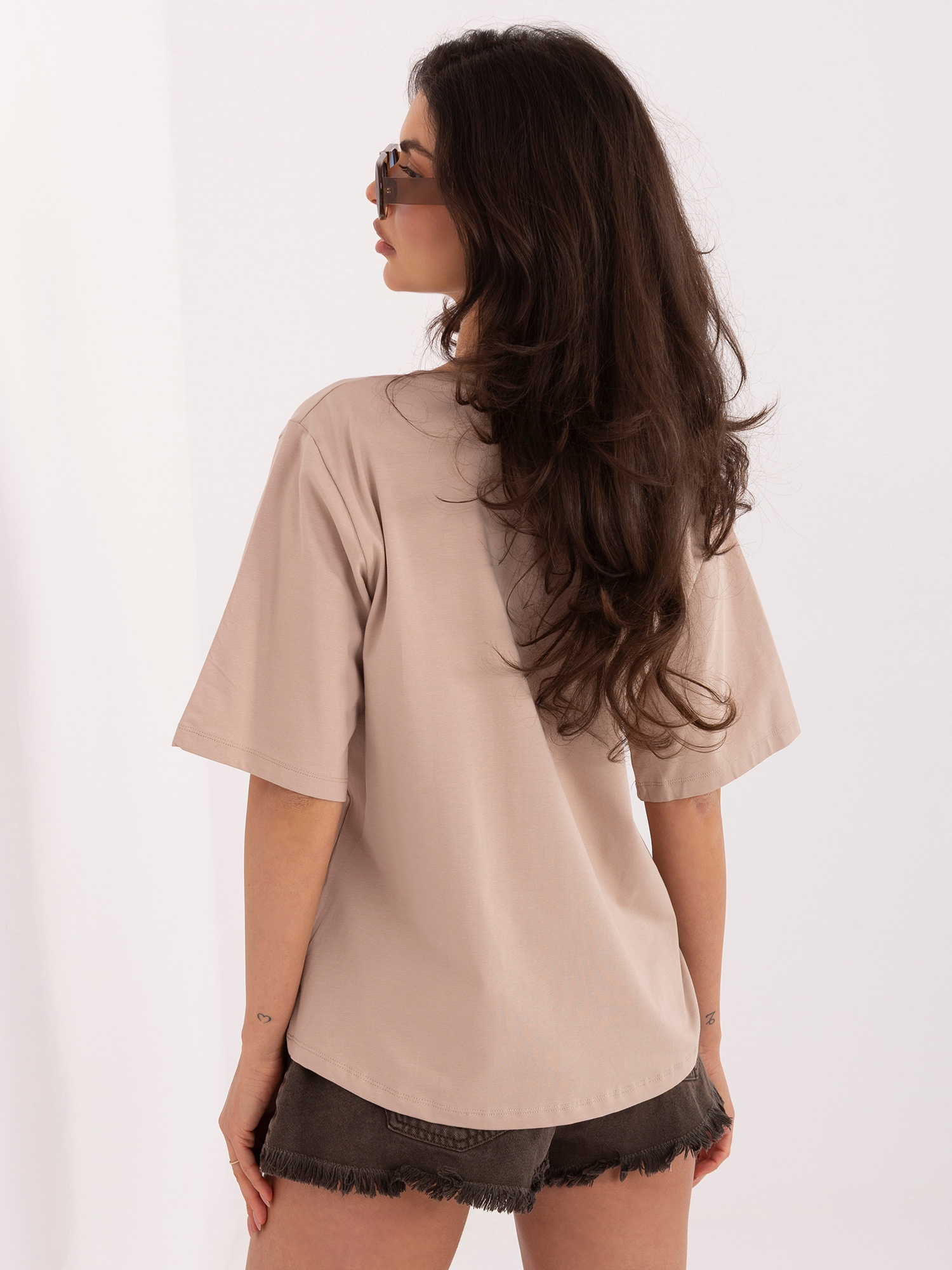 Ciemnobeżowy bawełniany t-shirt z dekoltem V RUE PARIS .