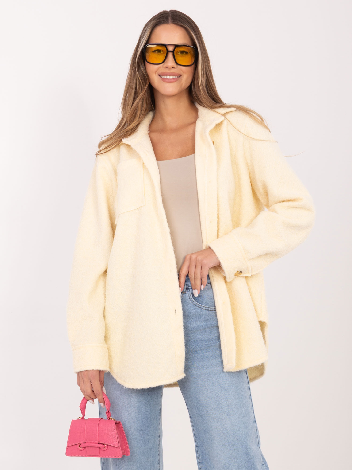 Maślana żółta koszulowa kurtka z kieszeniami .