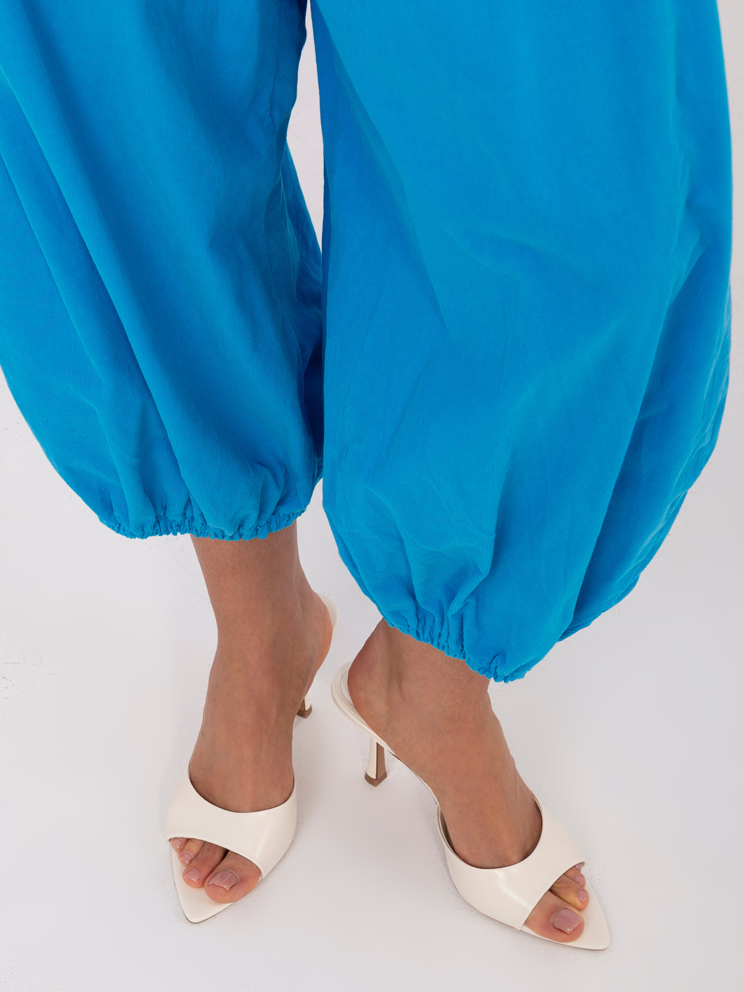 Niebieskie sztruksowe spodnie parachute z nogawką 7/8