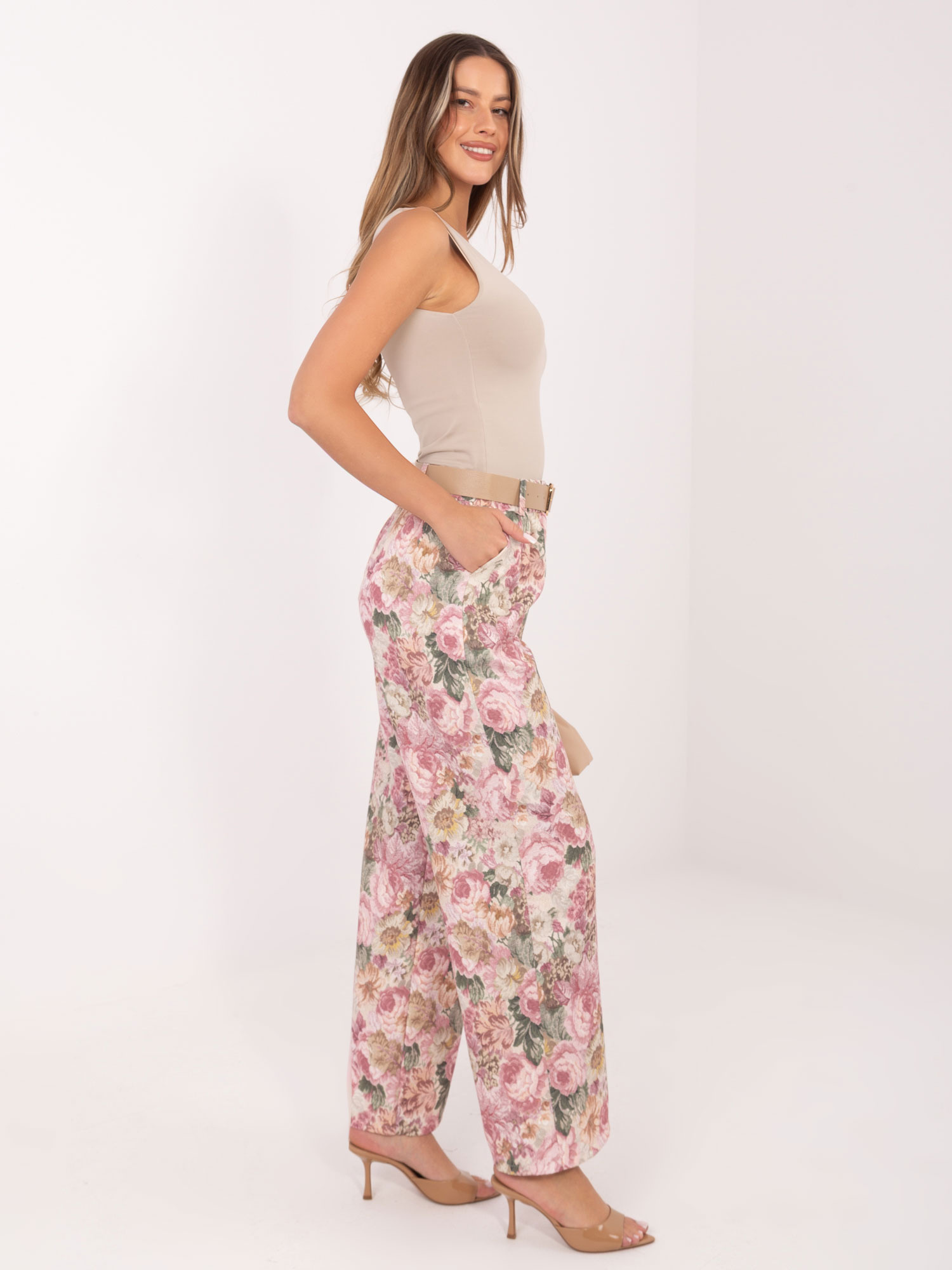 Brudnoróżowe garniturowe spodnie w kwiaty RUE PARIS .