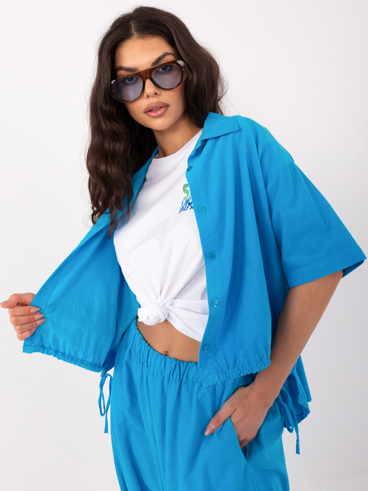 Niebieska sztruksowa koszula z krótkim rękawem .
