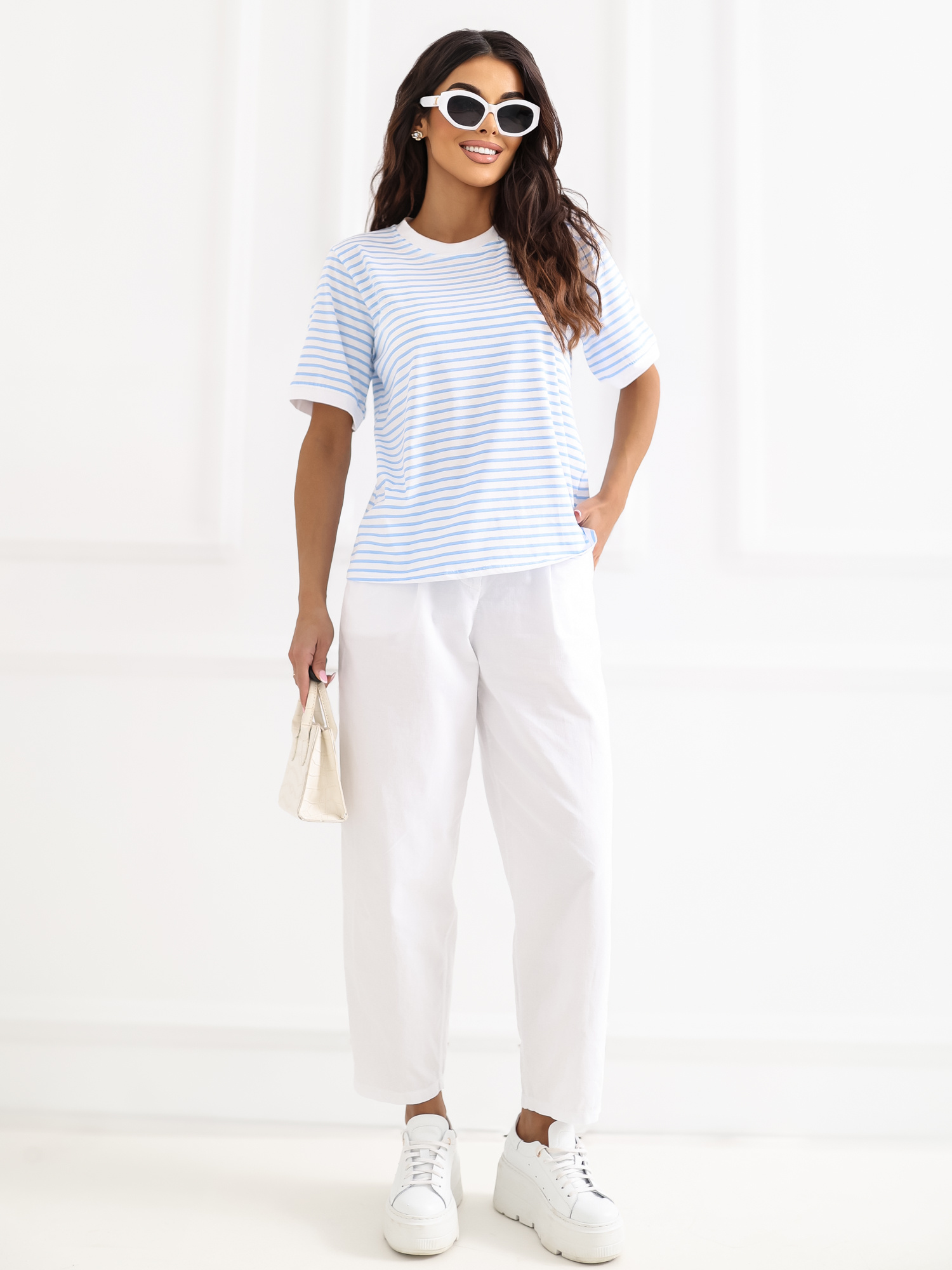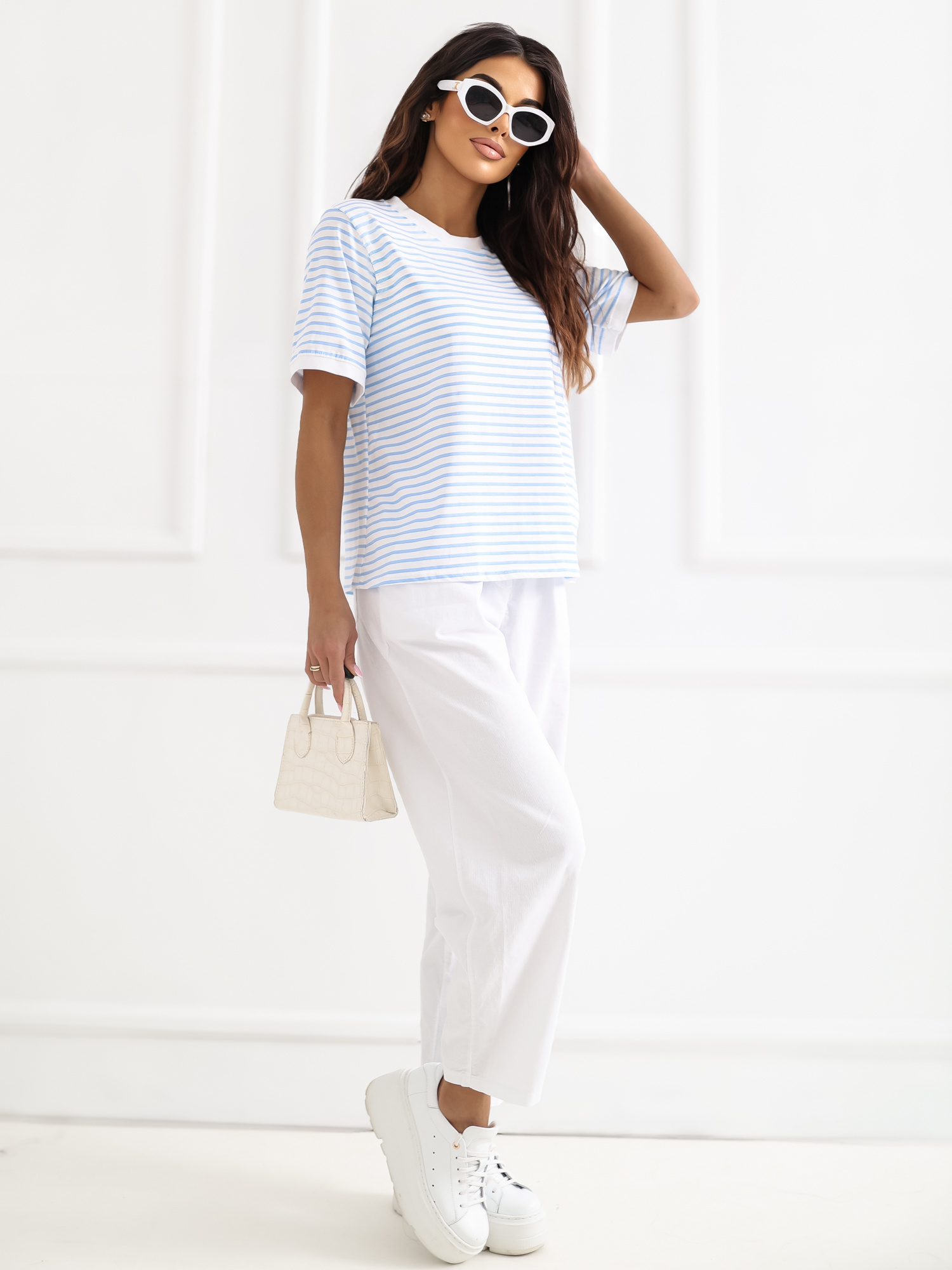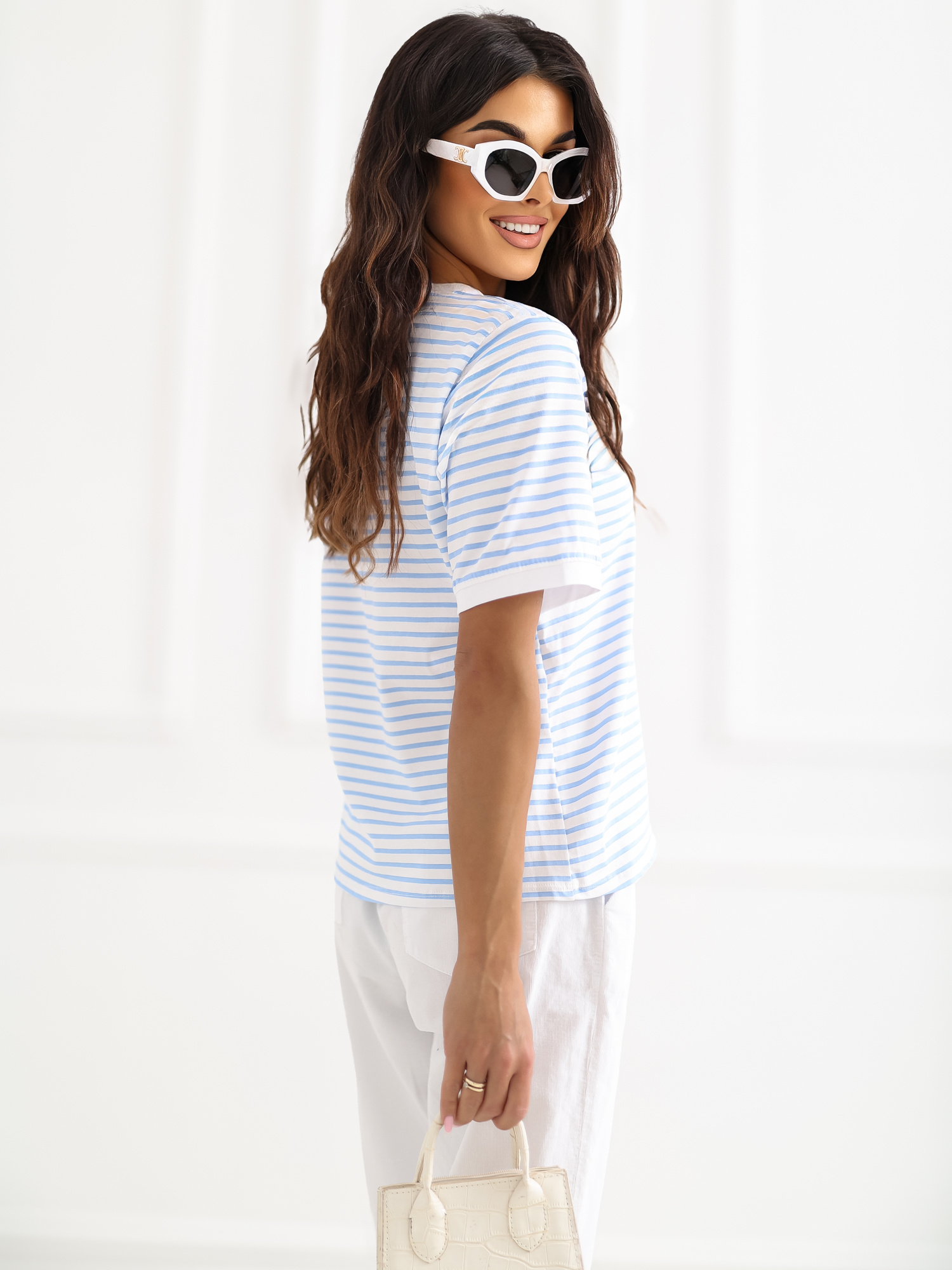 Biało-jasnoniebieski damski t-shirt z bawełny RUE PARIS .