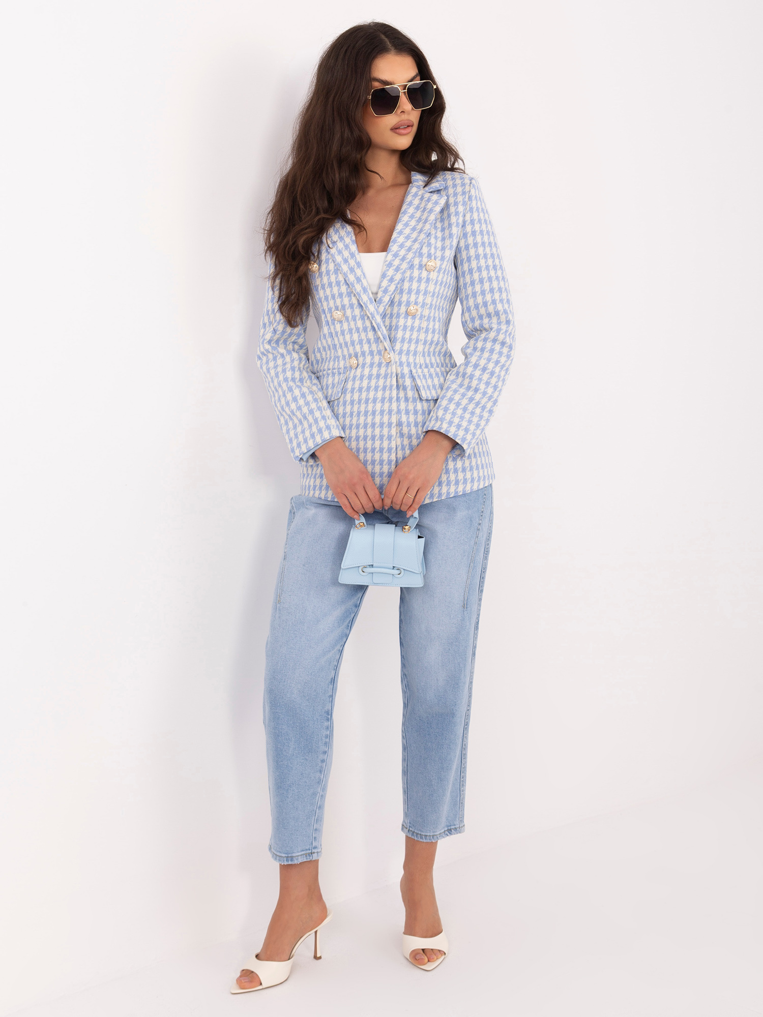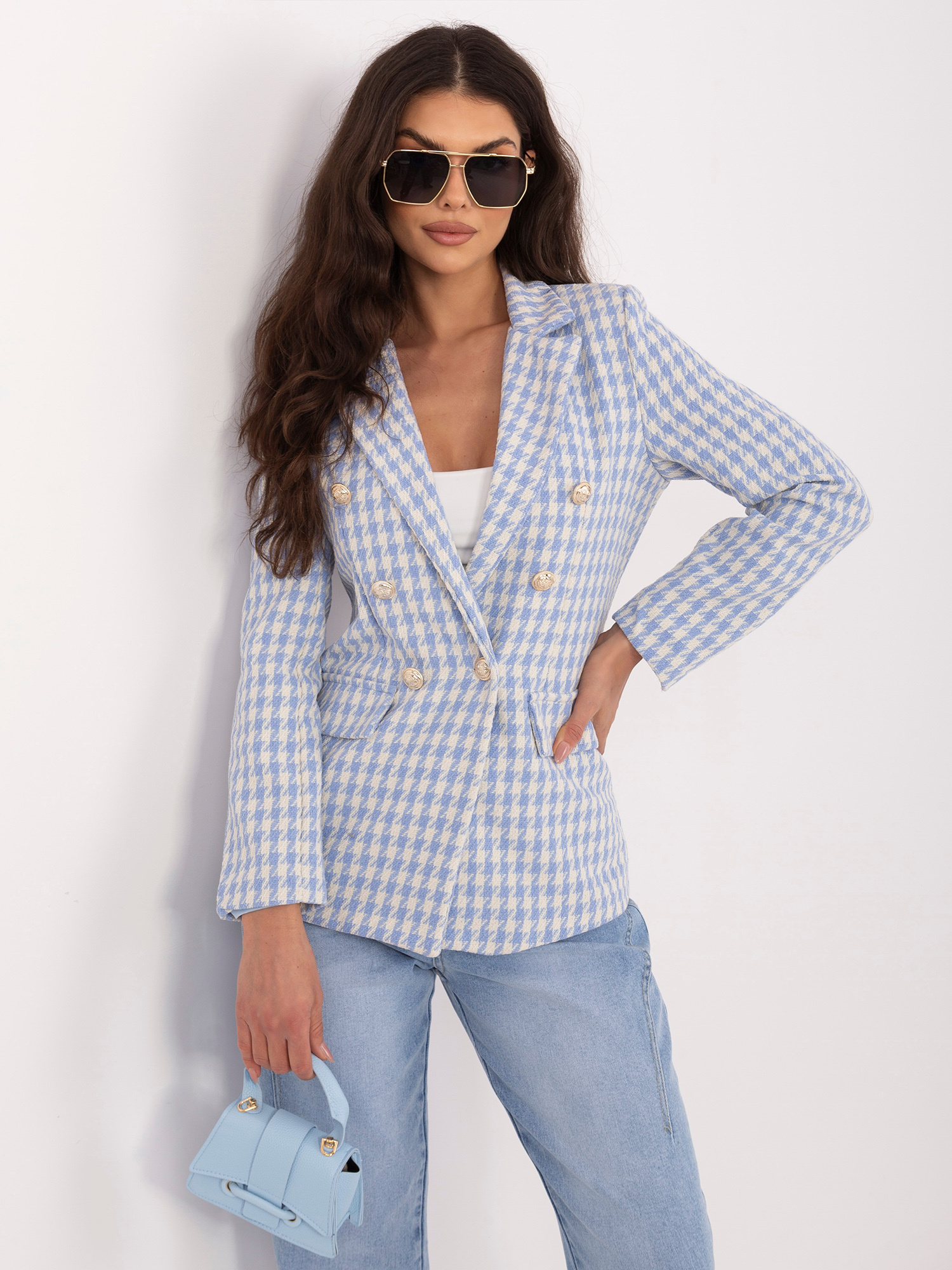 Niebieska tweedowa marynarka z dwurzędowym zapięciem
