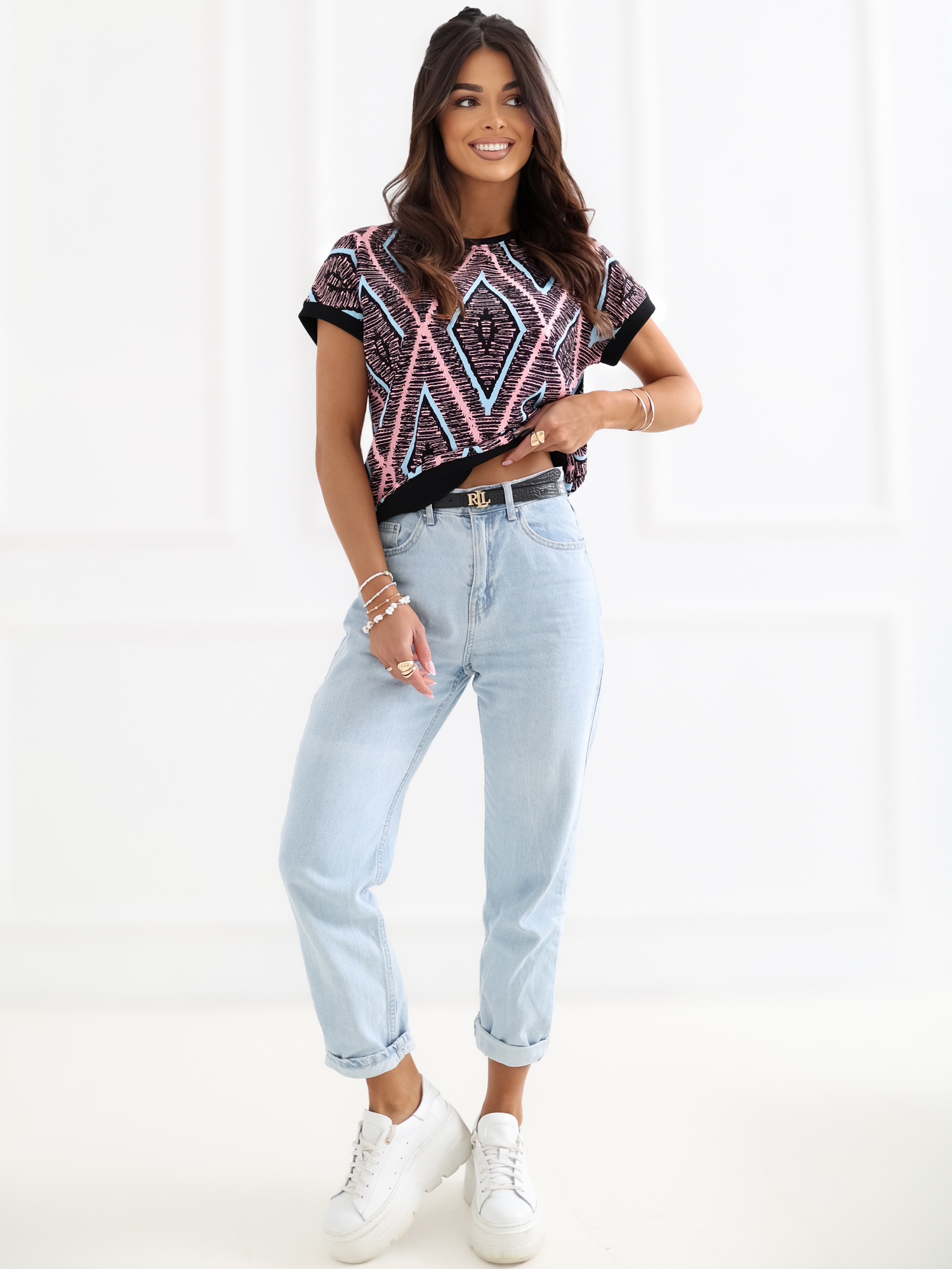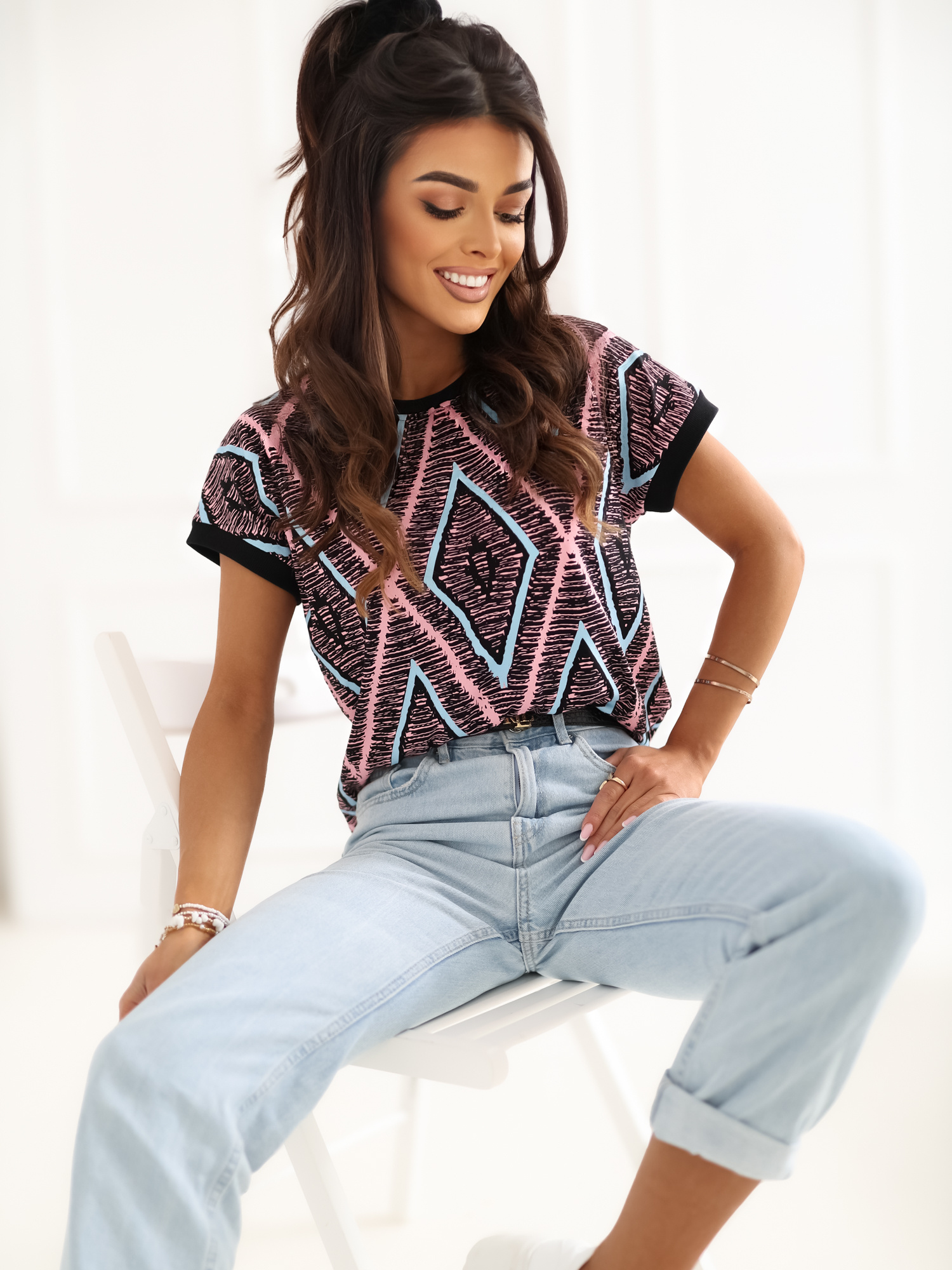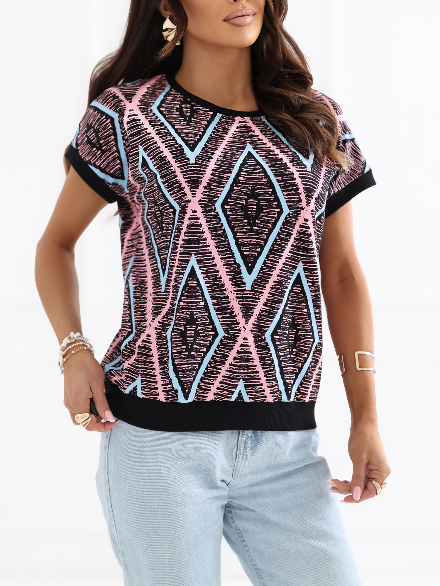 Czarna damska bluzka w geometryczny wzór .