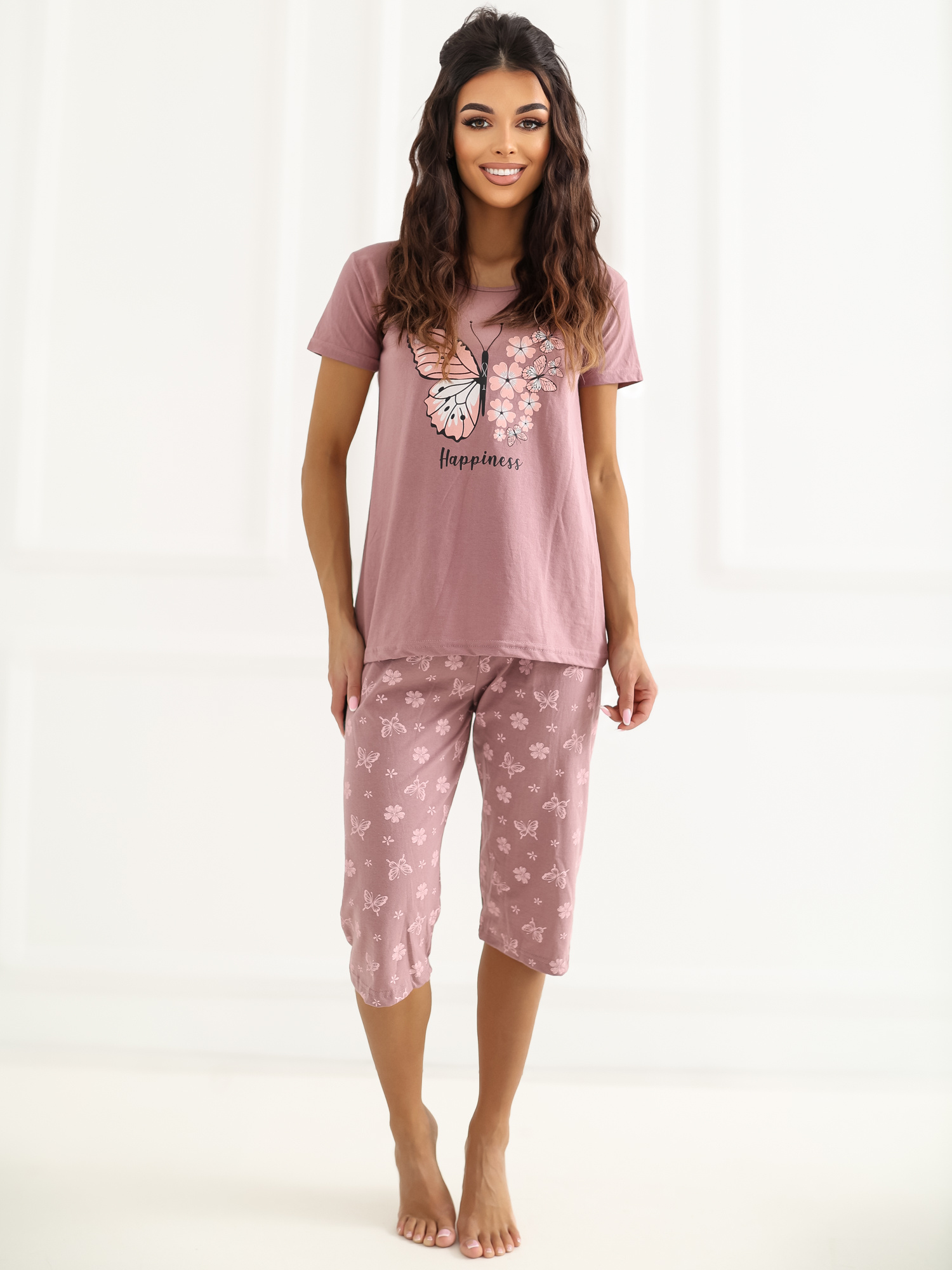 Brudnoróżowa dwuczęściowa piżama w motyle