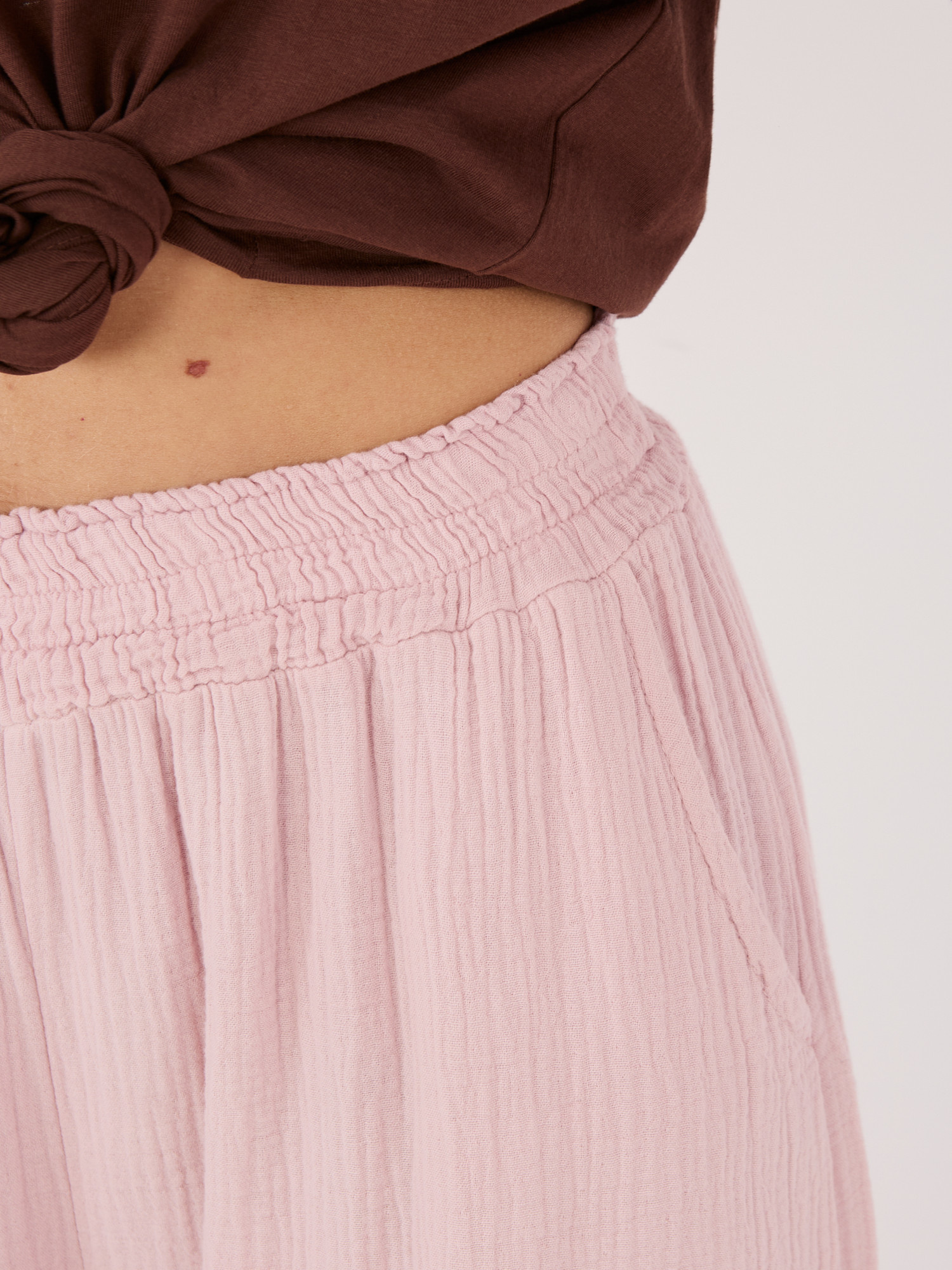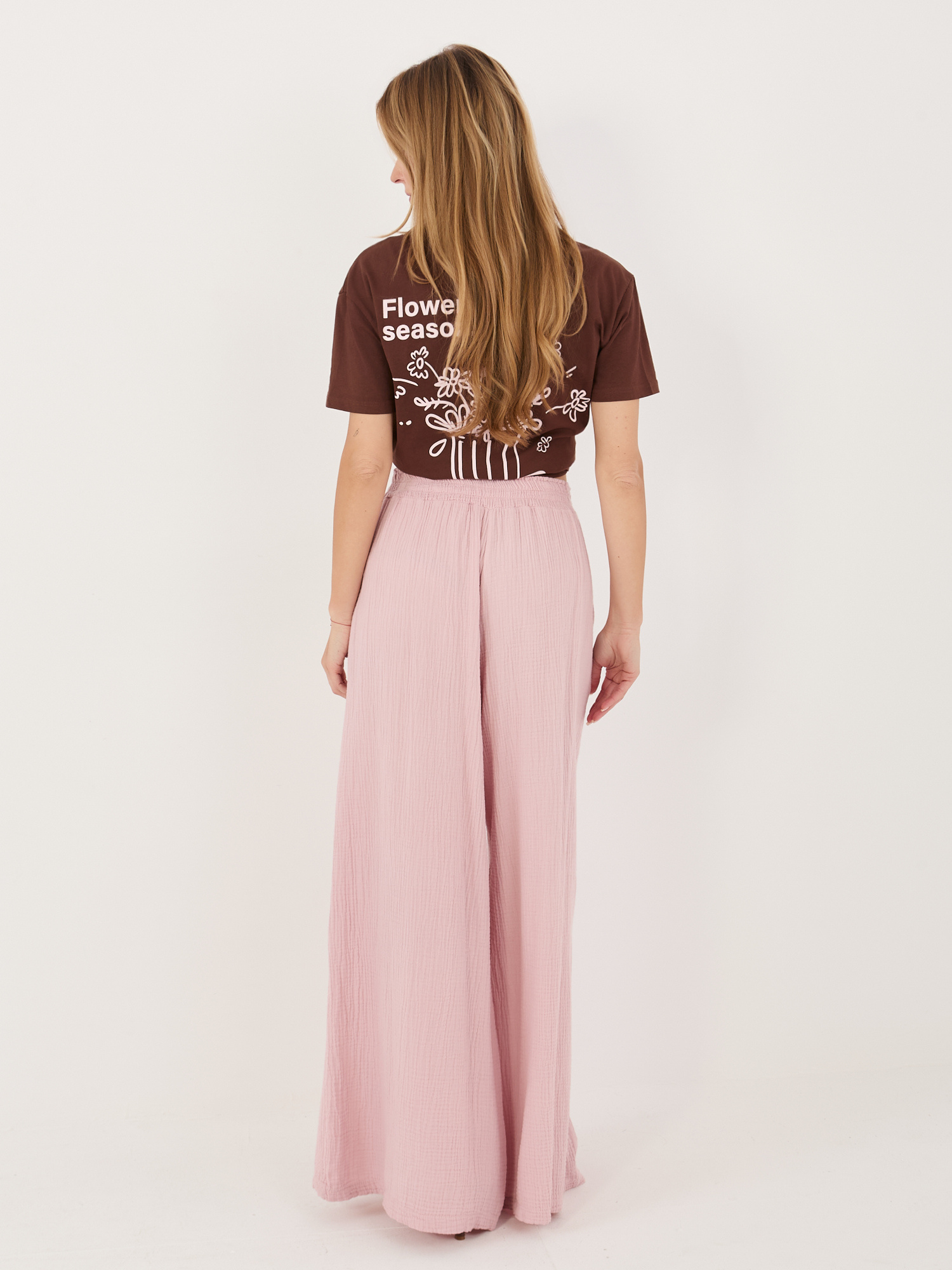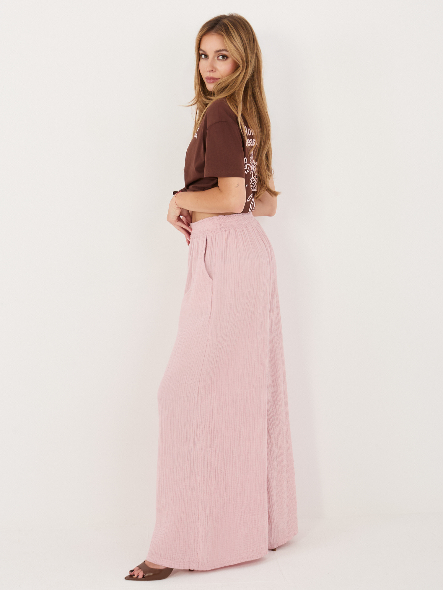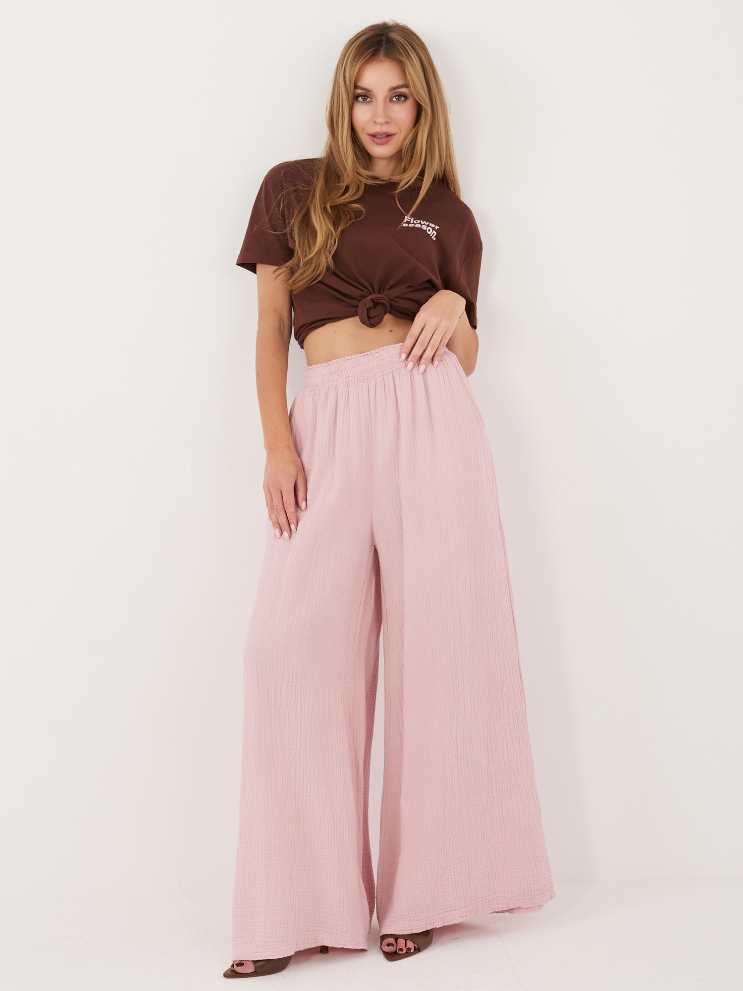 Opinie o Jasnoróżowe muślinowe spodnie palazzo