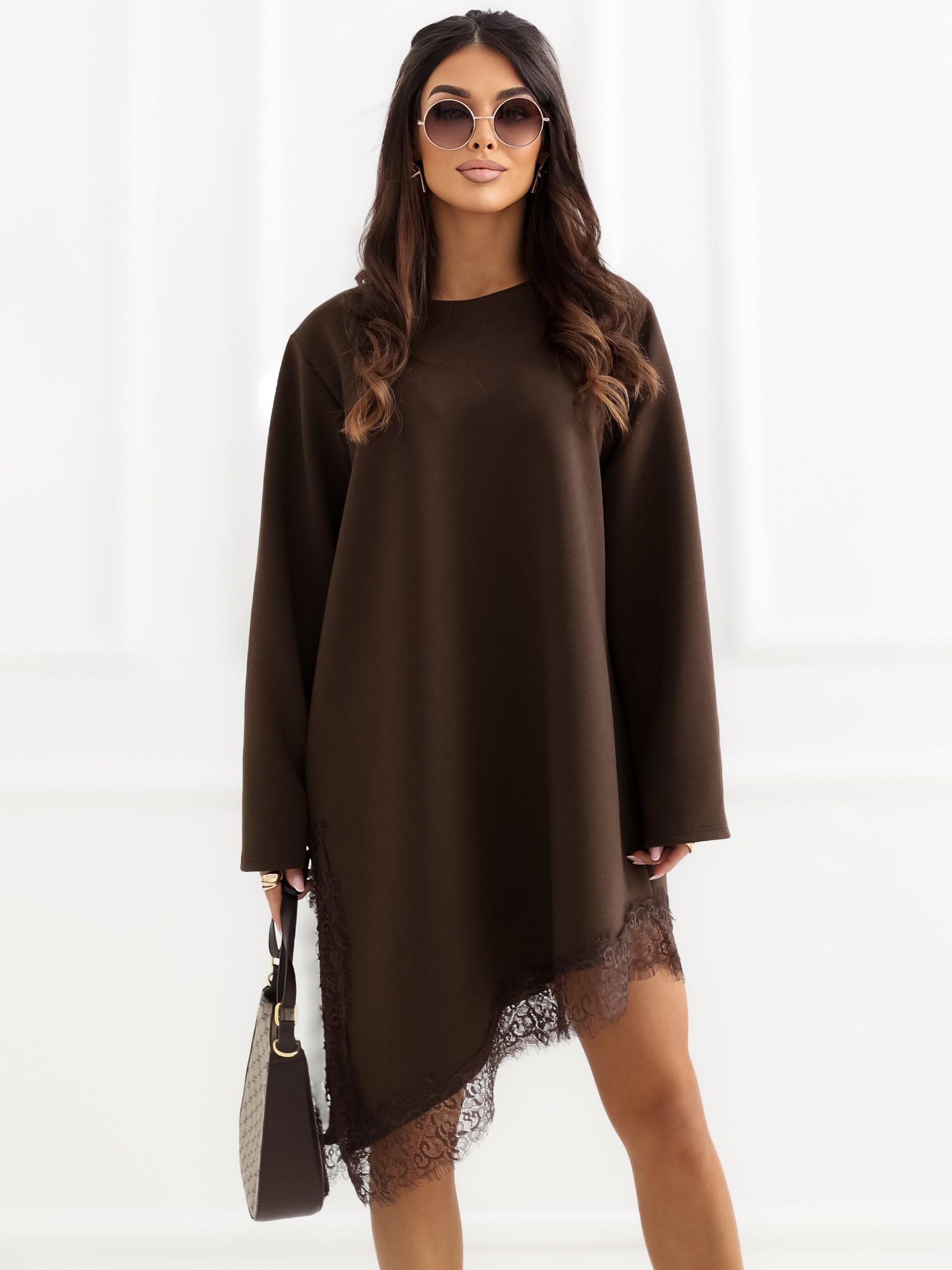Czekoladowa damska sukienka oversize z koronką OCH BELLA .
