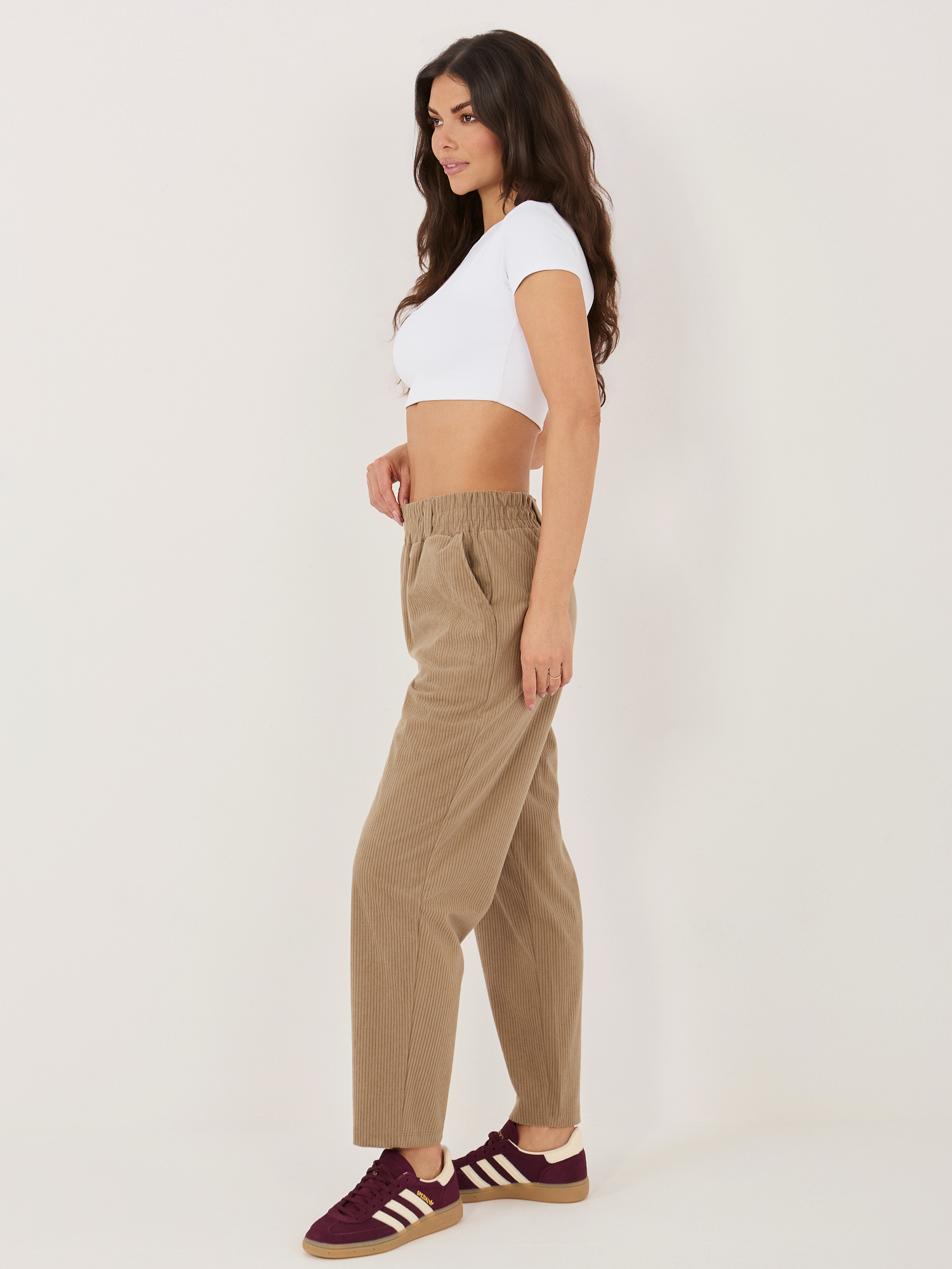 Ciemnobeżowe sztruksowe spodnie bez zapięcia RUE PARIS .