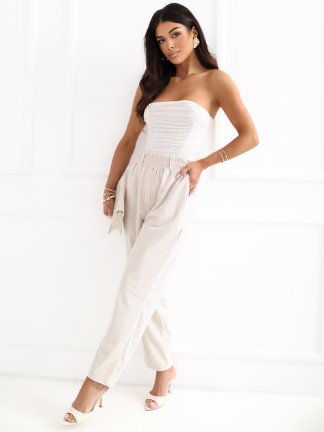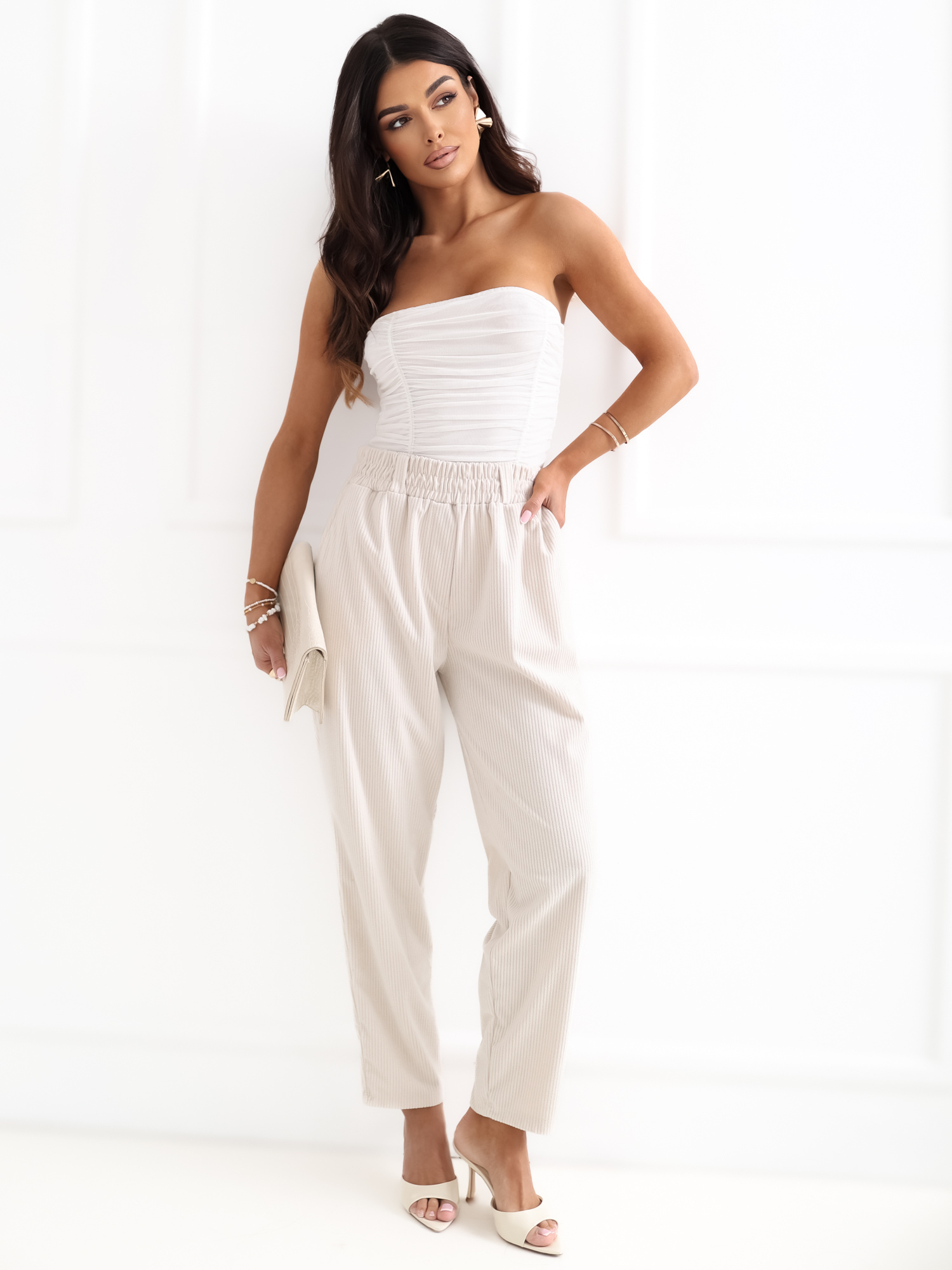Jasnobeżowe sztruksowe spodnie z kieszeniami RUE PARIS .