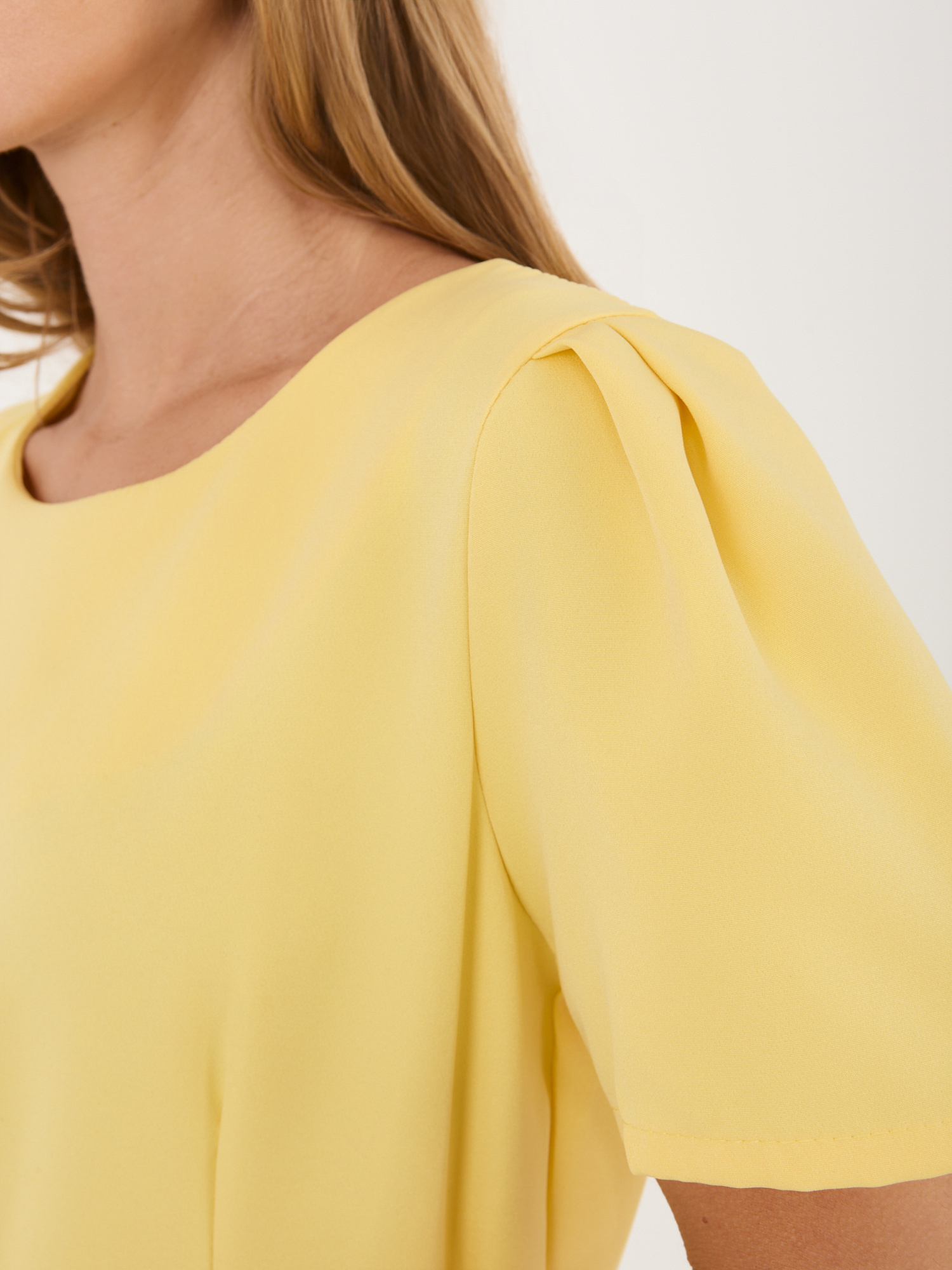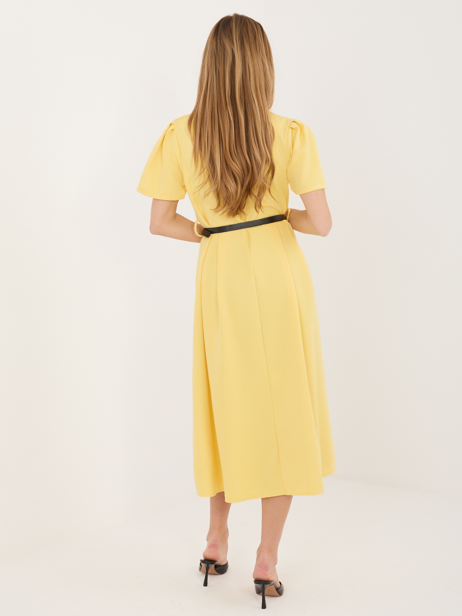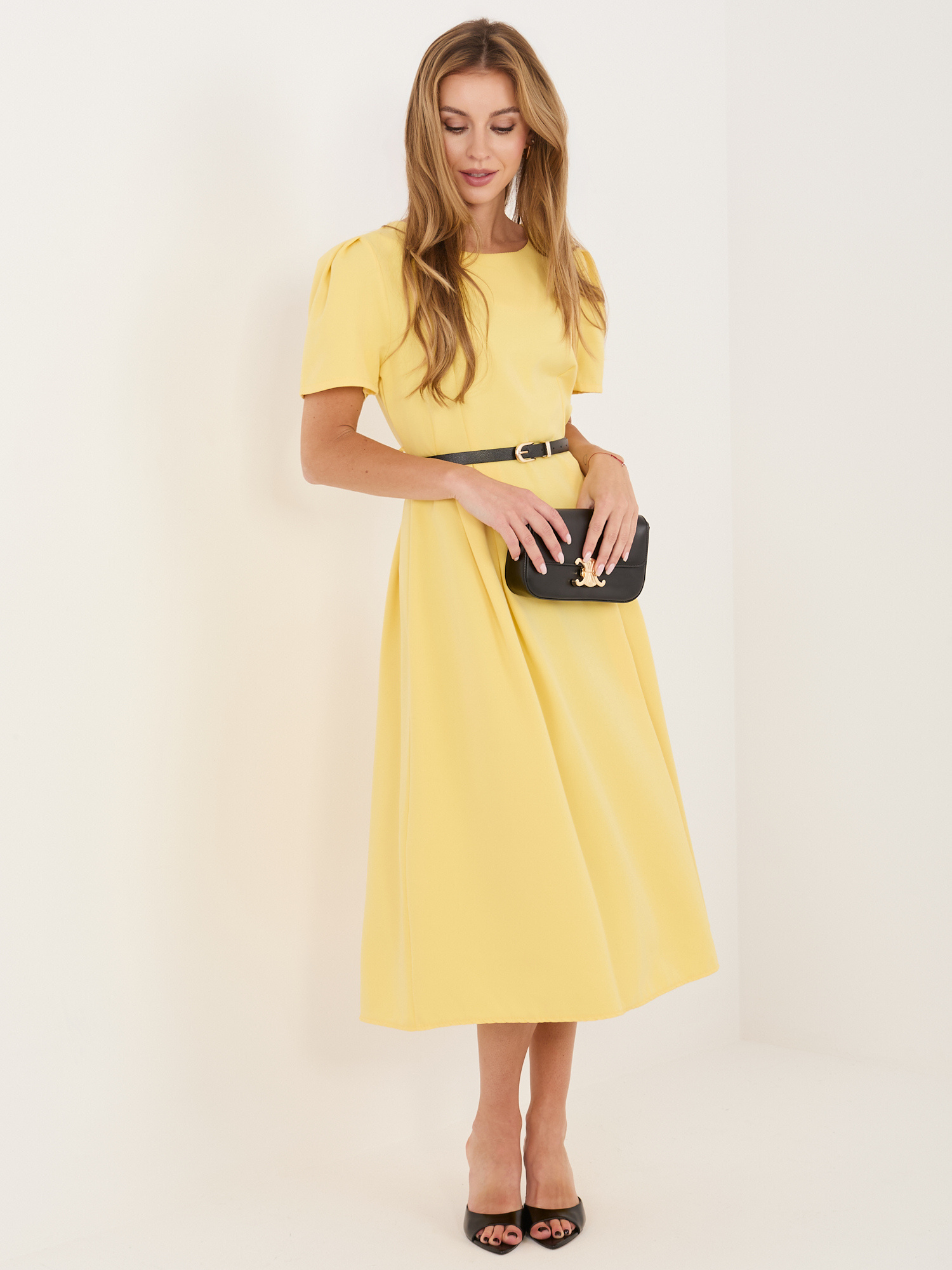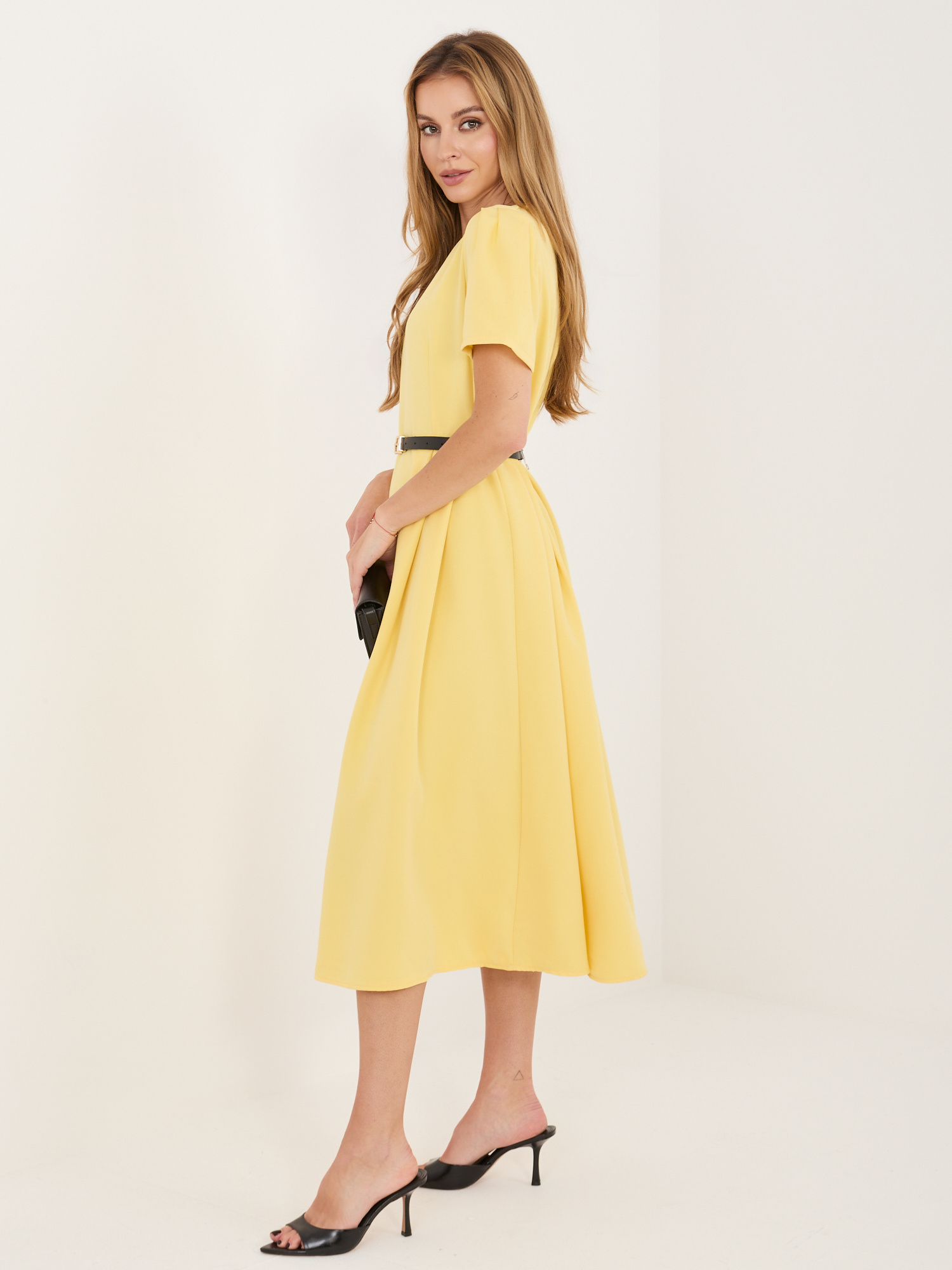 Żółta rozkloszowana sukienka z paskiem .