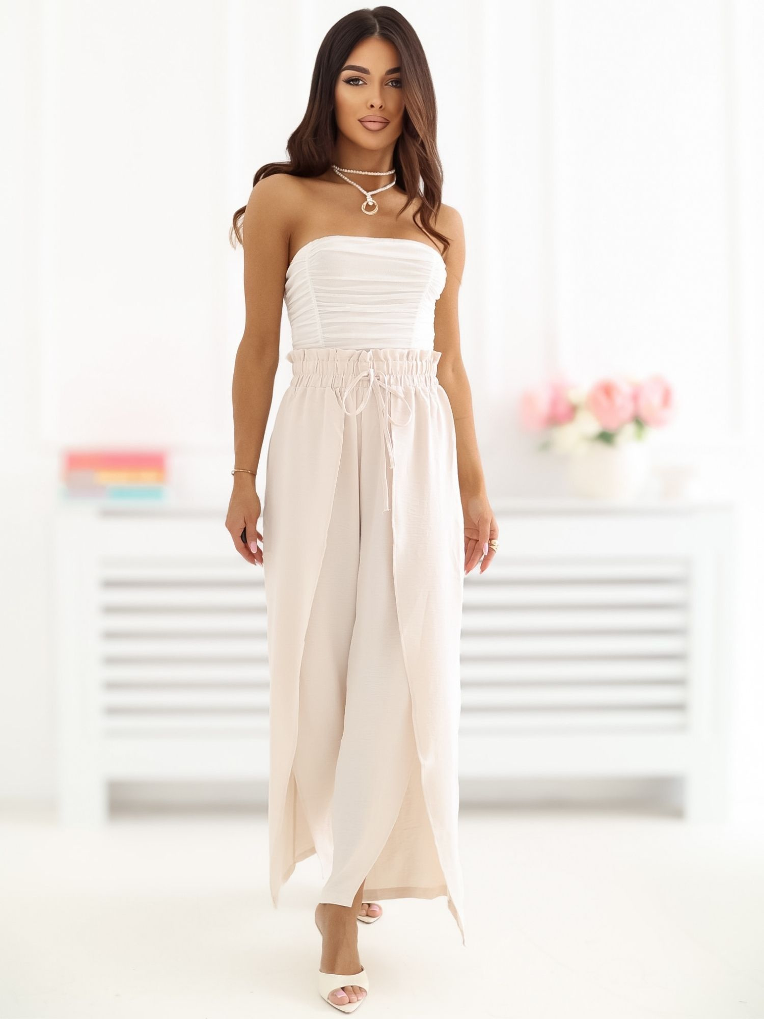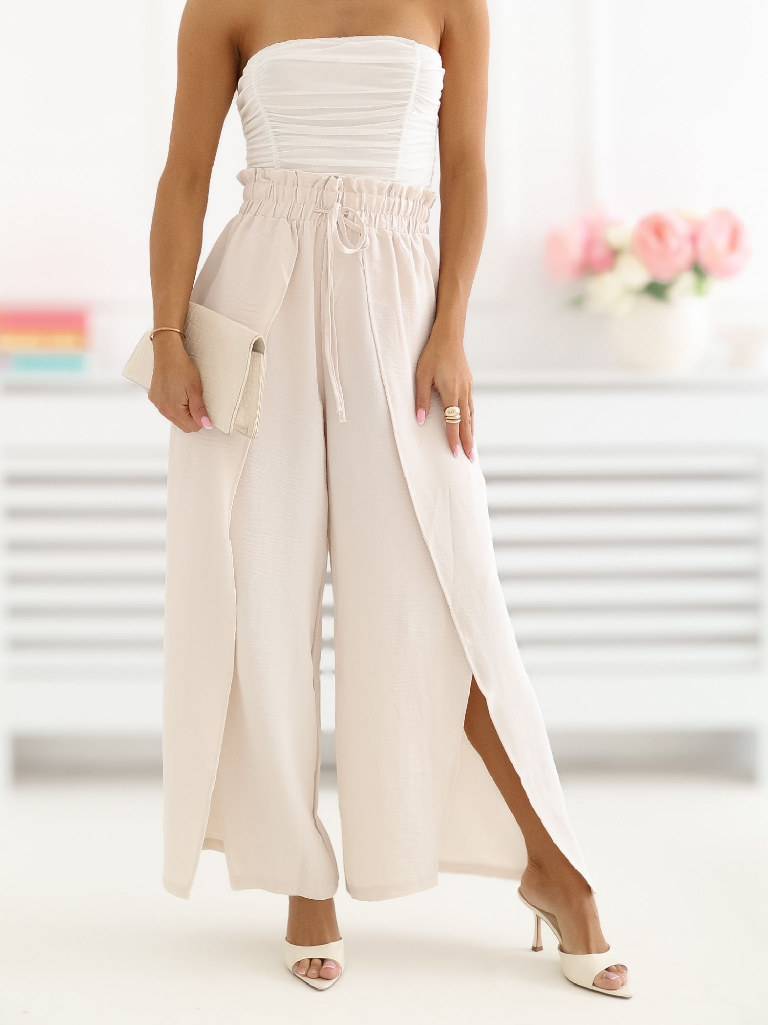 Jasnobeżowe letnie spodnie z talią paperbag
