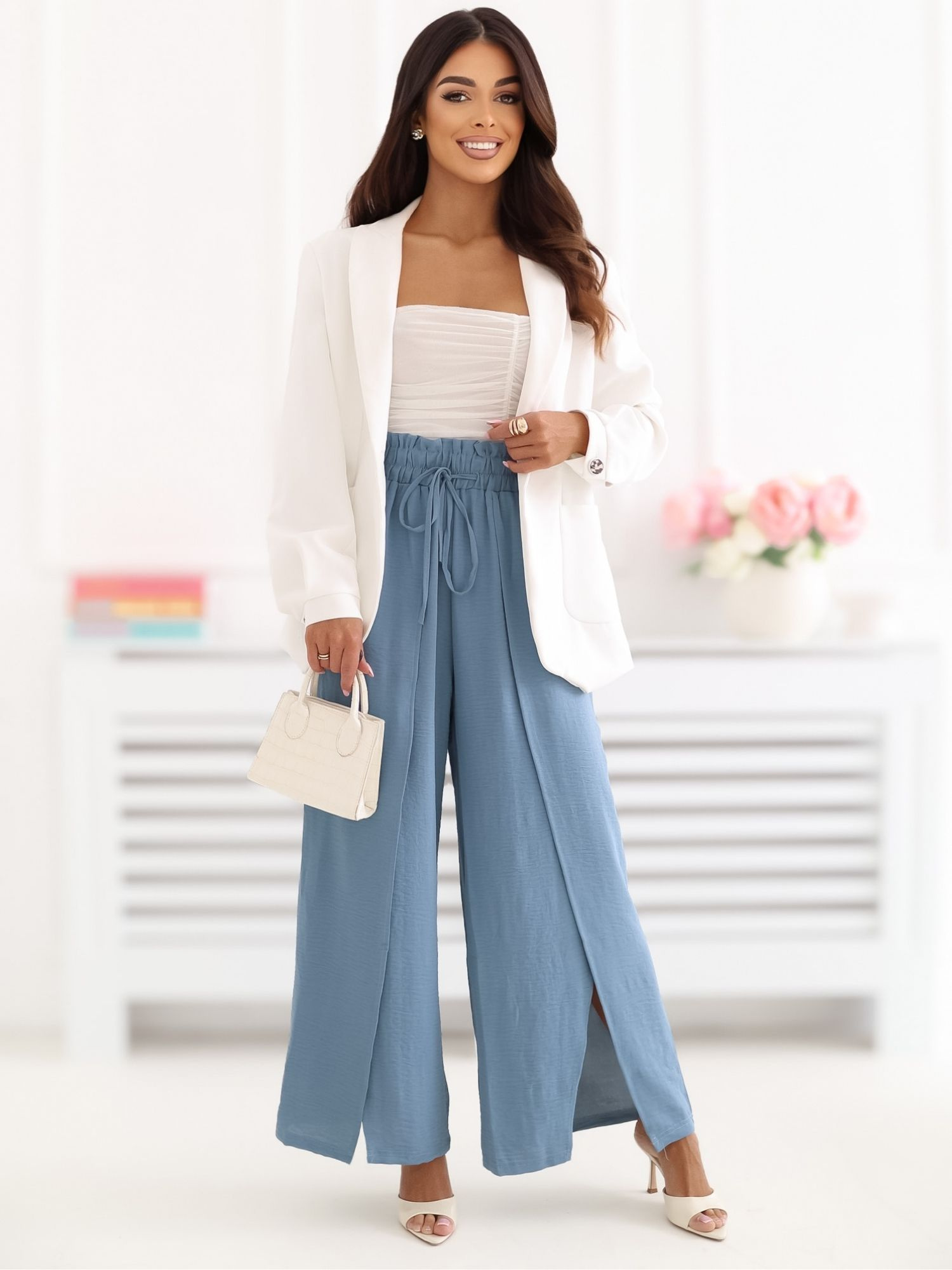 Ciemnoniebieskie spodnie wide leg z rozcięciami