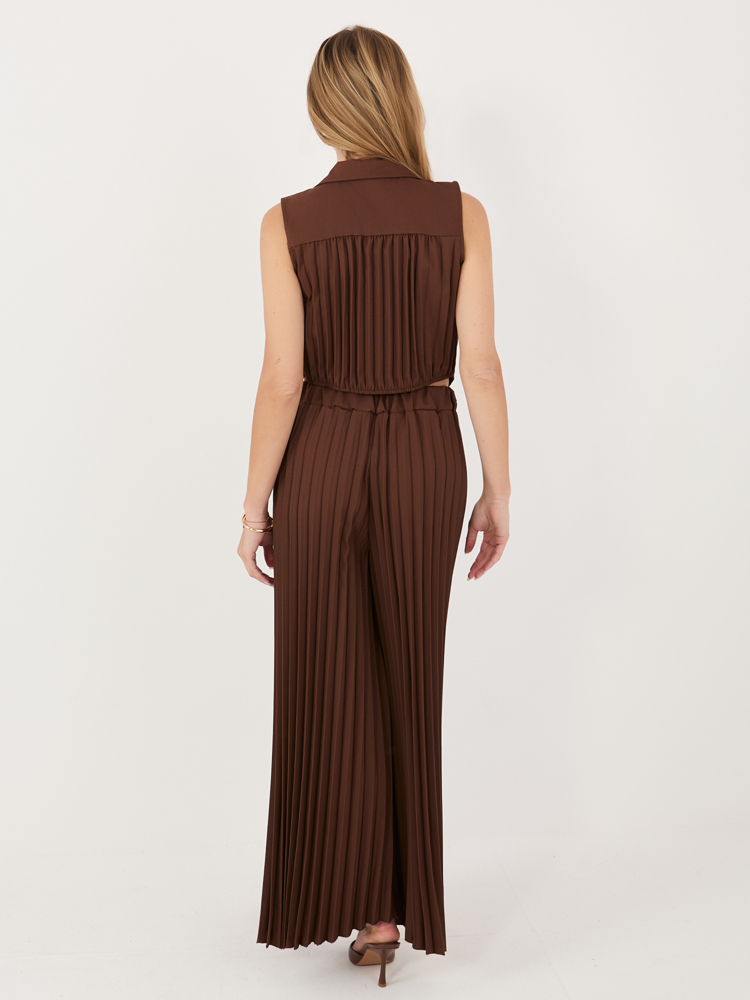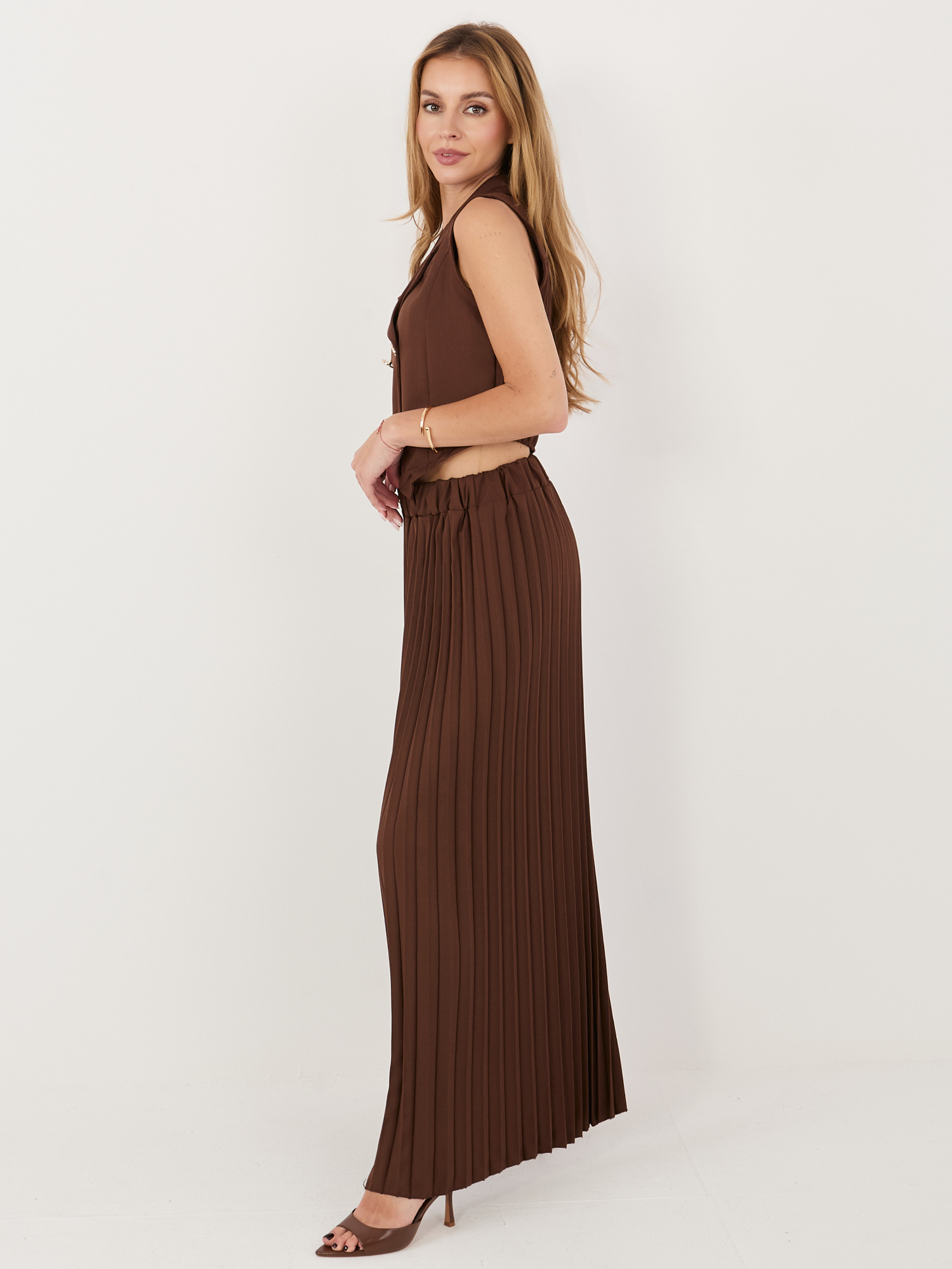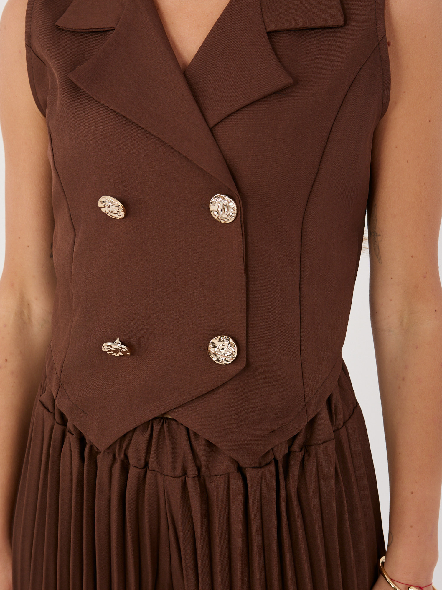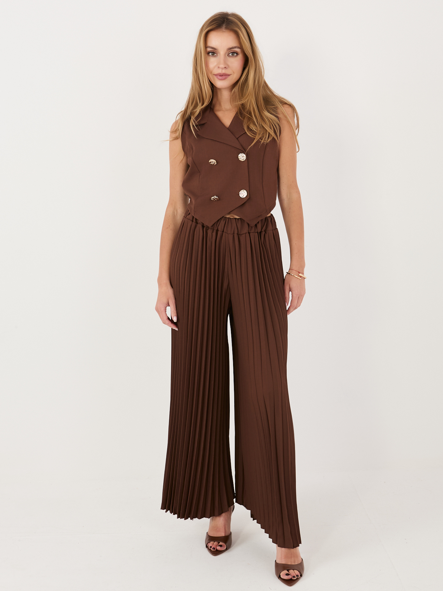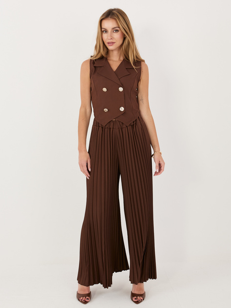 Czekoladowy damski garnitur z dwurzędową kamizelką