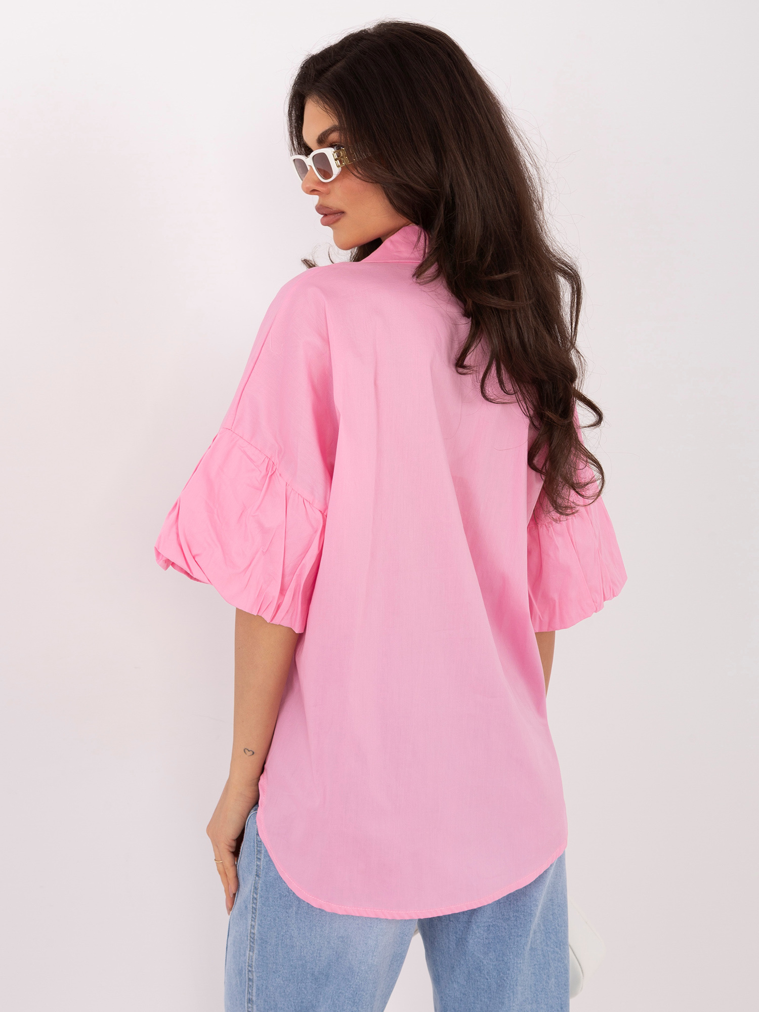 Różowa damska koszula z falbankami przy rękawach .