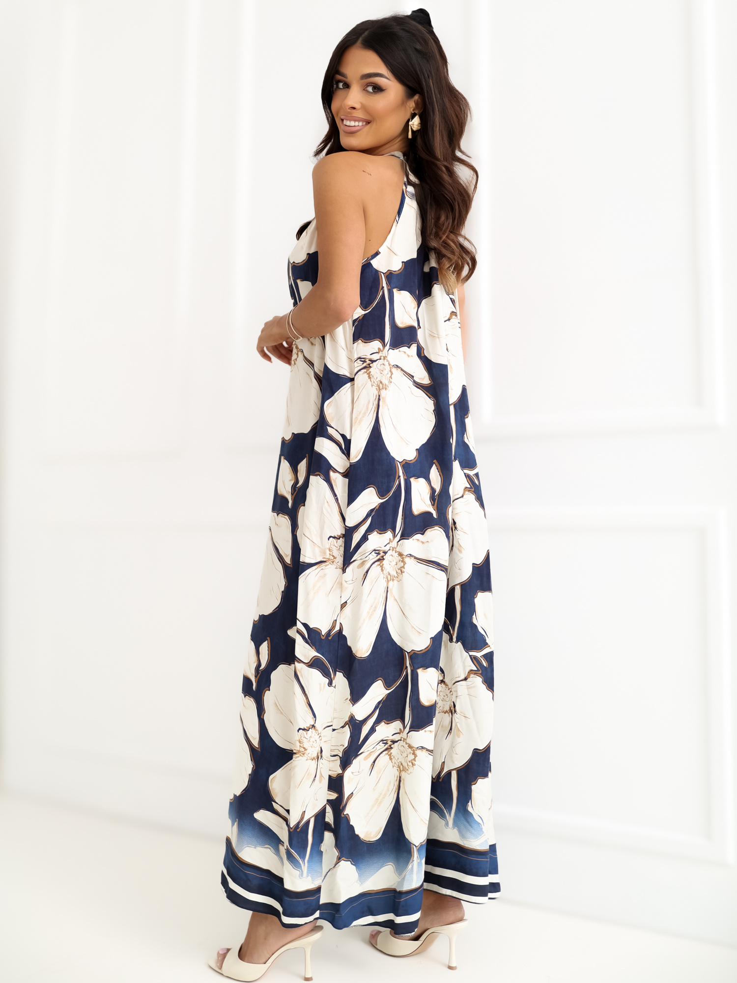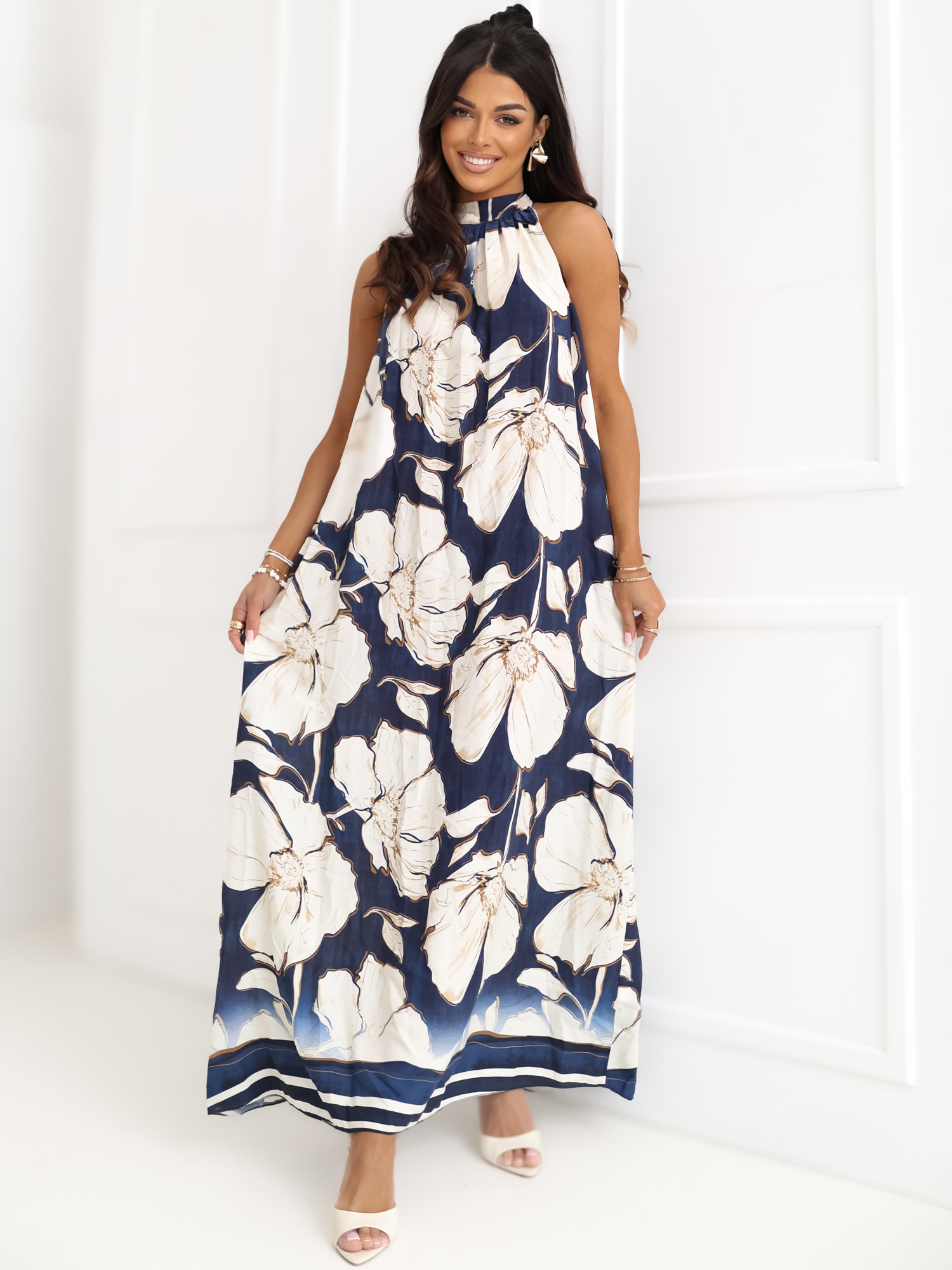 Granatowa trapezowa sukienka w kwiaty